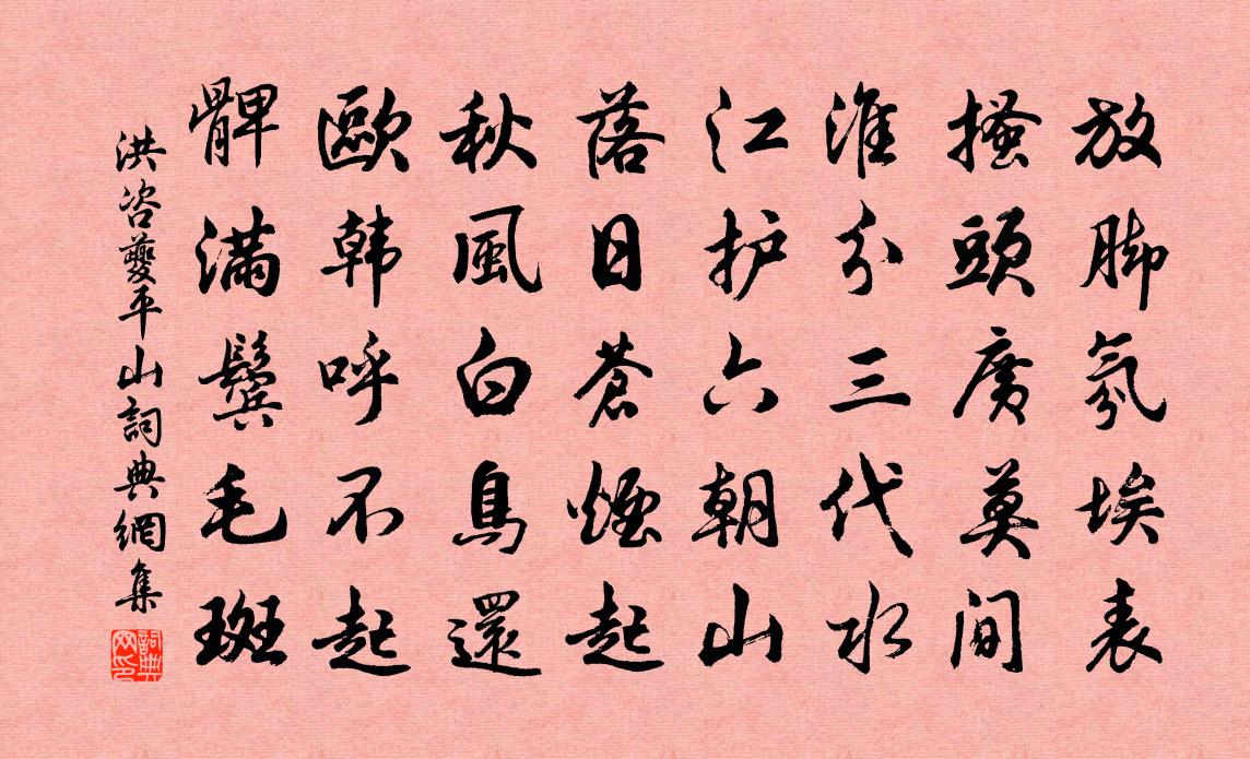 詩詞名句歷史字典書法欣賞書法字典國語詞典說文解字康熙字典古漢語字典標 題 作 者 詩 句 平山作者:洪咨夔 朝代:宋代平山原文放腳氛埃表,搔頭廣莫間。淮分三代水,江護六朝山。落日蒼煙起,秋風白鳥還。歐韓呼不起,髀滿鬢毛斑。詩詞問答問:平山的作者是誰?答:洪咨夔問:平山寫於哪個朝代?答:宋代洪咨夔平山書法欣賞平山書法作品詩詞推薦浴蠶沙溪水一首為上饒陳烈婦作戴表元〔宋代〕浴蠶沙溪水,採桑玉山巔。絲成白稜稜,膠作烈婦弦。烈婦何所言,弦中意 * 。一說鸞影孤,二訴雛巢穿。巢穿荷花楊公遠〔宋代〕竹邊窗外小池塘,青蓋亭亭擁靚妝。莫把仙娥相比擬,合將君子為平章。凋時堪供真人艇,老去猶充楚客裳。幾夜己卯歲值凍阻歸有作齊己〔唐代〕河冰連地凍,朔氣壓春寒。開戶思歸遠,出門移步難。湖雲黏雁重,廟樹颳風乾。坐看孤燈焰,微微向曉殘。鄠杜馬上念漢書(一雲五陵懷古)李商隱〔唐代〕世上蒼龍種,人間武帝孫。小來惟射獵,興罷得乾坤。渭水天開苑,鹹陽地獻原。英靈殊未已,丁傅漸華軒。曉泊丹陽館楊萬里〔宋代〕夕凍朝還積,寒曦暖未多。霜輕猶著草,冰重亦浮河。山盡酣余勢,潮歸殿去波。六朝遺蹟在,故老尚傅麽。感春三首張耒〔宋代〕午日步西園,繁花亂相照。夭夭海棠枝,顧我如欲笑。殷紅點輕素,含吐皆窈窕。持贈東鄰子,願言論久要。送徐鼎夫用廬陵通守博士戴文韻劉克莊〔宋代〕一春風雨郡齋寒,荒了 * 老子壇。吏抱文書排闥至,客攜詩卷退衙看。愁來鏡里絲難梁,老去胸中錦已殘。若棹偈頌十八首釋道璨〔宋代〕秋深夜長,露寒月皎。鐘聲短底短長底長,蟲聲大底小底小。山僧聞昨,展轉反側,不寐到曉。一片祖師心,狼藉酬王督賢良松泉二詩其一泉王安石〔宋代〕宋興古剎今長乾,靈曜喜殿荒檀欒。二泉相望棄不渫,西泉尚絫三石盤。其流散漫為沮洳,稍集小礫生微瀾。車泉柳梢青韓奕〔元代〕過了清明。江□郭外,雲淡煙輕。幾家台沼,萍蕪自綠,殘柳還青。何人樓外吹笙。彷佛□、梨園舊聲。喚起閒愁嘆老陸游〔宋代〕朋儕什九墮丘墟,自笑身如脫綱魚。委命已悲吾道喪,垂名真負此心初。齒殘僅可決濡肉,眼澀知難讀細書。家事謝師恩 答皇親見召王處一〔元代〕三冬凜冽彤雲布。六出飄飛絮。地凍天寒難進步。滿途冰雪,喚回童稚,且向茅庵住。貴州大醮無推訴。必要功圓石虎禮佛圖劉克莊〔宋代〕一虎雖凶暴,其尊孔釋同。矯情饋夫子,合爪禮澄公。漢武帝將候西王母下降曹唐〔唐代〕崑崙凝想最高峰,王母來乘五色龍。歌聽紫鸞猶縹緲,語來青鳥許從容。風回水落三清月,漏苦霜傳五夜鍾。樹影養家苦 贈寧伯功馬鈺〔元代〕養家苦,火坑深。萬塵埋沒不能禁。遇風仙,物外尋。修行好,煉陽陰。淨清能見水中金。現光輝,罩寶岑。懷同舍石天民編修陳傅良〔宋代〕山陰不得見,見期在東陽。東陽忽歲華,欲往又阻長。貽書輒無報,有便復寄將。以君懶於書,我豈望得當。永懷靈準上人院賈島〔唐代〕掩扉當太白,臘數等松椿。禁漏來遙夜,山泉落近鄰。經聲終卷曉,草色幾芽春。海內知名士,交遊準上人。江南憶同雲臣和蘧庵先生韻陳維崧〔清代〕江豚翻碧浪,憑高望極,折戟半沉沙。雞籠山下路,記得鳳城,數十萬人家。貂禪掩映,鐘山翠、疊鼓鳴笳。更參登寧州城樓楊巨源〔唐代〕宋玉本悲秋,今朝更上樓。清波城下去,此意重悠悠。晚菊臨杯思,寒山滿郡愁。故關非內地,一為漢家羞。小亭夜坐即景趙必常〔宋代〕小亭夜坐滌炎蒸,頓覺風清趣已成。數點流螢亭外度,兒童戲逐月邊星。名句推薦庭中有奇樹,綠葉發華滋。佚名《庭中有奇樹》 晨起開門雪滿山,雪晴雲淡日光寒。鄭燮《山中雪後》 凌余陣兮躐余行,左驂殪兮右刃傷。屈原《國殤》 風吹芳蘭折,日沒鳥雀喧。李白《送裴十八圖南歸嵩山二首》 紅粉佳人休使老,風流浪子莫教貧。佚名《增廣賢文·上集》 存科名之心者,未必有琴書之樂王永彬《圍爐夜話·第二六則》 相思一夜窗前夢,奈個人、水隔天遮。王沂孫《高陽台·和周草窗寄越中諸友韻》 青春須早為,豈能長少年。孟郊《勸學》 江山故宅空文藻,雲雨荒台豈夢思。杜甫《詠懷古蹟五首·其二》 露濕晴花春殿香,月明歌吹在昭陽。李益《宮怨》