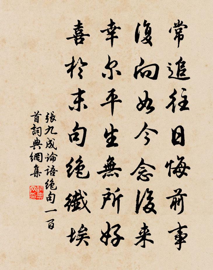 詩詞名句歷史字典書法欣賞書法字典國語詞典說文解字康熙字典古漢語字典標 題 作 者 詩 句 論語絕句一百首作者:張九成 朝代:宋代論語絕句一百首原文常追往日悔前事,復向如今念後來。幸爾平生無所好,喜於末句絕纖埃。詩詞問答問:論語絕句一百首的作者是誰?答:張九成問:論語絕句一百首寫於哪個朝代?答:宋代張九成論語絕句一百首書法欣賞論語絕句一百首書法作品詩詞推薦實弟以詩來督作會文又因太原侄寄聲欲作不速胡宏〔宋代〕我病死無日,經書更窮年。少年宜若厲,詩酒勿留連。晚春過雨袁說友〔宋代〕酒惡病成惱,春深愁轉加。園林三月事,風雨一庭花。燕幕自相語,蜂屯爭趁衙。傍欄迎霽色,溪上幾人家。句朱皆〔宋代〕千金常恨鄰難買,一笑那知蓋已傾。山中與友人夜話釋智圓〔宋代〕草舍閒宵坐,消搖事可憑。澄心防有著,深隱貴無名。砌月移松影,風泉混磬聲。共期吾道在,萬事任營營。姑孰十詠。慈姥竹李白〔唐代〕野竹攢石生,含煙映江島。翠色落波深,虛聲帶寒早。龍吟曾未聽,鳳曲吹應好。不學蒲柳凋,貞心嘗自保。次韻公定世弼登北都東樓四首黃庭堅〔宋代〕真皇多廟勝,仁祖用功深。卜宅遷九鼎,破胡藏萬金。百年休戰士,當日縱前禽。欲斷匈奴臂,不如留此心。落葉潘閬〔宋代〕片片落復落,園林漸向空。幾番經夜雨,一半是秋風。靜擁莎階下,閒堆蘚徑中。谷松與岩檜,寧共此時同。夏日即事張九成〔宋代〕拂袖歸來好,親朋語笑真。山高多爽氣,溪迥只清淪。簾幕深無暑,琴樽靜照人。短衫吳轂細水長流,團扇越羅新和胡吏部醇夫李復〔宋代〕妙語飄飄慰旅窮,自憐飢味得甘豐。朱弦恨廢高山久,明月驚投按劍中。垂翅為逢勍敵勇,傾囊但愧鄙夫空。相從金剛隨機無盡頌福智無比分第二十四釋印肅〔宋代〕天際月輪圓,澄澄湛覺源。無風休覓浪,說甚老婆禪。三疊仇遠〔宋代〕在昔金淵池,煙花錦不如。衣冠尊史祖,山水識靈胥。富歲人多賴,前修日以疏。洪崖仙可問,願乞雪精驢。嵩山十志十首。冪翠庭盧鴻一〔唐代〕冪翠庭者,蓋崖巘積陰,林蘿沓翠,其上綿冪,其下深湛。可以王神,可以冥道矣。及喧者游之,則酣謔永日,汩石榴蘇軾〔宋代〕風流意不盡,獨自送殘芳。色作裙腰染,名隨酒盞狂。次韻李參政秋懷十絕魏了翁〔宋代〕月華如水恰中庭,烏鵲枝頭棲復驚。晚暑三亭隨雨過,秋聲一半在蟲鳴。益昌除夕感懷蘇轍〔宋代〕永漏侵春已數籌,地爐猶擁木綿裘。無心豈畏三屍訴,愛日還驚一歲休。故國二千空醉眼,新年三十恰平頭。光陰劍池林景熙〔宋代〕鑿開神斧是何年,珠雁金鳧鎖冷煙。薜荔帶雲懸古木,轆轤卷月出秋泉。岩前洗劍精疑伏,林下烹茶味亦禪。高倚送仲明赴舉李流謙〔宋代〕進退士所重,視天為鼓鉦。採薇北山曲,濯足南澗濱。高風豈不偉,奈何萬蒼黔。道可濟天下,不必丘園尊。先生乍歸九首劉克莊〔宋代〕絕愛牆陰橘,花開滿院香。鄰人欺不在,稍覺北枝傷。贈友人呂溫〔唐代〕南山雙喬松,擢本皆千尋。夕流膏露津,朝被青雲陰。負雪出深澗,搖風倚高岑。明堂久不構,雲乾何森森。匠意滿庭芳 繼重陽韻 藏頭 折起方字馬鈺〔元代〕謝王性公,令身性脫,田耕性出祥光。然省悟,性內結鉛霜。識塵緣恩愛,須當、念斷情忘。猿退,乎者也,從此名句推薦碧水丹山映杖藜,夕陽猶在小橋西。沈周《題畫》 正雁水夜清,臥虹平帖。吳文英《暗香·送魏句濱宰吳縣解組分韻得闔字》 南朝千古傷心事,猶唱後庭花。吳激《人月圓·南朝千古傷心事》 惶恐灘頭說惶恐,零丁洋里嘆零丁。文天祥《過零丁洋》 雲邊雁斷胡天月,隴上羊歸塞草煙。溫庭筠《蘇武廟》 高齋今夜雨,獨臥武昌城。徐禎卿《在武昌作》 欲速則不達。孔子弟子《論語·子路篇》 秋寂寞,秋風夜雨傷離索孫道絢《憶秦娥·季溫老友歸樵陽人來閒書因以為寄》 試玉要燒三日滿,辨材須待七年期。白居易《放言五首·其三》 既秉上皇心,豈屑末代誚。謝靈運《七里瀨》