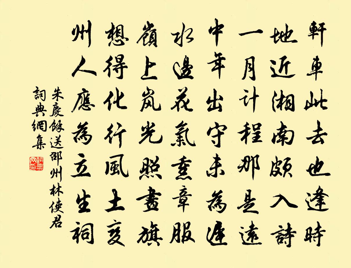 詩詞名句歷史字典書法欣賞書法字典國語詞典說文解字康熙字典古漢語字典標 題 作 者 詩 句 送邵州林使君作者:朱慶餘 朝代:唐代送邵州林使君原文軒車此去也逢時,地近湘南頗入詩。一月計程那是遠,中年出守未為遲。水邊花氣熏章服,嶺上嵐光照畫旗。想得化行風土變,州人應為立生祠。詩詞問答問:送邵州林使君的作者是誰?答:朱慶餘問:送邵州林使君寫於哪個朝代?答:唐代朱慶餘送邵州林使君書法欣賞送邵州林使君書法作品注釋全唐詩:卷515-30詩詞推薦偈頌十八首釋師體〔宋代〕西土尊師故紙羅,南方歷祖葛藤窠。臨風剔起透青眼,跟腳從頭覷破那。阿呵呵,會也麽,尺水休夸一丈波。幕天頌古二十六首釋嗣宗〔宋代〕不是風旛不是心,祖師正眼只如今。如今不識山河礙,識得如今海岳沉。題泉州萬安橋陳偁〔宋代〕跨海為橋布石牢,那知直下壓靈鰲。基連島嶼規模壯,勢截淵潭氣象豪。鐵馬著行橫絕漠,玉鯨張鬣露寒濤。縑圖題唐宋輔城上小樓二首張耒〔宋代〕沙田小雨不成泥,一帶溪光照翠微。遠目直隨殘日盡,晚雲還望故山歸。句樓鑰〔宋代〕門前莫約頻來客,坐上同觀未見書。飲酒望西山戲詠陸游〔宋代〕太白十詩九言酒,醉翁無詩不說山。若耶老農識幾字,也與二事日相關。我愛淳安好陳曄〔宋代〕我愛淳安好,先庚矢伏房。春秋武常閱,鐘鼓今惟詳。在在空三穴,家家保萬箱。歡呼遍田裡,既醉樂時康。寄張徵古沈如筠〔唐代〕寂歷遠山意,微冥半空碧。綠蘿無冬春,彩雲竟朝夕。張子海內奇,久為岩中客。聖君當夢想,安得老松石。春日何耕〔宋代〕門前無俗物,城上亦奇觀。花浪東流穩,雲山西望寒。身凌塵外遠,目極意中寬。最愛風標客,晴沙理青紈。暮春陪李尚書、李中丞過鄭監湖亭泛舟(得過字韻)杜甫〔唐代〕海內文章伯,湖邊意緒多。玉尊移晚興,桂楫帶酣歌。春日繁魚鳥,江天足芰荷。鄭莊賓客地,衰白遠來過。攝事十三首佚名〔宋代〕明明我祖,積德累仁。居晦若曜,邁種惟動。帝圖天錫,輝光日新。寐齋繹繹,昭事同寅。綿州錄參廳觀姜楚公畫鷹少陵為作詩者陸游〔宋代〕我來訪古涪之濱,不辭百岡冀一真。走馬朝尋海棕館,斫膾夜醉魴魚津。越王高樓亦已換,俯仰今古堪悲辛。督郵送周袁州赴鎮三首趙蕃〔宋代〕百里更題輿,才分刺史符。循良重他選,途轍詎常拘。不但治文牘,要令歌袴襦。戚休顰笑里,無或謂民愚。白酒歌為岩翁賦黃庚〔宋代〕火雲燒空日色烈,暑氣著人方鬱結。岩翁宴客水亭東,竹色蕖香獻清絕。瓜削水晶蓮剖珠,象箸犀盤盛陳列。銀罌寄璨師韋應物〔唐代〕林院生夜色,西廊上紗燈。時憶長松下,獨坐一山僧。句釋曉瑩〔宋代〕莫笑吾儂躭此癖。橙子四首劉子翬〔宋代〕尚懷細雨初移日,著子已見清霜潸。絕憐面有貴人色。偶致吾儕樽俎間。直閣張功甫南湖集曾豐〔宋代〕百好何嘗一徇時,游心上與古相追。不容萬物移吾學,猶得余功到此詩。玄酒太羹無痛快,光風霽月有長思。披吟偈二十首釋鼎需〔宋代〕隈嚴遁谷,敗種焦牙。應物隨形,拖泥帶水。贈道士(一作剡溪逢茅山道士)張籍〔唐代〕茅山近別剡溪逢,玉節青旄十二重。自說年年上天去,羅浮最近海邊峰。名句推薦握手經年別,驚心九日霜。妙信《九日酬諸子》 微風搖紫葉,輕露拂朱房。沈約《詠芙蓉》 志足而言文,情信而辭巧劉勰《文心雕龍·徵聖》 來掃千山雪,歸留萬國花。袁枚《春風》 綠蟻新醅酒,紅泥小火爐。白居易《問劉十九》 知屋漏者在宇下,知政失者在草野。王充《論衡·卷二十八·書解篇》 聽其言,跡其行,察其所能而慎予官。墨子《墨子·09章 尚賢(中)》 水激則悍,矢激則遠劉向《說苑·談叢》 酒盈杯,書滿架,名利不將心掛。李珣《漁歌子·荻花秋》 獨立小橋風滿袖,平林新月人歸後。馮延巳《鵲踏枝·誰道閒情拋擲久》