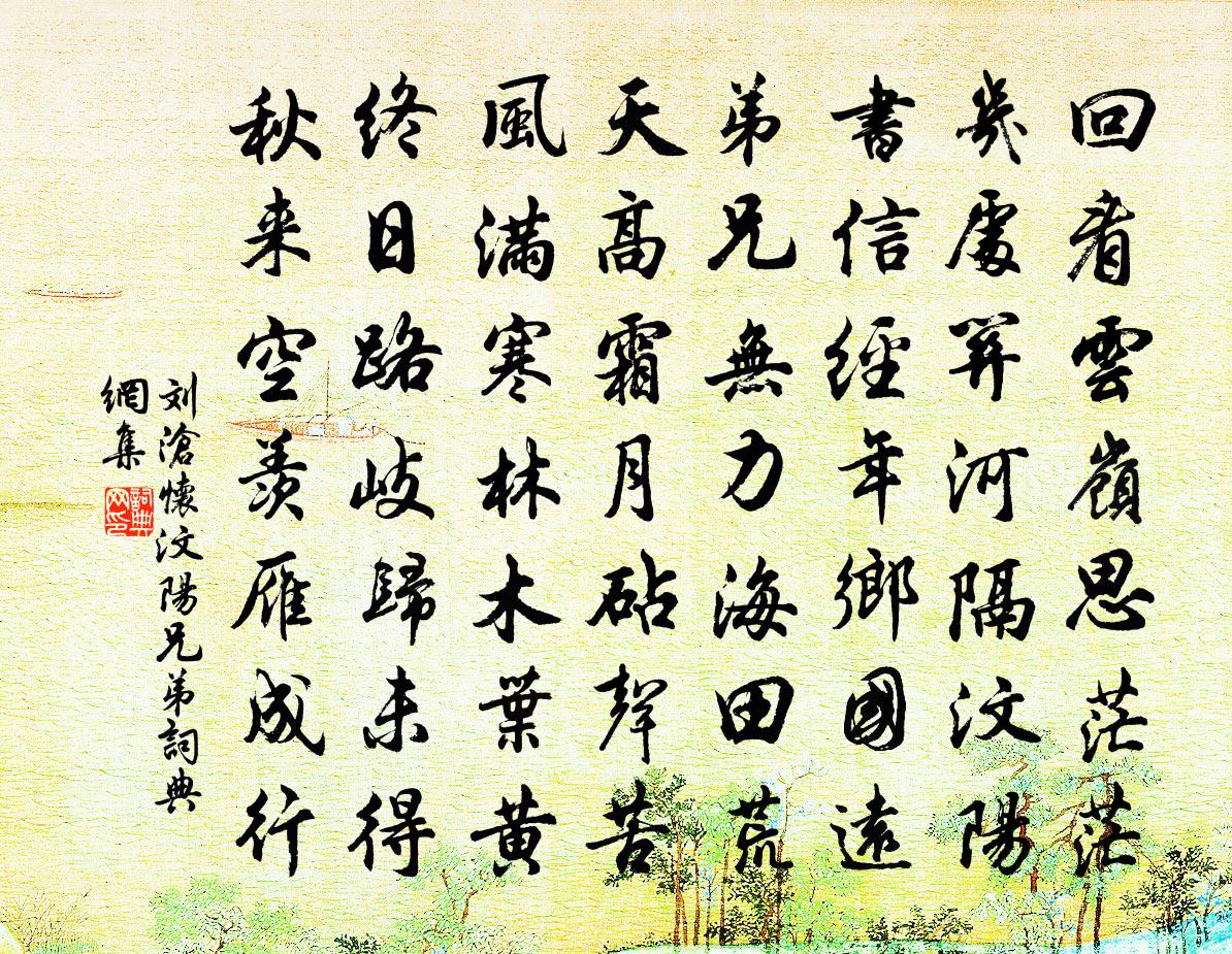 詩詞名句歷史字典書法欣賞書法字典國語詞典說文解字康熙字典古漢語字典標 題 作 者 詩 句 懷汶陽兄弟作者:劉滄 朝代:唐代懷汶陽兄弟原文回看雲嶺思茫茫,幾處關河隔汶陽。書信經年鄉國遠,弟兄無力海田荒。天高霜月砧聲苦,風滿寒林木葉黃。終日路岐歸未得,秋來空羨雁成行。詩詞問答問:懷汶陽兄弟的作者是誰?答:劉滄問:懷汶陽兄弟寫於哪個朝代?答:唐代問:懷汶陽兄弟是什麼體裁?答:七律劉滄懷汶陽兄弟書法欣賞懷汶陽兄弟書法作品注釋全唐詩:卷586-26詩詞推薦堯任舜禹行釋文珦〔宋代〕堯任舜禹,聖化日熙。二臣至德,惟堯克知。明良胥會,徵庸弗疑。佐命垂統,股肱綱維。行堯之道,蚤夜孳孳。點絳唇元好問〔金代〕痛負花朝,半春猶在長安道。故園春早。紅雨深芳草。愁里花開,愁里花空老。西歸好。一尊傾倒。氣去聲與花枝清處為書記曾魯卿作鄧深〔宋代〕小竹聊須長,閒花懶復栽。泉聲洗歌吹,雲氣障塵埃。籟靜初香裊,琴橫月上來。有時聞警露,夢覺自蓬萊。左右史待班二首任希夷〔宋代〕虎旅分行鐵作檛,殿前拜舞一聲嘩。輔臣對罷無公事,日照金鋪扇影斜。句俞君錫〔宋代〕蛩聲依壞砌,樹影倒寒池。晝寢樓鑰〔宋代〕彈徹悲風更廣陵,滄浪一為濯塵纓。邯鄲枕上夢初覺,喜聽檐閒秋雨聲。讀眉山集次韻雪詩五首王安石〔宋代〕惠施文字黑如鴉,於此機緘漫五車。皭若易緇終不染,紛然能幻本無花。觀空白足寧知處,疑有青腰豈作家。慧可賢者之孝二百四十首李興林同〔宋代〕刲股如為孝,還慶載聖經。莫明柳子意,因甚取殘形。聞倪尚書赴詔王邁〔宋代〕老倪昔戇去國,時無一語為王留。自從醫國失扁鵲,民之瘼矣矧可瘳。滿朝爭慕舌為柔,忍恥戴天事世分。間有一歸剡五首釋行海〔宋代〕天地寬閒鼓角疎,江南煙景憶當初。乍歸故里仍如客,偏愛滄洲不為魚。草木有心知雨露,樓台回首作丘墟。夕陽贈野逸周弼〔宋代〕悠悠行路雪侵頭,擬出重關洗弊裘。堤上忽逢憔悴客,背花停酒說通州。採蓮舟薛濤〔唐代〕風前一葉壓荷蕖,解報新秋又得魚。兔走烏馳人語靜,滿溪紅袂棹歌初。句宋白〔宋代〕回眸已覺三山近,滿壁潛驚五月寒。皇雅十首《皇治》三章尹洙〔宋代〕皇底其治,欽哉惟刑。在疑而宥,罔察為明。愛怒弗肆,孰為重輕。毋一弗辜,惟典之平。建隆寺北池亭宋庠〔宋代〕寶剎開初地,滄浪繞故城。芰蓮俱野色,鳧鴇各秋聲。岸闊煙無著,窗虛日易明。歸驂誰訝久,正為濯塵纓。踏莎行 寄京兆徐公譚處端〔元代〕方寸靈田,何曾拂掃。塵埃久暗生荒草。神泉散漫不凝澄,如何結得長生寶。雲水尋真,逍遙訪道。離家便是離煩題李公麟山莊圖其十二雨花岩蘇轍〔宋代〕岩花不可攀,翔蕊久未墮。忽下幽人前,知子觀空坐。朝中措(趙知合生日)曾覿〔宋代〕畫堂簾卷獸香濃。花上雪玲瓏。平地十州三島,蟠桃已試春紅。清朝舊德,仙姿難老,主眷方隆。爛醉笙歌叢里,雪霽冒寒方回〔宋代〕苦寒猶強忍,空闊倚樓前。春欲回江國,人皆喜雪天。病須攻此老,窮已極今年。乘興吾何往,西歸問釣船。正月十九日孟享從駕洪咨夔〔宋代〕黃繖中間一點紅,繡雲鹵簿海棠風。鈞容聲出雲霄外,馬上誰憐有老聾。名句推薦空將漢月出宮門,憶君清淚如鉛水。李賀《金銅仙人辭漢歌》 慎厥身,修思永。佚名《尚書·虞書·皋陶謨》 貂不足,狗尾續。房玄齡《晉書·列傳·第二十九章》 群雞正亂叫,客至雞鬥爭。杜甫《羌村三首·其三》 君知否,是山西將種,曾系詩盟。劉過《沁園春·張路分秋閱》 上苑風煙好,中橋道路平。白居易《洛橋寒食日作十韻》 古人不見今時月,今月曾經照古人。佚名《增廣賢文·上集》 令必行,禁必止。韓非及後人《韓非子·飾邪》 風回雲斷雨初晴,返照湖邊暖復明。白居易《南湖早春》 斑騅只系垂楊岸,何處西南任好風。李商隱《無題·鳳尾香羅薄幾重》