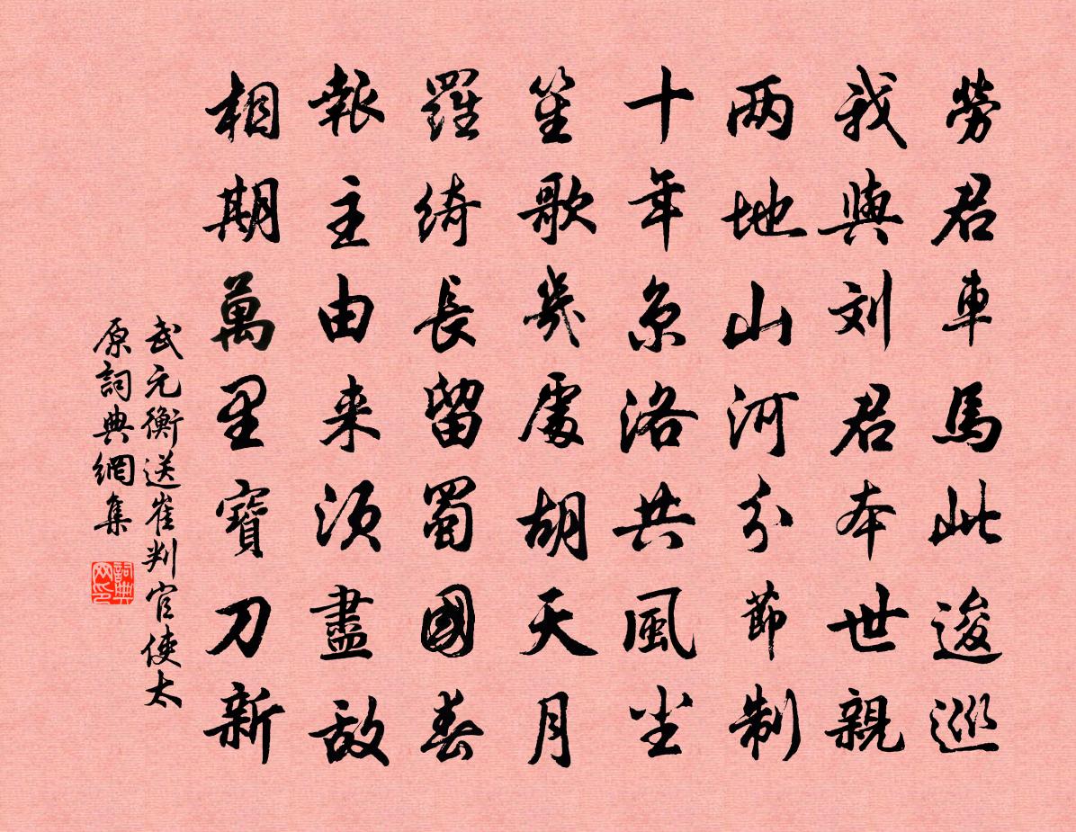 詩詞名句歷史字典書法欣賞書法字典國語詞典說文解字康熙字典古漢語字典標 題 作 者 詩 句 送崔判官使太原作者:武元衡 朝代:唐代送崔判官使太原原文勞君車馬此逡巡,我與劉君本世親。兩地山河分節制,十年京洛共風塵。笙歌幾處胡天月,羅綺長留蜀國春。報主由來須盡敵,相期萬里寶刀新。詩詞問答問:送崔判官使太原的作者是誰?答:武元衡問:送崔判官使太原寫於哪個朝代?答:唐代問:送崔判官使太原是什麼體裁?答:七律武元衡送崔判官使太原書法欣賞送崔判官使太原書法作品注釋全唐詩:卷317-1詩詞推薦疊後柳宗元〔唐代〕事業無成恥藝成,南宮起草舊連名。勸君火急添功用,趁取當時二妙聲。九里山中 其三王冕〔元代〕九里溪頭晚雨晴,松風瑟瑟水泠泠。絕無過客問奇字,只有閒雲到野亭。每笑盛名傳坎壈,豈陳虛語說零丁?老年雉山寺宋永補中有僧西顒誦法華經於此白雉聽樂雷發〔宋代〕蘇碑蘿石擁嵒扃,獨倚筇枝問大乘。白雉苦無千歲種,青山空識六朝僧。詩傳北嶽刊新帖,禪接西淮冷舊燈。擬鑿十疊劉克莊〔宋代〕有花多處便憑欄,插在金瓶不必看。百斛量珠真富貴,兩枝剪彩太寒酸。瑞岩仰老見和復酬前韻七首曹勛〔宋代〕雙澗流泉徹底清,五峰晴掛白雲輕。泉流雲散遲歸步,猶欲思豐問此生。內宴奉詔作曹翰〔宋代〕三十年前學六韜,英名常得預時髦。曾因國難披金甲,不為家貧賣寶刀。臂健尚嫌弓力軟,眼明猶識陣雲高。庭前盟雲陸游〔宋代〕謂雲本無心,企望乃爾奇;謂雲果有心,百變端為誰,豈憐此翁愁,一出怡悅之?橫截千嶂平,高擎一峰危,銀城唐合門輓詩三首方回〔宋代〕異日煙霄夢,終身水竹居。早交天下士,盡讀世間書。漢祚金刀末,江流玉樹余。興亡較功罪,元不涉樵漁。十二時/憶少年佚名〔宋代〕珍符錫佑啟真人。儲思在斯民。勤勞日升萬物,皆入陶鈞。收威柄,更法令,鼎從新。東風吹百卉,上苑正青春。句李壁〔宋代〕莫令歸往地,翻作殺胡林。和劉後村梅花百詠方蒙仲〔宋代〕一從香影句名佳,嗣響才稱竹外斜。千古梅詩三句好,何好閣筆只看花。夢覺戴表元〔宋代〕夢覺依然一草寮,浮蹤已慣任飄搖。虛檐明氣生朝露,遠樹寒聲過夜潮。白骨又驚山下滿,朱顏剛向客不消。時平冬日書懷徐璣〔宋代〕閒庭黃葉滿,園樹盡玲瓏。寒水終朝碧,霜天向晚紅。蔬餐如野寺,茅舍近溪翁。非是分囂寂,由來趣不同。悟黃梁 本名燕歸梁 贈劉九郎王丹桂〔元代〕人間何事最堪悲。迷火院,受驅馳。不曾時霎暫舒眉。算何日,是休期。況他衣飲各相隨。空熱亂,又奚為。明明戲代李協律松江有贈許渾〔唐代〕蜀客操琴吳女歌,明珠十斛是天河。霜凝薜荔怯秋樹,露滴芙蓉愁晚波。蘭浦遠鄉應解珮,柳堤殘月未鳴珂。西樓越鳥鄭谷〔唐代〕背霜南雁不到處,倚棹北人初聽時。梅雨滿江春草歇,一聲聲在荔枝枝。笑晁說之〔宋代〕笑樂真情豈可無,樂而不笑是何拘。日中無事逢棋局,春後有花兼酒壺。輕俠兒前撫手掌,滑稽傳後撫髭鬚。江南六朝門再吟周曇〔唐代〕興亡何故遽環回,湯紂身為事可哀。莫是自長嫌勝己,蔽賢猶執匹夫才。武陵春王吉昌〔元代〕一氣始方離混沌,八卦九宮期。羅絡壺中媾坎離。訊息浩充肌。斡轉璇璣神寂定,龍虎甲庚頤。性普三宮造化奇。勸農即事孟點〔宋代〕阡陌躬行謹邵農,平郊快馬蹴東風。土膏流潤雨初足,花錦喧晴春正中。旗陣折旋知路曲,樂聲遞響覺山空。長官名句推薦政者正也。君為正,則百姓從政矣。戴聖《禮記·哀公問》 陰壑生虛籟,月林散清影杜甫《游龍門奉先寺》 不用訴離觴,痛飲從來別有腸。蘇軾《南鄉子·和楊元素時移守密州》 魚網之設,鴻則罹其中;螳螂之貪,雀又乘其後。洪應明《菜根譚·概論》 提出西方白帝驚,嗷嗷鬼母秋郊哭。李賀《春坊正字劍子歌》 凡兵家之法,要在應變,好在知兵,舉動必先料敵。佚名《百戰奇略·第十卷·變戰》 一聲聲,一更更。万俟詠《長相思·雨》 疏雨池塘見,微風襟袖知。陰陰夏木囀黃鸝賀鑄《南歌子·疏雨池塘見》 隨意春芳歇,王孫自可留。王維《山居秋暝》 蓬門未識綺羅香,擬托良媒益自傷。秦韜玉《貧女》
