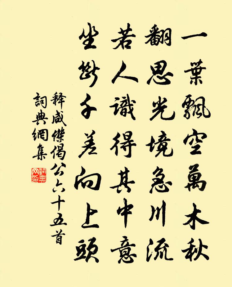 詩詞名句歷史字典書法欣賞書法字典國語詞典說文解字康熙字典古漢語字典標 題 作 者 詩 句 偈公六十五首作者:釋鹹傑 朝代:宋代偈公六十五首原文一葉飄空萬木秋,翻思光境急川流。若人識得其中意,坐斷千差向上頭。詩詞問答問:偈公六十五首的作者是誰?答:釋鹹傑問:偈公六十五首寫於哪個朝代?答:宋代釋鹹傑偈公六十五首書法欣賞偈公六十五首書法作品詩詞推薦煉丹砂王玠〔元代〕學道不難知。都在人為。須憑玄牝立根基。以坎填離無間斷,得造希夷。神*靜相依。龍虎皈隨。無中養就個嬰兒出郊楊時〔宋代〕雲根修蔓綠成陰,風雨園林懶重尋。春日去來人不問,碧桃朱李付幽禽。木蘭花慢(南屏晚鐘)周密〔宋代〕疏鐘敲暝色,正遠樹、綠愔愔,看渡水僧歸,投林鳥聚,煙冷秋屏。孤雲。漸沈雁影,尚殘簫、倦鼓別遊人。宮柳梅王奕〔宋代〕愛梅坐至夜三更,坐至三更意未平。潛以晉來為己任,亮將漢去與天爭。是心或可道前哲,此理如何語後生。莫笑歸舟發南浦陳杰〔宋代〕舊遊觸景不無情,已辦牽江復小停。好在夕陽紅葉樹,依然新月白沙汀。舟回剡曲潮空落,笛起山陽酒乍醒。當日丙午寒食題淨土寺一首王阮〔宋代〕方見繁紅繡小園,已隨流水泛前村。人於醽醁真無分,雨共鞦韆似有冤。投老故應諸事懶,問春能得幾分存。不須夜坐懷都城項安世〔宋代〕霏霏寒露濕檣竿,耿耿明星動玉灣。夜久暗塵無一點,心閒遠念忽相關。天街月色中秋近,海岸濤頭數日間。正是和張叔靖三絕鄭剛中〔宋代〕屋後瓜疇接芋區,門前寥落翳庵莒。愚痴不顧妻兒笑,依舊燈窗夜讀書。句佚名〔宋代〕天涯亭下有龍窟,林冶山頭出碎金。大雪趙蕃〔宋代〕長年南雪不到地,瘴癘慘毒愁北人。今年初見臘前白,寵光並與梅花新。客居破屋愁欲裂,病目不嫌熏濕薪。鶉衣秋日懷九華舊居杜荀鶴〔唐代〕吾道在五字,吾身寧陸沈。涼生中夜雨,病起故山心。燭共寒酸影,蛩添苦楚吟。何當遂歸去,一逕入松林。上余倅生辰唐律十章唐士恥〔宋代〕亭亭采棒足流傳,太末官勛壓此年。感德銜恩知有自,定應亦致爛柯仙。送人移知賀州曾鞏〔宋代〕溪石膠船秋瀨微,南山巉空勢峨巍。風露氣嚴花草腓,天色漻漻初雁飛。君子往守東南圻,旟旟彩錯如翔翬。象茜吳江太湖笠澤虹橋陳遠〔宋代〕世間八月十五夜,何處樓台得月多。不及吳江橋上望,水晶宮裡揖嫦娥。雨餘喻良能〔宋代〕雨餘平野綠,耕種滿東皋。處處鞭黃犢,家家賣孟勞。筠盤饋糠籺,瓦盌薦溪毛。所願甘霖足,梁間掛桔槔。宮人斜周文璞〔宋代〕魂魄淒涼掩暮塵,野花山葉自精神。年年中使頭邊過,暗裡相看似路人。送曾原伯運使歸會稽,用送徐叔智韻范成大〔宋代〕秧田水滿麥棲畝,勸農使者翩然去。去年愁苦救荒時,豈敢夢為今日歸。天津橋西官柳陌,文書燈火長相覓。江山池上竹下作白居易〔唐代〕穿籬繞舍碧逶迤,十畝閒居半是池。食飽窗間新睡後,腳輕林下獨行時。水能性淡為吾友,竹解心虛即我師。何必和洪玉甫秘監荔枝三蘇籀〔宋代〕瘴鄉駢瑣質,善地最蒲閩。冠絕林間品,難為坐上賓。蟠桃壽天帝,萍實荐居宸。無逸為龜策,何煩萬馬塵。林塘臘候羊士諤〔唐代〕南國冰霜晚,年華已暗歸。閒招別館客,遠念故山薇。野艇虛還觸,籠禽倦更飛。忘言亦何事,酣賞步清輝。名句推薦樓外垂楊千萬縷。欲系青春,少住春還去。朱淑真《蝶戀花·送春》 大江流日夜,客心悲未央。謝朓《暫使下都夜發新林至京邑贈西府同僚》 暗暗淡淡紫,融融冶冶黃。李商隱《菊花》 老圃好栽培,菊花五月開。顧太清《菩薩蠻·端午日詠盆中菊》 欲往從之雪雰雰,側身北望涕沾巾。張衡《四愁詩》 不聞爺娘喚女聲,但聞黃河流水鳴濺濺。佚名《木蘭詩 / 木蘭辭》 食必常飽,然後求美;衣必常暖,然後求麗劉向《說苑·反質》 昔時人已沒,今日水猶寒。駱賓王《於易水送人 / 於易水送別》 志意修則驕富貴,道義重則輕王公。荀子《荀子·修身》 慷慨惟平生,俯仰獨悲傷。陸機《門有車馬客行》