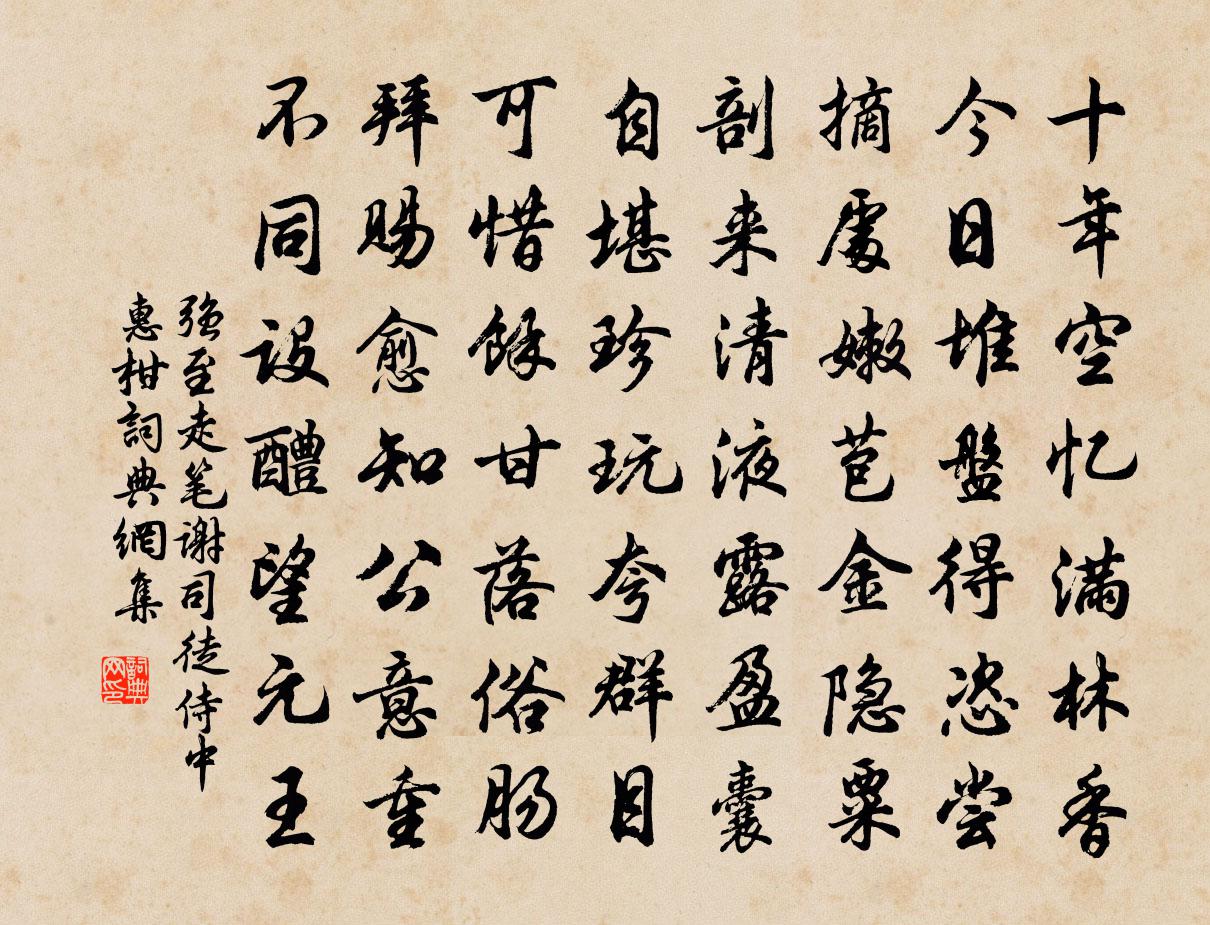 詩詞名句歷史字典書法欣賞書法字典國語詞典說文解字康熙字典古漢語字典標 題 作 者 詩 句 走筆謝司徒侍中惠柑作者:強至 朝代:宋代走筆謝司徒侍中惠柑原文十年空憶滿林香,今日堆盤得恣嘗。摘處嫩苞金隱粟,剖來清液露盈囊。自堪珍玩夸群目,可惜餘甘落俗腸。拜賜愈知公意重,不同設醴望元王。詩詞問答問:走筆謝司徒侍中惠柑的作者是誰?答:強至問:走筆謝司徒侍中惠柑寫於哪個朝代?答:宋代強至走筆謝司徒侍中惠柑書法欣賞走筆謝司徒侍中惠柑書法作品詩詞推薦滿江紅 寄何侍御魏初〔元代〕少日肝腸,雲夢地、氣吞 * 。今老去,才疏計拙,百居人後。倦處收回行路腳,懶來噤卻吟詩口。算從前、四十六么令·次韻和賀方回金陵懷古鄱陽席上作李綱〔宋代〕長江千里,煙淡水雲闊。歌沉玉樹,古寺空有疏鍾發。六代興亡如夢,苒苒驚時月。兵戈凌滅。豪華銷盡,幾見銀沁園春(守歲)陳人傑〔宋代〕太歲茫茫,猶有歸時,我胡不歸。為桂枝關約,十年闕下,梅花夢想,半夜天涯。婪尾三杯,膠牙一標,節物依然宿妙庭觀次東坡舊韻范成大〔宋代〕桂殿吹笙夜不歸,蘇仙詩板掛空悲。世人舐鼎何須笑,猶勝先生夢石芝。升降三田自有丹,浪尋盤鼎斸仙壇。扣門依韻酬葉道卿中秋對月二首范仲淹〔宋代〕天遣今宵無寸雲,故開秋碧掛冰輪。詩人不悔衣沾露,為惜清光豈易親。袞山道中范成大〔宋代〕虎嘯狐鳴苦竹叢,魂驚終日走蒙茸。松林斷處前山缺,又見南湖數十峰。木蘭花(四之二·林鐘商)柳永〔宋代〕佳娘捧板花鈿簇。唱出新聲群艷伏。金鵝扇掩調累累,文杏梁高塵簌簌。鸞吟鳳嘯清相續。管裂弦焦爭可逐。何當句高似孫〔宋代〕僧斧菘分甲,漁篝蟹斬臍。郊廟歌辭。褒德廟樂章。武舞作佚名〔唐代〕昭昭竹殿開,奕奕蘭宮啟。懿範隆丹掖,殊榮辟朱邸。六佾薦徽容,三簋陳芳醴。萬石覃貽厥,分珪崇祖禰。新市雜詠十首華岳〔宋代〕恰把青荷插髻鴉,嗔人偷眼過窗紗。一盤珠翠俱拋擲,卻向村頭摘杏花。戲題故袍張鎡〔宋代〕垂髫便衣綠荷衣,兩見龍飛聖主時。舉世恩榮俱合換,唯吾憂患只該披。收藏盡好隨腰帶,提掇應堪傲鬢絲。試使入五月病二七日方回〔宋代〕病已捐蒲酒,寒猶擁絮衣。形骸元自劣,氣候每相違。人死朝朝有,吾衰事事非。尫羸存喘息,聊覆信天機。石版李鹹用〔唐代〕高人好自然,移得它山碧。不磨如版平,大巧非因力。古蘚小青錢,塵中看野色。冷倚砌花春,靜伴疏篁直。山僧游罨畫溪曾協〔宋代〕春去無蹤綠滿堤,空移征棹過漣漪。自驚朱墨抽身晚,不及青紅倒影時。韋使君宅海榴詠皇甫曾〔唐代〕淮陽臥理有清風,臘月榴花帶雪紅。閉閣寂寥常對此,江湖心在數枝中。石壁精舍還湖中作謝靈運〔南北朝〕昏旦變氣候,山水含清暉。清暉能娛人,遊子憺忘歸。出穀日尚早,入舟陽已微。林壑斂暝色,雲霞收夕霏。芰荷曲江醉後贈諸親故白居易〔唐代〕郭東丘墓何年客?江畔風光幾日春?只合殷勤逐杯酒,不須疏索向交親。中天或有長生藥,下界應無不死人。除卻和永叔思白兔戲答公儀憶鶴雜言王珪〔唐代〕兔自明月窟中出,鶴從群玉峰頭下。人間俗眼未嘗窺,已為兩家藏以詫。玉堂詞人本仙材,光芒偶落銀河罅。謫向夜過王兆明趙蕃〔宋代〕門外春風吹倒人,過門寧惜滯車輪。君能勸我杯中物,我亦揮君壁上塵。送子謙皈松江釋行海〔宋代〕秋風社燕忽辭梁,志士鷹揚在四方。一曝十寒吾已老,寸陰尺璧子須忙。松於雪裡方知操,梅到春前便有香。此去名句推薦雨中山果落,燈下草蟲鳴。王維《秋夜獨坐 / 冬夜書懷》 人迷洞庭水,雁度瀟湘煙。李白《郢門秋懷》 少年俠氣,交結五都雄。賀鑄《六州歌頭·少年俠氣》 勸君莫打枝頭鳥,子在巢中望母歸。白居易《鳥》 愛人者此為博焉,利人者此為厚焉。墨子《墨子·26章 天志(上)》 街南綠樹春饒絮。雪滿遊春路。晏幾道《御街行·街南綠樹春饒絮》 桃李待日開,榮華照當年。李白《長歌行》 黃河之水天上來,奔流到海不復回。李白《將進酒》 事父母幾諫,見志不從,又敬不違,勞而不怨。孔子弟子《論語·里仁篇》 燕子不曾來,小院陰陰雨。蔣春霖《卜運算元·燕子不曾來》