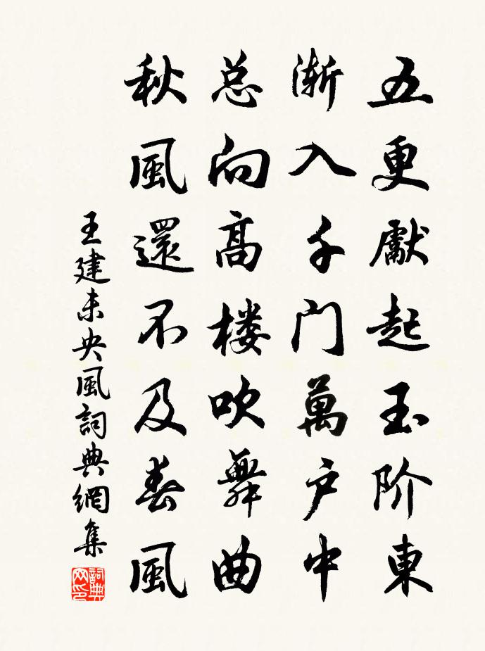 詩詞名句歷史字典書法欣賞書法字典國語詞典說文解字康熙字典古漢語字典標 題 作 者 詩 句 未央風作者:王建 朝代:唐代未央風原文五更先起玉階東,漸入千門萬戶中。總向高樓吹舞曲,秋風還不及春風。詩詞問答問:未央風的作者是誰?答:王建問:未央風寫於哪個朝代?答:唐代問:未央風是什麼體裁?答:七絕問:王建的名句有哪些?答:王建名句大全王建未央風書法欣賞未央風書法作品注釋全唐詩:卷301-82詩詞推薦九月初十日值宿玉堂七絕劉克莊〔宋代〕形槁心灰一禿翁,偶來視草禁林中。幼吹蔥葉還堪聽,老畫葫蘆卻未工。八節長歡(送孫守公素)毛滂〔宋代〕名滿人間。記黃金殿,舊賜清閒。才高鸚鵡賦,風懍惠文冠。濤波何處試蛟鱷,到白頭、猶守溪山。且做龔黃樣度送姚合郎中任杭州劉得仁〔唐代〕水陸中分程,看花一月行。會稽山隔浪,天竺樹連城。候吏齎魚印,迎船載旆旌。渡江春始半,列嶼草初生。偈傾一百三十三首釋法薰〔宋代〕指天指地,小兒子戲。無可殷勤,澆杓惡水。次韻和康侍郎遊仙岩林季仲〔宋代〕林巒爭入馬蹄來,宿霧殘雲撥不開。石臥松根橫碧玉,瀑懸天外轉晴雷。仙家長鎖青春好,老子猶堪竟日陪。收拾和趙忠州園亭落成宴客三首自為堂陳文蔚〔宋代〕雙旌未逐詔書還,放適何妨且謝安。地拔鵝峰長突兀,天教老子得蹣跚。病瘳不必維摩問,客醉誰知太守嘆。更乞倪峰避難陳著〔宋代〕衰年踏險行,五賊太無情。落葉滑霜路,空山生夜聲。相攜德耀隱,幾喪卜商明。歸計未為是,時時心自驚。行次靈龕驛寄西蜀尚書薛能〔唐代〕北客推車指蜀門,乾陽知已近臨坤。從辭府郭常回首,欲別封疆更感恩。援寡聖朝難望闕,暑催蠶麥得歸村。雷公林園晚霽韋應物〔唐代〕雨歇見青山,落日照林園。山多煙鳥亂,林清風景翻。提攜唯子弟,蕭散在琴言。同游不同意,耿耿獨傷魂。寂寞送謝子肅之官吳芾〔宋代〕吾鄉人物苦雕零,賴子傳家有典刑。仕宦方期行古道,姓名早已達天庭。致君事業須先辦,涉世風霜要飽經。終不舟泊竹篠港夜坐誦後山詩袁說友〔宋代〕沙岸人歸後,船窗月上時。霜風竹篠港,燈火後山詩。歲晚羇懷惡,江空熟路遲。鄰舟一樽酒,不使老夫知。題李伯時渭城送客圖用知幾韻王灼〔宋代〕龍眠幻出摩詰句,想見落筆懷抱空。只有古今情不盡,渭城楊柳幾春風。鹽官絕句四首南寺千佛閣蘇軾〔宋代〕古邑居民半海濤,師來構築便能高。千金用盡身無事,坐看香菸繞白毫。浰陽早發蘇轍〔宋代〕春氣入楚澤,原上草猶枯。北風吹栗林,梅蕊颯已無。我行亦何事,驅馬無疾徐。楚人信稀少,田畝任蓁蕪。空有秋懷羅公升〔宋代〕錢塘八月潮,勝絕聞古今。順兒識潮耳,不識潮中心。拾得攜苕箒贊釋子益〔宋代〕往來雙磵路,腳下起塵埃。苕箒忙忙掃,何曾掃得來。夏日十二首張耒〔宋代〕養拙貧無事,深幽樂更真。檐巢偷哺子,樹啄巧藏身。竊果鶯知主,移居蟻過鄰。老夫朝食美,薦俎有溪鱗。漳嶼庵造水莧釋安永〔宋代〕路繞懸崖萬仞頭,擔泉帶月幾時休。箇中撥轉通天竅,人自安閒水自流。除夜方岳〔宋代〕盡處生機袞袞新,花情柳思已精神。歲堂堂去誰能守,睡到明朝又是春。葉西廬惠冬菊三絕王柏〔宋代〕霜天無物不凋殘,忽見青蕤羽葆攢。欲制頹齡須耐冷,一陽定有落英餐。名句推薦微風搖紫葉,輕露拂朱房。沈約《詠芙蓉》 天涯地角有窮時,只有相思無盡處。晏殊《玉樓春·春恨》 自家富貴,不著意里,人家富貴,不著眼裡,此是何等胸襟王永彬《圍爐夜話·第二三則》 社下燒錢鼓似雷,日斜扶得醉翁回。范成大《春日田園雜興》 漫惹爐煙雙袖紫,空將酒暈一衫青。納蘭性德《浣溪沙·伏雨朝寒愁不勝》 去好去惡,臣乃見素;去舊去智,臣乃自備。韓非及後人《韓非子·主道》 朝真暮偽何人辨,古往今來底事無。白居易《放言五首·其一》 天能生物,不能辨物也,地能載人,不能治人也;宇中萬物生人之屬,待聖人然後分也。荀子《荀子·禮論》 燕簾鶯戶,雲窗霧閣,酒醒啼鴉。張炎《朝中措·清明時節》 髻子傷春慵更梳。晚風庭院落梅初。李清照《浣溪沙·髻子傷春慵更梳》