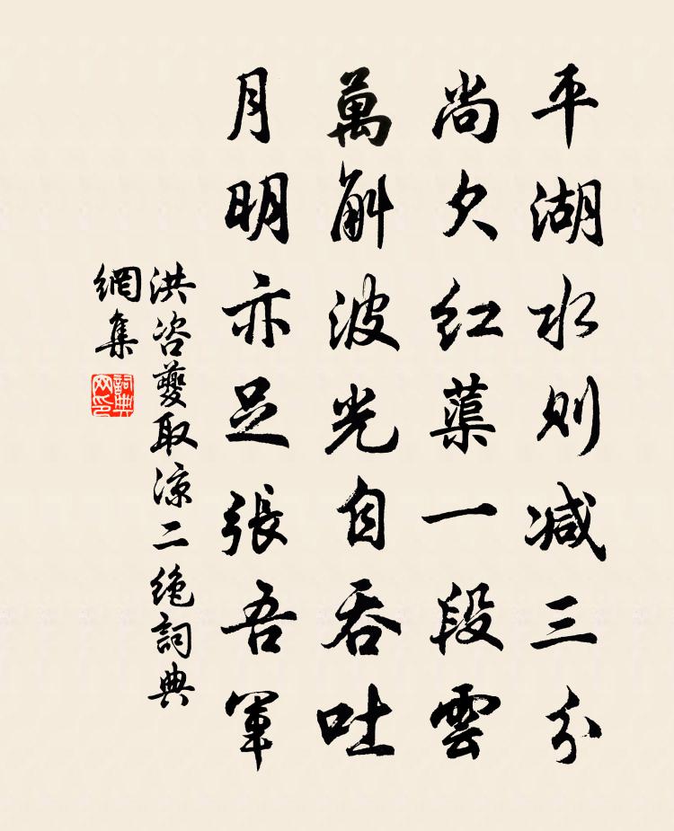 詩詞名句歷史字典書法欣賞書法字典國語詞典說文解字康熙字典古漢語字典標 題 作 者 詩 句 取涼二絕作者:洪咨夔 朝代:宋代取涼二絕原文平湖水則減三分,尚欠紅蕖一段雲。萬斛波光自吞吐,月明亦足張吾軍。詩詞問答問:取涼二絕的作者是誰?答:洪咨夔問:取涼二絕寫於哪個朝代?答:宋代洪咨夔取涼二絕書法欣賞取涼二絕書法作品詩詞推薦聞琵琶方響成才絕葛立方〔宋代〕赤鳥寶女眩新妝,九酘霞漿肯見觴。但聽琵琶喧啄木,誰知捍撥是龍香。和劉長安題薛周逸老亭周最善飲酒未七十而致蘇軾〔宋代〕近聞薛公子,早退驚常流。買園招野鶴,鑿井動潛虬。自言酒中趣,一鬥勝涼州。翻然拂衣去,親愛挽不留。隱居田家樂楊萬里〔宋代〕稻穗堆場谷滿車,家家雞犬更桑麻。漫栽木槿成籬落,已得清陰又得花。送杜陽安奉親還蜀二首洪咨夔〔宋代〕訪落方勤止,而翁苦掉頭。立幾遺世獨,行盍為王留。日月馳雙轂,乾坤寄一舟。勿緣歸計得,忘卻緯邊憂。萬州范成大〔宋代〕晨炊維下岩,晚酌艤南浦。波心照州榜,雲腳響衙鼓。前山如屏牆,得得正當戶。西江朝宗來,循屏復東去。官曹謁金門黃機〔宋代〕愁萬疊。春在雨條菸葉。翠袖倚風寒霎霎。傍闌看乳鴨。何處一聲啼鴂。架上荼欲雪。繡被薰香香未歇。可憐音信詠史詩姑蘇台胡曾〔唐代〕吳王恃霸棄雄才,貪向姑蘇醉醁醅。不覺錢塘江上月,一宵西送越兵來。挽趙孺人劉克莊〔宋代〕婉變宗姬性,堅貞烈士腸。簪蒿安隱約,畫荻訓偏傍。防墓夫同穴,瀧阡子表岡。夫人真范母,那得不生滂。袁州慶豐堂十閒詠祖無擇〔宋代〕鄭聲良可厭,閒抱七絲琴。欲識調弦意,理人先理心。人日登高喬侃〔唐代〕仆本多悲者,年來不悟春。登高一游目,始覺柳條新。杜陵猶識漢,桃源不辨秦。暫若升雲霧,還似出囂塵。賴得次韻黃大臨秀才見寄蘇轍〔宋代〕故人聚散霜前葉,往事眇茫風際煙。遊宦一生非有已,隱居萬事不由天。崎嶇檻阱方謀食,嘯傲山林肯計年。賴已觀性吟邵雍〔宋代〕千萬年之人,千萬年之事。千萬年之情,千萬年之理。惟學之所能,坐而爛觀爾。正月五日漫興余芑舒〔宋代〕雪檐晴作雨,道空日如年。燕坐無餘事,床頭易一編。送福州通判陳鑄宋祁〔宋代〕州閣紆新綬,鄉枌歷故廛。先驅長卿貴,隨子大家賢。桂蠹閩君貢,刀耕越俗田。春郵有歸信,正待早梅傳。句宋祁〔宋代〕碧雲謾有三年信,明月空為兩地愁。東方朔王安石〔宋代〕平原狂先生,隱翳世上塵。材多不可數,射覆亦絕倫。談辭最詼怪,發口如有神。以此得親幸,賜予頗不貧。金玉蝶戀花(丁丑七夕)劉鎮〔宋代〕誰送涼蟾消夜暑。河漢迢迢,牛女何曾渡。乞得巧來無用處。世間枉費閒針縷。人在江南煙水路。頭白鴛鴦,不道金玉吟邵雍〔宋代〕聖在人中山,心從行上修。金於砂里得,玉向石中求。舟中雜紀 其六王冕〔元代〕秋茂喜禾壯,官河帶野橋。水光欺日白,寒氣得風饒。覓火鄰船並,沽醪市店遙。傳聞徵稅急,不忍見漁樵。雨後孫介〔宋代〕落日矯烏雲,疾風豗白浪。雨聲西南來,勢劇萬馬壯。名句推薦枯枝無醜葉,涸水吐清泉李白《長歌行》 翹思慕遠人,願欲托遺音。曹植《雜詩六首·其一》 鎮日無心掃黛眉。臨行愁見理征衣。夏竦《鷓鴣天·鎮日無心掃黛眉》 小娃撐小艇,偷采白蓮回。白居易《池上》 可憐今夜月,不肯下西廂。王庭筠《絕句·竹影和詩瘦》 凡斗者,必自以為是而以人為非也。荀子《荀子·榮辱》 松竹含新秋,軒窗有餘清。崔元翰《奉和聖制中元日題奉敬寺》 昔日橫波目,今成流淚泉。李白《長相思三首·其二》 人之生不能無群荀子《荀子·富國》 松葉堪為酒,春來釀幾多。張九齡《答陸澧》