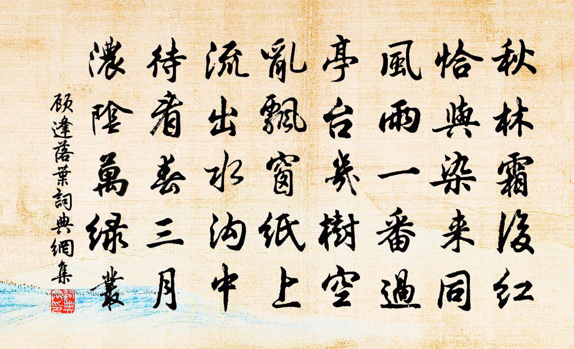 詩詞名句歷史字典書法欣賞書法字典國語詞典說文解字康熙字典古漢語字典標 題 作 者 詩 句 落葉作者:顧逢 朝代:宋代落葉原文秋林霜後紅,恰與染來同。風雨一番過,亭台幾樹空。亂飄窗紙上,流出水溝中。待看春三月,濃陰萬綠叢。詩詞問答問:落葉的作者是誰?答:顧逢問:落葉寫於哪個朝代?答:宋代顧逢落葉書法欣賞落葉書法作品詩詞推薦烏夜啼盧祖皋〔宋代〕柳色津頭泫綠,桃花渡口啼紅。一春又負西湖醉,離恨雨聲中。客袂迢迢西塞,餘寒翦翦東風。誰家拂水飛來燕,三用韻十首楊公遠〔宋代〕不作皺眉事,何煩古押衙。且嘗桑落酒,更淪雨前茶。風銳霜初結,天寒日易斜。莫言秋色老,猶自有黃花。李總乾遺詩十四句師於一句之下加頌七句釋印肅〔宋代〕朝朝去禮拜,誰識丹霞在。打倒木佛燒,院主反招罪。得相而無相,參方會不會。如來非大身,老盧快踏碓。試筆陸游〔宋代〕清談數語猶疑過,平地徐行亦慮危。酌酒淺深須在我,更衣單復要隨時。讀陳勝傳屈大均〔清代〕閭左稱雄日,漁陽適戍人。王候寧有種?竿木足亡秦。大義呼豪傑,先聲仗鬼神。驅除功第一,漢將可誰倫?閉居五詠其一杜門蘇轍〔宋代〕可憐杜門久,不覺杜門非。床銳日日銷,髀肉年年肥。眼暗書罷讀,肺病酒亦稀。經年客不至,不冠仍不衣。視聽句曾致堯〔宋代〕更無塵土當軒起,只有松蘿繞檻生。謝李兼善書庫寄近作袁說友〔宋代〕筆下陳無己,香分一瓣奇。有孫今見嫡,得髓政忘皮。懷舊書來日,驚人語妙時。猶思頻咀嚼,咽子百篇詩。剪春羅舒岳祥〔宋代〕誰裁婺女輕羅段,我有并州快剪刀。色似山丹殊少肉,形如石竹亦多毫。臙脂初褪黃先露,蝴蝶才成翅未高。欲向挽陸景淵主簿孫應時〔宋代〕輩行吾雖晚,交情久最親。湖山追勝賞,棋酒過比鄰。滿眼思群顏,傷懷已二人。君今復何往,不忍夢音塵。晚春胡仲弓〔宋代〕萬紅千紫已摧殘,留得荼醾一架看。燕子不知人意懶,飛來簾里訴春寒。題畫扇楊冠卿〔宋代〕斷橋流水小舟橫,臥看林梢素月明。雙鶴不知何事舞,風前時送九臯聲。冬日野外宋祁〔宋代〕朔吹低凝野,層陰迥匝天。葉飄霜外柳,煙山燒餘田。晼晚流芳後,崢嶸急景前。平生魚鳥志,寧免為留連。山中雜言吳錫疇〔宋代〕移春有檻遍京華,剩種人間富貴花。誰識山中窮活計,眼前沃沃只桑麻。頌古四十八首釋慧開〔宋代〕西來直指,事因囑起。找聒叢林,元來是你。聲聲慢(和徐同年梅)姚勉〔宋代〕江涵石瘦,雪壓橋低,森森萬木寒僵。不是爭魁,百花誰敢先芳。冰姿皎然玉立,笑兒曹、粉面何郎。調羹鼎,只贈道士張易張鎡〔宋代〕道人生長清淮西,地荒戰血孤鬼啼。飽知濁世一朝菌,擺落羈馽全天倪。穿霞踏月半區宇,山水名勝隨攀躋。我來哀秦金部李復〔宋代〕少年書卷是生涯,白屋清朝自起家。數上對章思有補,一生悃愊靜無華。初瞻玉節星軺下,俄見銘旌粉篆斜。天理去年秋扇二絕句蘇轍〔宋代〕扇中秦女舊乘鸞,拂去浮塵色尚鮮。未盡炎風早歸去,不堪秋後乞哀憐。詠史上項羽陳普〔宋代〕牧羊義帝實妨賢,猶有三綱共畏天。樹楚擊秦宜奮發,惡名何事苦爭先。名句推薦壚邊人似月,皓腕凝霜雪。韋莊《菩薩蠻·人人盡說江南好》 盡道豐年瑞,豐年事若何羅隱《雪》 黃葉古祠寒雨積,清山荒冢白雲多。于謙《岳忠武王祠》 萬里浮雲卷碧山,青天中道流孤月。李白《答王十二寒夜獨酌有懷》 痛飲狂歌空度日,飛揚跋扈為誰雄。杜甫《贈李白》 國無義,雖大必亡;人無善志,雖勇必傷。劉安及其門客《淮南子·主術訓》 存科名之心者,未必有琴書之樂王永彬《圍爐夜話·第二六則》 半卷紅旗臨易水,霜重鼓寒聲不起。李賀《雁門太守行》 誰憐旅愁荏苒。謾長門夜悄,錦箏彈怨。張炎《解連環·孤雁》 可惜一片清歌,都付與黃昏。黃孝邁《湘春夜月·近清明》