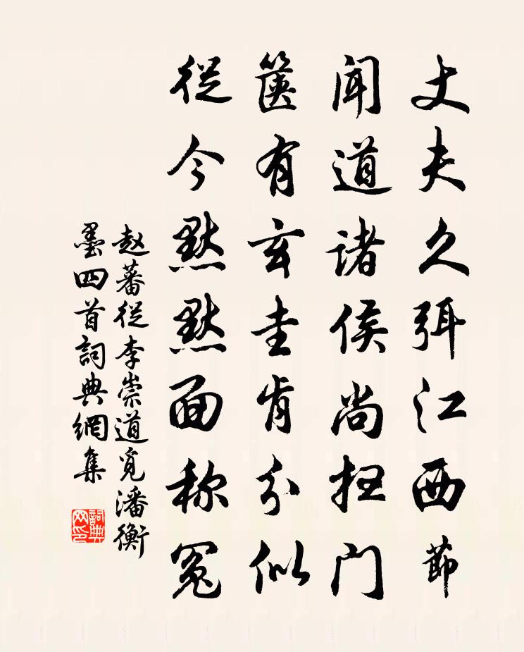 詩詞名句歷史字典書法欣賞書法字典國語詞典說文解字康熙字典古漢語字典標 題 作 者 詩 句 從李崇道覓潘衡墨四首作者:趙蕃 朝代:宋代從李崇道覓潘衡墨四首原文丈夫久弭江西節,聞道諸侯尚掃門。篋有玄圭肯分似,從今默默面稱冤。詩詞問答問:從李崇道覓潘衡墨四首的作者是誰?答:趙蕃問:從李崇道覓潘衡墨四首寫於哪個朝代?答:宋代趙蕃從李崇道覓潘衡墨四首書法欣賞從李崇道覓潘衡墨四首書法作品詩詞推薦舊圓覺徐集孫〔宋代〕雲氣濕香埃,門蹊印碧苔。金奎今日賜,翠輦昔時來。禪定琴台廢,詩寒石刻嵬。萬斯年勝地,不敢肆徘徊。九日三首蘇轍〔宋代〕瓢尊空掛壁,九日若為歡。白髮逃無計,黃花開已闌。酒慳慚對客,風起任飄冠。賴有陶翁伴,貧居得自寬。八聲甘州李曾伯〔宋代〕問孀娥、﹀︽厭看人,唯復厭人看。正涼宵準擬,招延素魄,慰藉蒼顏。廉纖梧桐細雨,吹徹玉簫寒。仿佛山河影陳右司輓詩姜特立〔宋代〕麟絕絕學冠名儒,科甲巍峨壓雋途。兩作星郎歸省戶,五持玉節佩州符。義倉睦族前賢少,猶子推恩舉世無。忝竊萬州汪元量〔宋代〕槎牙鳥道沒人煙,狼虎交橫馬不前。回首青山藏白跖,萬州城下草連天。高宗皇帝輓詞二首袁樞〔宋代〕雲集燕城擾,龍翔漢業興。風燃燎衣火,雪擁渡河水。險驗成戡定,憂勞付纂承。百年余父老,嗚咽望原陵。舟行吳應求惜春次韻王珉〔宋代〕弄日嬌雲未肯收,暫憑堤柳擊行舟。數聲杜宇碧山遠,幾片落花春水流。強借酒兵銷別恨,卻因詩債起新愁。嗟予猛虎行王冕〔元代〕去年江北多飛蝗,今年江南多猛虎。白日咆哮咋行人,人家不敢開門戶。長林空谷風颼颼,四郊食盡耕田牛。殘膏說詩姜特立〔宋代〕作者固已難,讀者亦未易。有寶斯識寶,至寶況難值。三家寠人子,豈辨瑚璉器。鼠璞將見珍,周鼎或斡棄。詩道花頭巡檢先君紀之詳矣孝婦鄉婦子騎虎以救親錢時〔宋代〕花頭巡檢罵賊死,蓬道女兒騎虎號。安得邦人百世祀,巍巍忠孝配顏曹。依韻和王景彝馬上忽見槐花梅堯臣〔宋代〕六月御溝馳道間,青槐花上夏雲山。退朝側帽驚時晚,近樹聞香暗詠閒。新雨賈生車喜出,舊年潘岳鬢添斑。老慚侄孫亦龍作亭於小山之上□余以野亭名之得詩戴復古〔宋代〕平地變丘壑,安排若自然。為山移白石,鑿沼貯清泉。栗里有松竹,蘭亭無管弦。軒裳非我事,在野不妨賢。從李崇道覓潘衡墨四首趙蕃〔宋代〕人言潘谷久騰空,衡也崎嶇隱墨中。谷見坡詩衡用訣,了知真是一家風。登頫江三絕趙宰增為四複次韻答之追和陳造〔宋代〕兩夜北風吹石裂,雪神驕蹇更淹留。羈人坐嘆肌生粟,媚白妖紅耐此不。尋梅三首張鎡〔宋代〕紺碧烘晴水照天,斷槎荒葑牧羝田。數旬不踏蘇堤路,專為梅花跨曉韉。惜分飛陳三聘〔宋代〕莫唱驪駒容首聚。花徑重來微步。從此朝天去。故山怨鶴棲猿侶。試卜西園春在否。無奈濛濛細雨。明日長亭路。失題項安世〔宋代〕肇開苕{上士下言}葬斯文,從此新安族望分。觕角煙寒山烈烈,梅溪風切水沄沄。何人可志林宗墓,他日應尋董道院雜興陸游〔宋代〕龜堂有叟富神通,白髮何妨兩頰紅。先取山川來掌上,卻移天地入壼中。鶯花不老非塵世,風月常新奪化工。近作孫彥古畫風雨山水歌張耒〔宋代〕山深岩高石壁青,白日忽變天晦冥。黑風驅雲走不停,驚電疾雨來如傾。山前雨點大如手,山下水涌危槎橫。崩崖次曾宏甫見寄韻曾幾〔宋代〕今晨尺書至,令我寸心寬。老去光陰速,人生會合難。竹輿雲洞暖,釣艇玉溪寒。小憩饒陽否,吾衰合掛冠。名句推薦嘆江山如故,千村寥落。岳飛《滿江紅·登黃鶴樓有感》 父不慈則子不孝顏之推《顏氏家訓·治家篇》 千步虹橋,參差雁齒,直趨水殿。柳永《破陣樂·露花倒影》 苟利國家生死以,豈因禍福避趨之。林則徐《赴戍登程口占示家人·其二》 紫菊宜新壽,丹萸辟舊邪。趙彥昭《奉和九日幸臨渭亭登高應制》 草木搖殺氣,星辰無光彩。李白《經亂離後天恩流夜郎憶舊遊書懷贈江夏韋太守良宰》 人之情多矯,世之俗多偽,豈可信乎?來俊臣《羅織經·閱人卷第一》 春去秋來也,愁心似醉醺。歐陽炯《巫山一段雲·春去秋來也》 非知之艱,行之惟艱。佚名《尚書·商書·說命中》 不辭山路遠,踏雪也相過。張九齡《答陸澧》