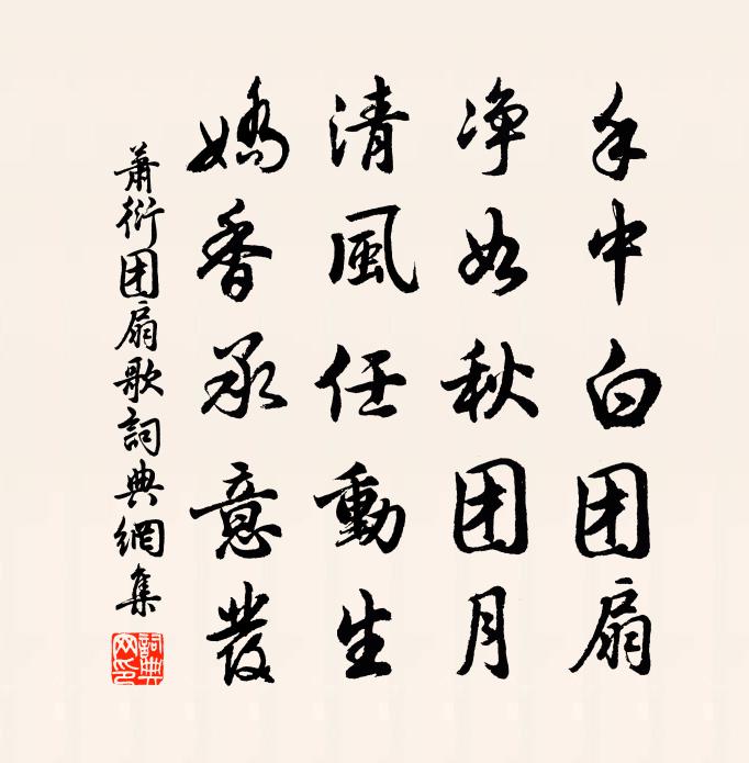 詩詞名句歷史字典書法欣賞書法字典國語詞典說文解字康熙字典古漢語字典標 題 作 者 詩 句 團扇歌作者:蕭衍 朝代:南北朝團扇歌原文手中白團扇。淨如秋團月。清風任動生。嬌香承意發。詩詞問答問:團扇歌的作者是誰?答:蕭衍問:團扇歌寫於哪個朝代?答:南北朝問:蕭衍的名句有哪些?答:蕭衍名句大全蕭衍團扇歌書法欣賞團扇歌書法作品詩詞推薦徐道士水墨屏四首白玉蟾〔宋代〕霜月沉青嶂,汀鷗臥白沙。曉風刪竹葉,秋霧補山丫。寄題奉寧樞密直諫議新葺漱玉齋宋庠〔宋代〕聞說西齋水,潺湲逼畫楹。雖添新竇響,不改故源清。花落波浮亂,杯遲屈曲行。無因陪夜宿,同賞瀑岩聲。重陽日寄韋舍人趙嘏〔唐代〕節過重陽菊委塵,江邊病起杖扶身。不知此日龍山會,誰是風流落帽人。卜運算元(題扇)蔡伸〔宋代〕玉斧斬冰輪,中有乘鸞女。鬢亂釵橫襟袖涼,只恐勸飛舉。青冥縹緲間,自有 * 侶。不向巫山十二峰,朝暮為雲閒居曾黯〔宋代〕綠髮老梅千百樹,梅邊略彴是吾家。一窗西日不知晚,十月南枝無數花。誰信閒身惟鶴伴,自憐愁眼得書遮。閉門雜曲歌辭定情樂施肩吾〔唐代〕敢嗟君不憐,自是命不諧。著破三條裾,卻還雙股釵。悲秋盧殷〔唐代〕秋空雁度青天遠,疏樹蟬嘶白露寒。階下敗蘭猶有氣,手中團扇漸無端。呈尤運使袤延之五首趙蕃〔宋代〕翰墨有先達,知己僅三數。省齋憐其貧,晦庵過其譽。懷哉介庵老,先我騎鯨去。公如幸教之,豈嘆歲不與。慶千秋佚名〔宋代〕點檢堯蓂,自元宵過了,兩莢初飛。蔥蔥鬱郁佳氣,喜溢庭闈。惟知降、月里姮娥,欣對良時。但見婺星騰瑞彩,尼長老請贊釋法薰〔宋代〕住山三十載,潦倒福緣微。全提一著,衲子攢眉。我無為山之作,汝有鐵磨之機。自知水底難撈月,卻倩丹青染污句俞瑊〔宋代〕壁山僻陋戶口少,兩衙之外惟高眠。次韻錢穆父紫薇花二首蘇軾〔宋代〕虛白堂前合抱花,秋風落日照橫斜。閱人此地知多少,物化無涯生有涯。次韻任君官舍秋雨黃庭堅〔宋代〕牆根戢戢數蝸牛,雨長垣衣亭更幽。驚起歸鴻不成字,辭柯落葉最知秋。菊花莫恨開時晚,谷穟猶思晴後收。獨立熙寧橋鄭叔僑〔宋代〕千尋水面跨長橋,隱隱晴虹臥海潮。結駟直通黃石市,連艘橫斷白湖腰。頌古釋道顏〔宋代〕胡亂三十年,不少鹽與醬。江西馬大師,南嶽讓和尚。九日戴復古〔宋代〕今日知何日,他鄉憶故鄉。黃花一杯酒,白髮幾重陽。日晚鴉爭宿,天寒雁叫霜。客中無此醉,何以敵淒涼。偈頌一百一十七首釋紹曇〔宋代〕跛腳阿師,弄蹄驢子。一字關徒費分疏,栗棘蓬恣情吞吐。凌滅祖師禪,函蓋乾坤句。孤危不立自孤危,萬仞雪崖挽林天和張元乾〔宋代〕行配古君子,齒尊鄉丈人。儻來名位晚,長往誄文新。薤露空悲臘,芻靈不見春。諸郎無過毀,壽考沒元身。五歌放牛陸龜蒙〔唐代〕江草秋窮似秋半,十角吳牛放江岸。鄰肩抵尾乍依隈,橫去斜奔忽分散。荒陂斷塹無端入,背上時時孤鳥立。日暮春翁洮〔唐代〕漠漠煙花處處通,遊人南北思無窮。林間鳥奏笙簧月,野外花含錦繡風。鸑抱雲霞朝鳳闕,魚翻波浪化龍宮。此時名句推薦恭者不侮人,儉者不奪人。孟子《孟子·離婁章句上·第十六節》 豈能無意酬烏鵲,惟與蜘蛛乞巧絲。李商隱《辛未七夕》 當年曾勝賞,生香熏袖,活火分茶。李清照《轉調滿庭芳·芳草池塘》 天闕象緯逼,雲臥衣裳冷杜甫《游龍門奉先寺》 臥聞兒女夸翁健,詩句年光一樣新劉克莊《戊午元日二首》 繁霜儘是心頭血,灑向千峰秋葉丹。戚繼光《望闕台》 桃花一簇開無主,可愛深紅愛淺紅?杜甫《江畔獨步尋花·其五》 明月照高樓,流光正徘徊。曹植《七哀》 欲治身,先治心;欲責人,先責己。宋濂、王褘《元史·列傳·卷二》 荒煙涼雨助人悲,淚染衣襟不自知。王安石《送和甫至龍安微雨》
