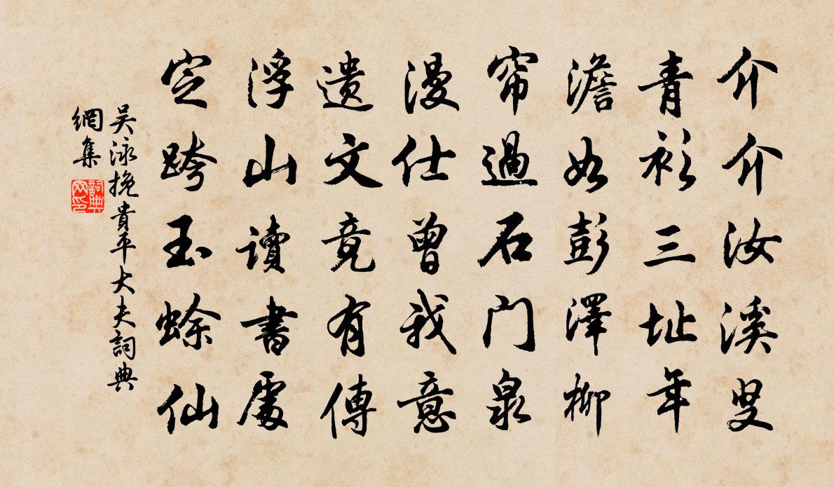 詩詞名句歷史字典書法欣賞書法字典國語詞典說文解字康熙字典古漢語字典標 題 作 者 詩 句 挽貴平大夫作者:吳泳 朝代:宋代挽貴平大夫原文介介汝溪叟,青衫三址年。澹如彭澤柳,簾過石門泉。漫仕曾我意,遺文竟有傳。浮山讀書處,定跨玉蜍仙。詩詞問答問:挽貴平大夫的作者是誰?答:吳泳問:挽貴平大夫寫於哪個朝代?答:宋代吳泳挽貴平大夫書法欣賞挽貴平大夫書法作品詩詞推薦登寧州城樓楊巨源〔唐代〕宋玉本悲秋,今朝更上樓。清波城下去,此意重悠悠。晚菊臨杯思,寒山滿郡愁。故關非內地,一為漢家羞。次單推韻張九成〔宋代〕執別動經歲,年光換莫留。壯心今已老,雅志自無求。白日將詩遣,生涯著醉酬。頹然煙瘴里,一飽更何憂。旅次聞砧李中〔唐代〕砧杵誰家夜搗衣,金風淅淅露微微。月中獨坐不成寐,舊業經年未得歸。水月院陳舜俞〔宋代〕興隨白鳥汀洲立,步入青林台殿出。湖脈來通方士泉,山顏分入幽人室。自苦扁舟每訪尋,何年空谷無遺逸。一夜夜坐求酒已盡喟然有賦陸游〔宋代〕澹月微霜夜漏徂,披裘不睡附寒爐。清笳嫋嫋已三弄,殘火熒熒才一銖。報國無期心欲折,讀書自力眼將枯。麴生李新仲圭同游醮壇歸以詩告別次韻李石〔宋代〕別去名場嘆滯留,肯來空谷話清幽。知君有約趨金馬,笑我無心對白鷗。千頃量陂能卻老,一編家學莫他求。相將梅花落江總〔隋代〕縹色動風香。羅生枝已長。妖姬墜馬髻。未插江南璫。轉袖花紛落。春衣共有芳。羞作秋胡婦。獨采城南桑。愛秋釋文珦〔宋代〕宋玉悲秋我愛秋,清秋行樂勝春遊。林疎盡見山中石,更有寒泉帶石流。挽周迪功二首杜范〔宋代〕書種開風氣,儒聲動海涯。一門團義聚,千里擇名師。重卦終須卜,留耕已可菑。賢書初入貢,玉樹影參差。減字木蘭花周邦彥〔宋代〕風鬟霧鬢。便覺蓬萊三島近。水秀山明。縹緲仙姿畫不成。廣寒丹桂。豈是夭桃塵俗世。只恐乘風。飛上瓊樓玉宇缺調名(贈道友雪崖朱先生)龔大明〔宋代〕清高絕,雪崖翁。向上玄機頓觀通。金鼎有丹成九轉,凝然宴坐白雲中。釣月樓王南美〔宋代〕居士作層樓,不愛風花雪。待得野雲收,只釣溪邊月。重宿紫芝杜耒〔宋代〕書窗隔湖水,寒氣倍馮陵。集宿因重到,新詩得再承。月明山入坐,滿渴夜敲冰。為爾二三友,令人去未能。港口野步懷歸高公泗〔宋代〕天宇空青晚更佳,溪頭滑石路欹斜。山深苦竹方抽筍,日暖甘菘始放花。莎草牆垣沾燕屎,棘針籬落聚蠶沙。預知送劉秀才歸江陵杜牧〔唐代〕彩服鮮華覲渚宮,鱸魚新熟別江東。劉郎浦夜侵船月,宋玉亭春弄袖風。落落精神終有立,飄飄才思杳無窮。誰人游臨江寺王冕〔元代〕山靈本是愛山農,況是登臨重複復。海水浮來多怪石,雲霄上接有高松。忘情淺淺溪中鳥,不雨深深洞底龍。帶甲探春慢張炎〔宋代〕列屋烘爐,深門響竹,催殘客里時序。投老情懷,薄游滋味,消得幾多淒楚。聽雁聽風雨,更聽過、數聲柔艫。暗題侯仙亭沈亞之〔唐代〕新創仙亭覆石壇,雕梁峻宇入雲端。嶺北嘯猿高枕聽,湖南山色捲簾看。拜明招二先生墓有感王柏〔宋代〕神臯王氣點腥羶,爵命今年下日邊。俎豆孔堂新劍佩,風煙晉國舊山川。姑孰十詠李白〔唐代〕姑孰溪愛此溪水閒,乘流興無極。漾楫怕鷗驚,垂竿待魚食。波翻曉霞影,岸疊春山色。何處浣紗人?紅顏未相識名句推薦痴兒不知父子禮,叫怒索飯啼門東。杜甫《百憂集行》 談歡則字與笑並,論戚則聲共泣偕劉勰《文心雕龍·誇飾》 但見淚痕濕,不知心恨誰。李白《怨情》 長風幾萬里,吹度玉門關。李白《關山月》 雞聲茅店月,人跡板橋霜。溫庭筠《商山早行》 露葉翻風驚鵲墜。暗落青林紅子。陳師道《清平樂·秋光燭地》 石欄斜點筆,桐葉坐題詩杜甫《重過何氏五首》 政之所興,在順民心。管仲《管子·牧民》 新來雁闊雲音,鸞分鑒影,無計重見。盧祖皋《宴清都·初春》 美之所在,雖污辱,世不能賤;惡之所在,雖高隆,世不能貴。劉安及其門客《淮南子·說山訓》