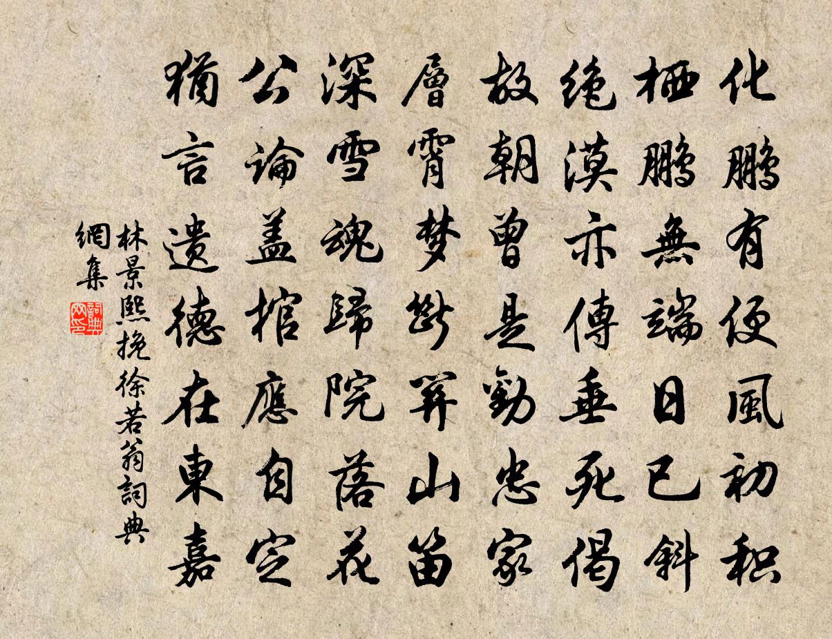 詩詞名句歷史字典書法欣賞書法字典國語詞典說文解字康熙字典古漢語字典標 題 作 者 詩 句 挽徐若翁作者:林景熙 朝代:宋代挽徐若翁原文化鵬有便風初積,棲鵬無端日已斜。絕漠亦傳垂死偈,故朝曾是勸忠家。層霄夢斷關山笛,深雪魂歸院落花。公論蓋棺應自定,猶言遺德在東嘉。詩詞問答問:挽徐若翁的作者是誰?答:林景熙問:挽徐若翁寫於哪個朝代?答:宋代林景熙挽徐若翁書法欣賞挽徐若翁書法作品詩詞推薦最多宜賀鑄〔宋代〕半解香銷撲粉肌。避風長下絳紗帷。碧琉璃水浸瓊枝。不學壽陽窺曉鏡,何煩京兆畫新眉。可人風調最多宜。高兄徐倉高弟和劉公之兩絕見寄再韻謝之杜范〔宋代〕我輩周旋實地中,此身窮處此心通。荷君一見如平素,跡未相親味已同。懶牛釋惟一〔宋代〕鼻繩拽脫了無拘,慵有餘兮頑有餘。芳草滿前渾不雇,眠雲臥月只如如。有懷十首劉子翬〔宋代〕風驚枯葦白花浮,欲下橫橋晚更留。惆悵不逢吳季子,一溪寒水帶煙流。松陵晚泊武衍〔宋代〕漭漭風濤外,天隨底處尋。碧雲千嶂暝,紅樹九秋深。故國荒城夢,空江倦客心。行藏那復計,篷月闖孤斟。會亭遇資政孫公赴闕公致仕已七年時召歸將有蔡襄〔宋代〕志節雖落落,不能無謗毀。壯年自雄豪,末路遽顛委。眾口方叢嘈,即欲置之死。公嘗為大臣,沈冤不辯理。恭惟朝中措(上錢知郡、符主管、朱知錄三首)趙長卿〔宋代〕南樓風物一番新。春暮畀斯民。豈但仁人愷弟,更兼政事如神。人生最貴,榮登五馬,千里蒙恩。祗恐促歸廊廟,留別王嘉叟檢正喻良能〔宋代〕四海望霖雨,一人須股肱。我本田家子,蹉跎將暮齡。相逢豈在早,一見蓋已傾。謂我雖禿犀,敝帚亦足稱。持獻阻水戲呈幾復二首黃庭堅〔宋代〕秋風落木秋天高,月入金樽動酒豪。過眼衰榮等昏曉,勿嗟遲速把心勞。寄答桂府黃殿院釋希晝〔宋代〕桂水在天末,登高生遠思。來書逢歲闕,去夢歷峰危。別浦珠全返,空台柏半衰。詩成見新月,幾負郡齋期。和子山種花文同〔宋代〕風流從事季長家,繞遍官居種盡花。應為清才無比敵,擬將文彩競春華。論語聞政章四首陳普〔宋代〕盡心盡性自儀刑,得有相知道可行。萬世無窮乾祿法,深勞子貢不推明。潭州留別杜員外院長韋迢〔唐代〕江畔長沙驛,相逢纜客船。大名詩獨步,小郡海西偏。地濕愁飛鵩,天炎畏跕鳶。去留俱失意,把臂共潸然。奉和御製千葉黃牡丹夏竦〔宋代〕千葉繁英吐異芳,中央瑞色藹清香。密攢鶯羽參差折,細疊霓裳次第黃。霧鎖天衣臨翠幄,露傾金盞瀝霞漿。聖明奉和李相公早朝於中書候傳點,偶書所懷奉呈呂溫〔唐代〕禁門留騎吹,內省正衣冠。稍辨旗常色,尚聞鐘漏殘。九天爐氣暖,六月玉聲寒。宿霧開霞觀,晨光泛露盤。致君寄和邢子屑孫肖之始春見寄王銍〔宋代〕東風初到亂山頭,無數殘梅雨未收。何待傷春對晴景,暝雲橫盡古今愁。失調名佚名〔宋代〕春色惱人眠不得。和之美舟行雜詩八首都門路司馬光〔宋代〕紅塵書夜飛,車馬古今跡。獨憐道傍柳,慘澹少顏色。古絕句四首佚名〔兩漢〕其一藁砧今何在,山上復有山。何當大刀頭,破鏡飛上天。其二日暮秋雲陰,江水清且深。何用通音信,蓮花玳瑁塞鴻秋·春情張可久〔元代〕疏星淡月鞦韆院,愁雲恨雨芙蓉面。傷情燕足留紅殘,惱人鸞影閒團扇。獸爐沉水煙,翠沼殘花片。一行寫入相思名句推薦龜游蓮葉上,鳥宿蘆花里。李白《姑孰十詠》 同惡相助,同好相留,同情相成,同欲相趨,同利相死。司馬遷《史記七十列傳·吳王濞列傳》 上林訊息好,鴻雁已歸來。張元乾《臨江仙·送宇文德和被召赴行在所》 瀚海百重波,陰山千里雪。李世民《飲馬長城窟行》 山驛淒涼,燈昏人獨寢。陸游《清商怨·葭萌驛作》 朝雲亂人目,帝女湘川宿。吳均《登二妃廟》 野臣潛隨擊壤老,日下鼓腹歌可封。鮑防《元日早朝行》 春江暖漲桃花水。畫舫珠簾,載酒東風裡。顧德輝《蝶戀花·春江暖漲桃花水》 滿地殘紅宮錦污,昨夜南園風雨。王安國《清平樂·春晚》 所作福德不應貪著。鳩摩羅什譯《金剛經·不受不貪》