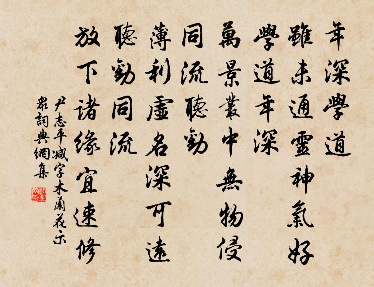 詩詞名句歷史字典書法欣賞書法字典國語詞典說文解字康熙字典古漢語字典標 題 作 者 詩 句 減字木蘭花 示眾作者:尹志平 朝代:元代減字木蘭花 示眾原文年深學道。雖未通靈神氣好。學道年深。萬景叢中無物侵。同流聽勸。薄利虛名深可遠。聽勸同流。放下諸緣宜速修。詩詞問答問:減字木蘭花 示眾的作者是誰?答:尹志平問:減字木蘭花 示眾寫於哪個朝代?答:元代問:減字木蘭花 示眾是什麼體裁?答:詞尹志平減字木蘭花 示眾書法欣賞減字木蘭花 示眾書法作品詩詞推薦跋張明府獨樂園圖二首方回〔宋代〕熙寧相住半山寺,元佑人宗獨樂園。早起庵中釣魚手,未應宣靖失中原。漁父史衛卿〔宋代〕白頭長是醉,湖海不知年。活業惟耕網,全家祇住船。荷花同鷺宿,楊柳得魚穿。一笛吹明月,朱門謾管弦。書安象祖靜軒有感徐元傑〔宋代〕太極即人極,坤爻德不孤。直方真主宰,敬靜實功夫。老檜霜中乾,寒梅雪裡株。常惺惺法處,收斂物俱無。偈頌五十一首釋大觀〔宋代〕見見之時,雨洗淡紅桃萼嫩。見非是見,風搖淺碧柳絲輕。見猶離見,白雲影里怪石露。見莫能及,流水光中古木滿庭芳馬鈺〔元代〕家緣猛棄,更不疑惑。辨認陰魂陽魄。咄出屍蟲,屏盡氣財酒色。好事先人後己,做憨憨、有似彌勒。修大道,處擣衣曲熊禾〔宋代〕北望肉悠悠音信肉少,空房肉念遠心常肉早。流螢煜煜夜稍清,寒雁嗈嗈寒已到。細絲清水練方新,在椸半濕日中論詩三十首·其五元好問〔金代〕縱橫詩筆見高情,何物能澆塊壘平。老阮不狂誰會得,出門一笑大江橫。皇太妃合春帖子五首蘇頌〔宋代〕聖皇欽翼孝心存,宮合深沉母道尊。初慶新陽生嶰律,又聞清蹕過堯門。歲晚王邁〔宋代〕月映林塘澹,風含笑語語涼。俯窺憐綠淨,小立佇幽香。攜幼尋新菂,扶衰坐野航。延緣久未已,歲晚惜流光。紹興以後祀感生帝十六首佚名〔宋代〕[圜鍾為宮]炎精之神,飛{左車右井}碧落。駕以浮雲,丹書赤雀。禮人豆籩,樂諧簫勺。神具醉止,佑我景鑠清心鏡 戒掉粉洗面馬鈺〔元代〕出家兒,貪美膳。不顧拋撒,掉粉洗面。吃素簽、包子假黿,甚道家體面。美口腹,非長便。粗茶淡飯,且填坑塹頌古四十五首釋如珙〔宋代〕托缽回身去,鐘鼓未鳴時。不會末後句,只有心奯知。婁忠簡公輓詞樓鑰〔宋代〕寮寀侍儲闈,如公久任稀。載欣商皓起,終惜漢疏歸。問字煩參訂,談經賴發揮。一書真總要,星日重光輝。贈雲山逸人劉巨川瞽而談命家鉉翁〔宋代〕世人具眼知多少,見山不如雲山好。斯人背境自觀心,識破雲山千萬層。須知萬物備於我,高下散殊何往而非道。設醮洞霄因以古詩記其事章承道〔宋代〕鶴鳴在野聲聞天,靈壇夜醮朝群仙。群仙乘風駕雲軿,一一來自虛皇前。玉鑪不散香凝煙,火中金縷光相連。仙官謝永新大夫楊叔袼惠詩楊萬里〔宋代〕今代吾家後子云,新詩也解乞陳人。銀河波浪痕痕玉,花縣風光字字春。大勝十年燈火讀,更無半點簿書塵。鶚章東帥張傳之遣人來相致將以七言次韻答之三首李壁〔宋代〕質非高古謝罍樽,漫向陳編挹聖言。久判餘生甘掃墓,尚懷先友欲登門。功名自昔歸羊傅,丘壑從來著謝鯤。何日金陵道陸龜蒙〔唐代〕北雁行行直,東流澹澹春。當時六朝客,還道帝鄉人。夏晚江行真山民〔宋代〕行盡山頭路,江空帶夕暉。風蟬聲不定,水鳥影同飛。蕭散烏藤杖,輕鬖白榮衣。試呼垂釣者,分我半苔磯。如夢令蔡伸〔宋代〕今夜行云何處。還是月華當午。倚遍曲闌橋,望斷錦屏歸路。空去。空去。夢到綠窗朱戶。名句推薦黯與山僧別,低頭禮白雲。李白《秋浦歌十七首》 富貴本無根,盡從勤里得。馮夢龍《醒世恆言·卷三十五》 君不見管鮑貧時交,此道今人棄如土。杜甫《貧交行》 今日獨來香徑里,更無人跡有苔錢。韓偓《寒食日重遊李氏園亭有懷》 紛紛暮雪下轅門,風掣紅旗凍不翻。岑參《白雪歌送武判官歸京》 夭夭園桃,無子空長。曹丕《煌煌京洛行》 編草結庵,不違涼暑。蕭子顯《南齊書·列傳·卷四十》 竹塢無塵水檻清,相思迢遞隔重城。李商隱《宿駱氏亭寄懷崔雍崔袞》 八月寒葦花,秋江浪頭白。李頎《送劉昱》 以身教者從,以言教者訟。范曄《後漢書·列傳·第五鍾離宋寒列傳》
