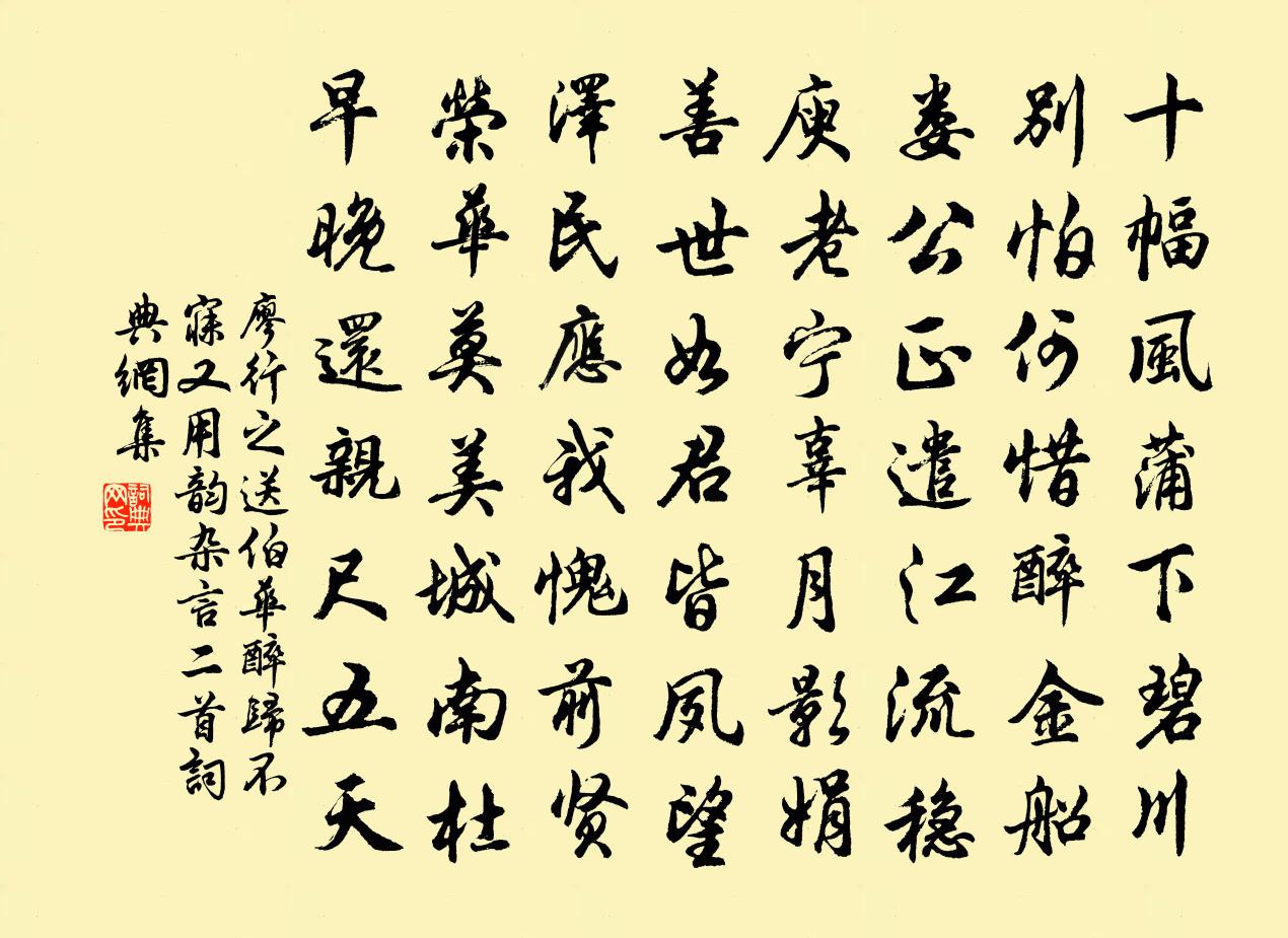 詩詞名句歷史字典書法欣賞書法字典國語詞典說文解字康熙字典古漢語字典標 題 作 者 詩 句 送伯華醉歸不寐又用韻雜言二首作者:廖行之 朝代:宋代原文十幅風蒲下碧川,別怕何惜醉金船。婁公正遣江流穩,庾老寧辜月影娟。善世如君皆夙望,澤1|1民應我愧前賢。榮華莫美城南杜,早晚還親尺五天。詩詞問答問:《送伯華醉歸不寐又用韻雜言二首》的作者是誰?答:廖行之問:該詩寫於哪個朝代?答:宋代書法欣賞送伯華醉歸不寐又用韻雜言二首書法作品詩詞推薦扇子詩李石〔宋代〕亂紅亂紫滿林塘,旋掃苔莓一逕香。寒食年年新火令,落花何必恨風狂。浣溪沙(八之七)鄧肅〔宋代〕半醉依人落珥簪。天香不數海南沈。時傾秋水話春心。已覺 * 歸碧落,從今禊飲笑山陰。金杯休惜十分深。孫芝田見示吟編一詩卷錦楊公遠〔宋代〕細誦芝田詩一編,了無鑿自天然。豪雄虹抹斜陽外,雅淡梅橫缺月邊。點石化金非是幻,脫胎換骨欲成仙。個般才和蘇適春雪八首張耒〔宋代〕溪上泛舟成底事,庵前夜立意如何。爭知萬頃青青麥,絕勝黃河一尺波。次韻李元叔田邦鎮唱酬之什沈與求〔宋代〕大雅寂寥誰發喜,逆折波瀾須子美。晚分一派大江西,約束曹劉歸句里。武安耳孫有臞儒,載行無多一束書。蹇驢再題半峰亭蔣堂〔宋代〕何名半峰亭,堯峰路之半。遊客趨層崖,斗上多股戰。寶雲構此軒,接引心不倦。所冀冠蓋來,少休松石畔。雄視頌古四十八首釋慧開〔宋代〕諸方深與淺,都在掌握中。撐天並拄地,隨處振宗風。滿庭芳佚名〔宋代〕星宿呈祥,溪山鍾秀,凜然生此真賢。冰清玉潤,還稱歲寒天。正是梅梢醞雪,探江南,春信先傳。庭軒爽,涓涓和陸明叟施樞〔宋代〕了無閒事上眉纖,一炷清薌靜晝簾。造化自從回暖律,芬華頓覺轉窮檐。輕風度柳春情薄,細雨催化土脈黏。所愧和楊縣尉五首陳宓〔宋代〕昧者不自覺,役役塵土中。丈夫意有在,肯與兒輩同。毫錐可濟世,不論汗馬功。得君起予句,使我銘諸胸。送舶使王監丞劉克莊〔宋代〕一琴不鼓攜歸浙,六轡如絲送入閩。魁傑西州今有汝,典司南庫豈無人。牙籌何足煩名勝,厘席方將問鬼神。公幹學進士作大方無隅二首劉克莊〔宋代〕趨出範圍表,蓆子主之大。理同然不異,隅至此俱無。聖豈東西判,游何內外拘。鵠邊天浩浩,蝸角國區區。廣可江南春·波渺渺寇準〔宋代〕波渺渺,柳依依,孤村芳草遠,斜日杏花飛。江南春盡離腸斷,苹滿汀洲人未歸。次彥時兄苦旱韻王之道〔宋代〕斗粟衡門且自安,老來筋力厭辛酸。官遊動是三年別,邂逅應容一笑歡。荷浦珠聯秋露溢,稻田龜坼暑風乾。昨朝戲詠玉簪花金線草二物舒岳祥〔宋代〕金線草頭蜂展翅,玉簪花頷鷺生兒。窗前野草皆天巧,也有閒人為賦詩。月夜散策縣圃,有飛蝶,仍聞笛聲楊萬里〔宋代〕月明未許人早睡,笛聲鮮與秋爭清。夜深不應有飛蝶,渠儂似欲伴人行。次韻黃貳車三絕句史彌寧〔宋代〕菩提坊里著詩豪,佳木繁陰暑易逃。不用移文勒回駕,箇中境界盡清高。光上人求語釋亮〔宋代〕光明寂照偏河沙,認著依前滿眼化。喪盡諸緣回首看,寥寥四顧絕周遮。絕周遮處未為是,更須知有社師關。透得安德山池宴集岑文本〔唐代〕甲第多清賞,芳辰命羽卮。書帷通行徑,琴台枕槿籬。池疑夜壑徙,山似郁洲移。雕楹網蘿薜,激瀨合塤篪。鳥戲頌古一百則釋正覺〔宋代〕巍巍堂堂,磊磊落落。鬧處刺頭,穩處下腳。腳下線斷我自由,鼻端泥盡君休斲。莫動著,千年故紙中合藥。名句推薦舉頭西北浮雲,倚天萬里須長劍。辛棄疾《水龍吟·過南劍雙溪樓》 雲雷,屯;君子以經綸。佚名《易傳·象傳上·屯》 綠葉翠莖,冒霜停雪。左思《三都賦》 四海皆兄弟,誰為行路人。佚名《舊題蘇武詩 / 別詩四首·其一》 宰相必起於州部,猛將必發於卒伍。韓非及後人《韓非子·顯學》 天清一雁遠,海闊孤帆遲。李白《送張舍人之江東》 後夜相思,塵隨馬去,月逐舟行。劉過《柳梢青·送盧梅坡》 故鄉歸去千里,佳處輒遲留。蘇軾《水調歌頭·安石在東海》 立身之道何窮,只得一敬字,便事事皆整。王永彬《圍爐夜話·第一六三則》 女子今有行,大江溯輕舟。韋應物《送楊氏女》