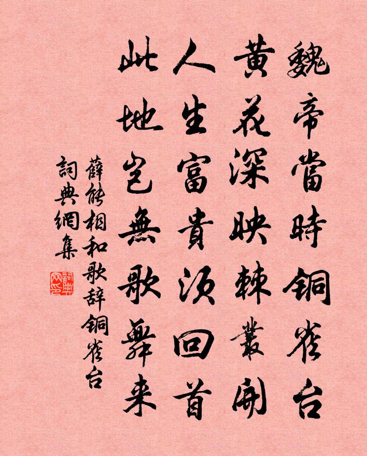 詩詞名句歷史字典書法欣賞書法字典國語詞典說文解字康熙字典古漢語字典標 題 作 者 詩 句 相和歌辭。銅雀台作者:薛能 朝代:唐代相和歌辭。銅雀台原文魏帝當時銅雀台,黃花深映棘叢開。人生富貴須回首,此地豈無歌舞來。詩詞問答問:相和歌辭。銅雀台的作者是誰?答:薛能問:相和歌辭。銅雀台寫於哪個朝代?答:唐代問:相和歌辭。銅雀台是什麼體裁?答:七絕薛能相和歌辭。銅雀台書法欣賞相和歌辭。銅雀台書法作品注釋全唐詩:卷561-37詩詞推薦賜劉輝及第宋仁宗〔宋代〕治世求才重,公朝校藝精。臨軒升造士,入彀得群英。並躡雲梯峻,聯登桂籍榮。庇民思善政,慈惠體予情。懷蘇門山晃沖之〔宋代〕昔在新中日,蘇門歲一游。石連沙鑿鑿,水繞竹悠悠。丘壑從茲得,江山及此不。吾衰思卜築,城闕恨淹留。挽朱倅周卿趙善括〔宋代〕威畹芝蘭秀,儒宗金玉相。解牛無肯綮,馳驥阻康莊。政術今猶誦,家風久益彰。蘊藏初未試,盛德付諸郎。圓書記之錢唐釋智愚〔宋代〕誰管點魚上竹竿,拚身捱得髑髏乾。者回歸去西湖上,犢草鷗波不亂看。晚泊金陵水亭杜荀鶴〔唐代〕江亭當廢國,秋景倍蕭騷。夕照殘荒壘,寒潮漲古濠。就田看鶴劣,隔水見僧高。無限前朝事,醒吟易覺勞。方壺何澹〔宋代〕玉壺清景面瑤池,便入丹青也自宜。挾冊幾回成獨往,壺公應笑一書痴。逍遙詠宋太宗〔宋代〕如來秘法諭恆沙,須是鉛開汞上花。燒鍊勿令傷血脈,凡情散亂損黃牙。離男合度分明說,坎女和同不用夸。大矣西齋見雪寄呈靖彥惠宋庠〔宋代〕歲陰休沐坐空齋,集霰飄霙次第來。仙粉有痕緣幌入,亂花無數覓叢開。故裘御濕便羔袖,凍醴扶衰藉藥杯。向暮長子第一百四十九文天祥〔宋代〕大兒聰明到,青歲已摧頹。迴風吹獨樹,吾寧舍一哀。雜劇·裴少俊牆頭馬上白樸〔元代〕第一折(沖末扮裴尚書引老旦扮夫人上,詩云)滿腹詩書七步寸,綺羅衫袖拂香埃。今生坐享榮華福,不是讀書那題畫四首唐寅〔明代〕紅樹中間飛白雲,黃茅眼底界斜曛。此中大有逍遙處,難說與君畫與君。簡郡中諸生韋應物〔唐代〕守郡臥秋閣,四面盡荒山。此時聽夜雨,孤燈照窗間。藥園日蕪沒,書帷長自閒。惟當上客至,論詩一解顏。點絳唇晁端禮〔宋代〕我也從來,喚做真箇收拾定。據伊情性。怎到如今恁。撋就百般,終是心腸狠。應難更。是我薄命。不怨奴薄倖。謝葉致政送芍藥喻良能〔宋代〕佳葩如美人,艷態妖且閒。葉園美無度,有花字雌丹。晨妝謝膏沐,秀色若可餐。芳根裹春泥,舉贈不作難。{左九日洪咨夔〔宋代〕老無擘畫笑柴桑,兩眼惺惺菊自黃。渠更笑人無菊把,拒霜相對過重陽。和枯崖悟上人韻胡仲弓〔宋代〕相逢疑夙昔,不擬定交初。饋我詩盈軸,知君腹有書。空門容不得,吟屬問何如。雲是湯休輩,毋令相見疎。幽居陸游〔宋代〕遶屋巉巉碧玉峰,箇中天遣養疏慵。捐書已嘆空虛腹,得酒還澆壘塊胸。曲幾坐看窺戶月,短蓬臥聽隔城鍾。柴桑黃梅五首陳師道〔宋代〕異色深宜晚,生香故觸人。不施千點白,別作一家春。偈頌四十一首釋慧暉〔宋代〕寂滅真功元無體,無功妙旨太深深。同中有異粗中細,異中有同念里心。子夜四時歌:冬歌李白〔唐代〕明朝驛使發,一夜絮征袍。素手抽針冷,那堪把剪刀。裁縫寄遠道,幾日到臨洮。名句推薦嵩雲秦樹久離居,雙鯉迢迢一紙書。李商隱《寄令狐郎中》 商葉墮乾雨,秋衣臥單雲。孟郊《秋懷十五首》 會當凌絕頂,一覽眾山小。杜甫《望岳》 迴廊遠砌生秋草,夢魂千里青門道。馮延巳《菩薩蠻·迴廊遠砌生秋草》 奇謀報國,可憐無用,塵昏白羽。朱敦儒《水龍吟·放船千里凌波去》 人心不足蛇吞象。馮夢龍《警世通言·卷二十五》 欺君為大,加諸罪無可免;枉法不容,縱其為禍方懲。來俊臣《羅織經·謀劃卷第九》 花谷依然,秀靨偷春小桃李。吳文英《荔枝香近·送人游南徐》 誰知萬里客,懷古正躊躕。陳子昂《峴山懷古》 鍥而舍之,朽木不折;鍥而不捨,金石可鏤。荀子《荀子·勸學》