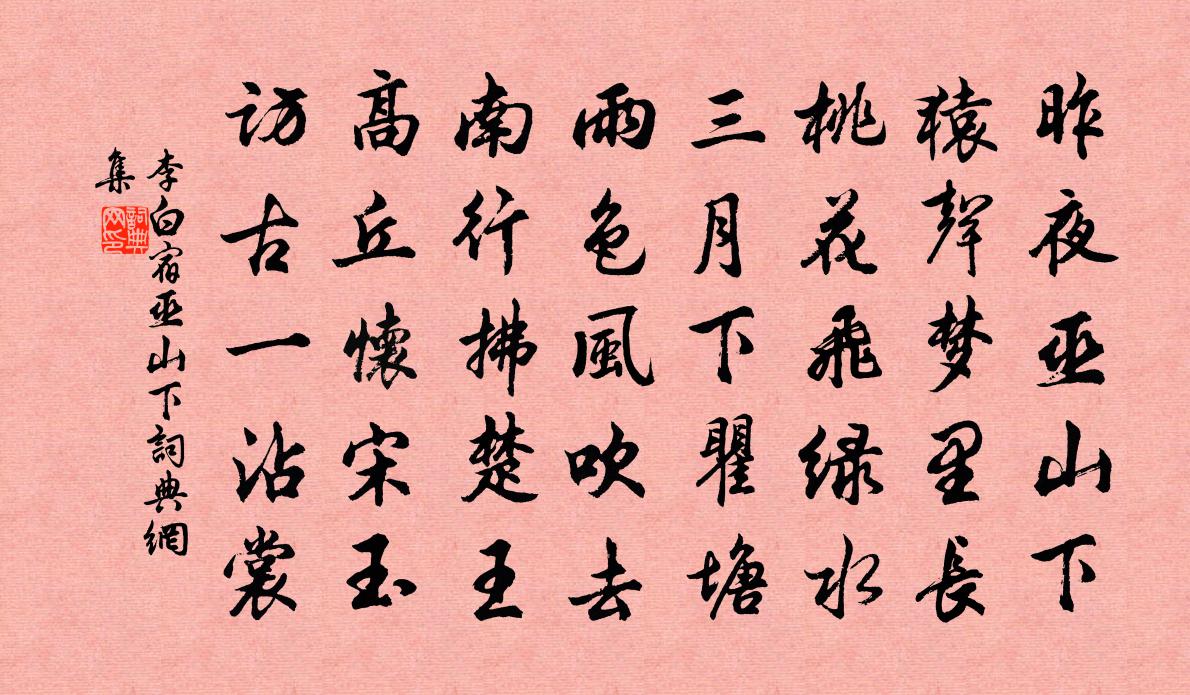 李白的《宿巫山下》是詩人個性改造和理想化了的圖景。全詩注重把握整體的氣勢和氛圍“昨夜巫山下,猿聲夢裡長”,憑個性的感興潑墨寫意“雨色風吹去”、“訪古一沾裳”,而略去具體的細節,甚至連觀照景物的視覺轉移的順序也往往毫不在意“桃花飛綠水,三月下瞿塘”。李白的這首抒情詩,把瞿塘峽—巫山物色和特定的情緒滲透、交融在一起,在“景”的形勢和“情”的特徵之間,表達自己的心境。