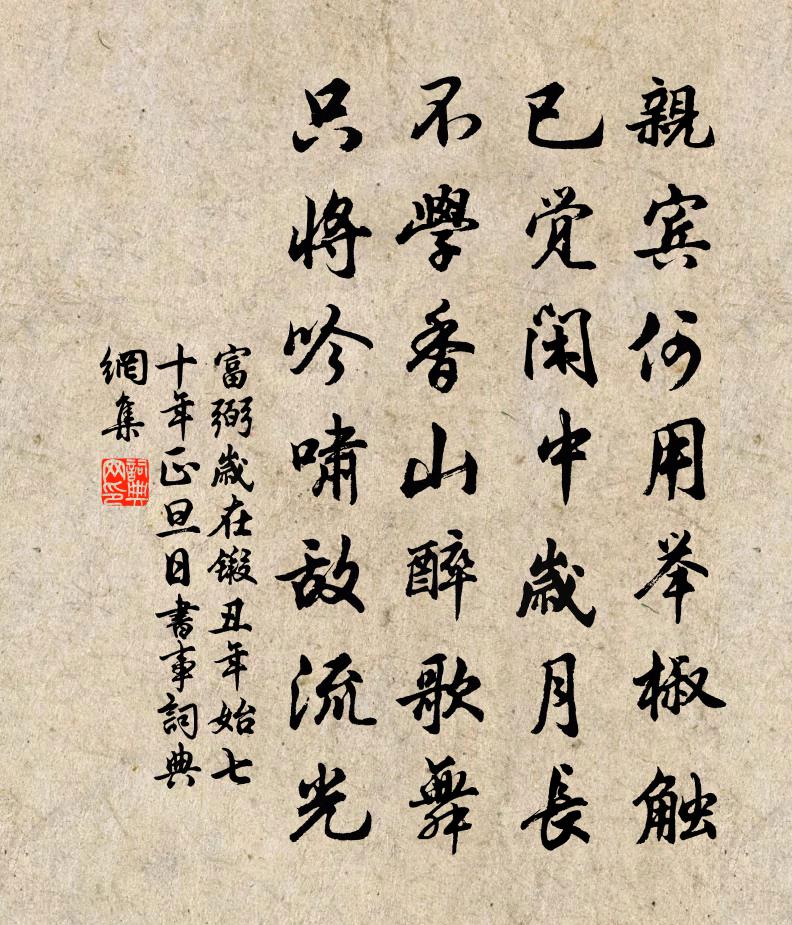詩詞名句歷史字典書法欣賞書法字典國語詞典說文解字康熙字典古漢語字典標 題 作 者 詩 句 歲在鍛丑年始七十年正旦日書事作者:富弼 朝代:宋代原文親賓何用舉椒觸,已覺閒中歲月長。不學香山醉歌舞,只將吟嘯敵流光。詩詞問答問:《歲在鍛丑年始七十年正旦日書事》的作者是誰?答:富弼問:該詩寫於哪個朝代?答:宋代書法欣賞歲在鍛丑年始七十年正旦日書事書法作品詩詞推薦菩薩蠻(十一之二)賀鑄〔宋代〕章台遊冶金龜婿。歸來猶帶醺醺醉。花漏怯春宵。雲屏無限嬌。絳紗燈影背。玉枕釵聲碎。不待宿酲銷。馬嘶催早六十五春寒吟七首方回〔宋代〕清曉林禽百種鳴,春寒漸暖變新聲。向陽死草青先茁,解凍枯池綠再生。太子四門何足怪, * 三海自堪驚。回頭和陳勉仲四首王之道〔宋代〕拍天湖水注東關,水外漁舟破浪還。誰似老僧閒有味,清風一榻面佳山。湖上有作陳輔〔宋代〕平湖共天遠,浸月坐寒光。乘流溯荃璧,掉舟尋藥房。佳人折輕荷,隨風來珍香。顧盼但微笑,眉宇何清揚。日暮湖上陸游〔宋代〕今朝雨初晴,湖上好天色;落梅紛可藉,桑柳亦已拆。老夫病良已,並水散輕策。冉冉春物新,忽忽衰發白。四方詠史上袁紹陳普〔宋代〕田豐襲許計非良,沮授安民策最長。己克百安牢按甲,足鞿曹操到分香。送李宜德為縣太原韓維〔宋代〕昔叨符守訪鄉評,守節安貧得水名。道在莫嗟為邑晚,祿微須喜及親榮。風吹白菊籬邊別,雨落黃榆塞下行。善撫浣溪沙·十八年來墮世納蘭性德〔清代〕十八年來墮世間,吹花嚼蕊弄冰弦。多情情寄阿誰邊。紫玉釵斜燈影背,紅綿粉冷枕函偏。相看好處卻無言。小重山 秋思張玉娘〔元代〕秋入瑤台玉簟涼。藕花香暗度、紫荷鄉。軟□羅扇動清商。霜漸老,庭外菊初黃。眉月畫應慵瘦*□對鏡、怨容光江月樓秦觀〔宋代〕仙翁看月三百秋,江波日去月不流。肯因炎塵暝空闊,直與江月同清幽。蒼梧雲氣眉山雨,玉簫三年無今古。九天禪人並化主寫真求贊釋正覺〔宋代〕地水火風,因緣會同。見聞知覺,門戶疏通。隨宜而得用,及盡而亡功。明白機輪還自轉,相逢誰識大家翁。次韻泮宮直宿早秋四首傅察〔宋代〕泮宮深閉絳帷空,遙想佳人照綺櫳。閒倚畫屏憐永夜,懶搖紈扇引涼風。直疑令史歸天上,猶想陽台入夢中。展轉至葉城陳與義〔宋代〕蘇武初逢雁,王喬欲借鳧。深知念行李,為報了長途。難穩三更枕,遙憐五歲雛。卻思正月事,不敢恨榛蕪。聚星堂詠雪贈歐公杜衍〔宋代〕嘗聞作者善憑議,詠雪言白菲精思。及窺古人今人詩,未能一一去其類。不將柳絮比輕揚,即把梅花作形似。或夸憶江南·春去也劉禹錫〔唐代〕春去也,多謝洛城人。弱柳從風疑舉袂,叢蘭裛露似沾巾。獨坐亦含嚬。情詩其六倉央嘉措〔清代〕入山投謁得道僧,求教上師說因明。爭奈相思無拘檢,意馬心猿到卿卿。句邵伯溫〔宋代〕閬苑南邊第一州,江山勝絕對城樓。鐘山寺樂史〔宋代〕千峰夾一徑,一徑花枕泉。聽泉復看花,行到鐘山前。古寺雲生屋,高僧月伴禪。自慚留一宿,區馬又朝天。陪戴祖禹泛湖分韻得天字仇遠〔宋代〕冉冉夕陽紅隔雨,悠悠野水碧連天。山分秋色歸紅葉,風約苹香入釣船。鐘鼓園林已如此,衣冠文物故依然。當歌宮詞張公庠〔宋代〕銀漢橫斜近建章,九重深靜閉蘭房。六更未覺晨光動,自是仙家日月長。名句推薦不用思量今古,俯仰昔人非。蘇軾《八聲甘州·寄參寥子》 如何亡國恨,盡在大江東!屈大均《秣陵》 重陽獨酌杯中酒,抱病起登江上台。杜甫《九日五首·其一》 天地之道,博也、厚也、高也、明也、悠也、久也。子思《中庸·第二十六章》 人生在勤,不索何獲。范曄《後漢書·列傳·張衡列傳》 泠泠七弦上,靜聽松風寒。劉長卿《聽彈琴》 金剛則折,革剛則裂。劉向《說苑·敬慎》 鴛鴦俱是白頭時,江南渭北三千里。賀鑄《惜余春·急雨收春》 攜壺酌流霞,搴菊泛寒榮。李白《九日》 一年滴盡蓮花漏。碧井酴酥沈凍酒。毛滂《玉樓春·己卯歲元日》