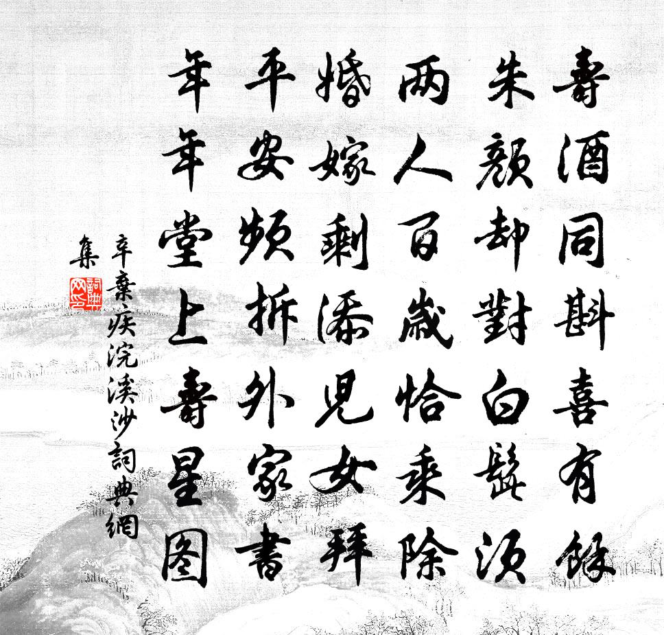 詩詞名句歷史字典書法欣賞書法字典國語詞典說文解字康熙字典古漢語字典標 題 作 者 詩 句 浣溪沙作者:辛棄疾 朝代:宋代浣溪沙原文壽酒同斟喜有餘。朱顏卻對白髭鬚。兩人百歲恰乘除。婚嫁剩添兒女拜,平安頻拆外家書。年年堂上壽星圖。詩詞問答問:浣溪沙的作者是誰?答:辛棄疾問:浣溪沙寫於哪個朝代?答:宋代問:浣溪沙是什麼體裁?答:詞問:辛棄疾的名句有哪些?答:辛棄疾名句大全辛棄疾浣溪沙書法欣賞浣溪沙書法作品詩詞推薦五君詠五首李趙公嶠張說〔唐代〕李公實神敏,才華乃天授。睦親何用心,處貴不忘舊。故事遵台閣,新詩冠宇宙。在人忠所奉,惡我誠將宥。南浦一翦梅 三首寓意寄故人謝應芳〔元代〕崑岡火烈去年時,玉也灰飛。石也灰飛。鶴長鳧短總休提。善有天知。惡有天知。今年快活保妻兒。歌也相宜。舞寒山拾得贊釋智遇〔宋代〕五峰石,雙澗松邊。是者伎倆,莫罵豐乾。吳給事輓詞項安世〔宋代〕我來鏡水問遺民,想見堂堂報國身。五月陂塘三百里,千年廟學一番新。世傳風烈今無數,自許經行得最親。一讀戀繡衾蕭崱〔宋代〕倚闌間看燕定巢。舊彈箏、因病久拋。畫不盡、殘眉黛,被東風、吹在柳梢。曉來暗理傷春曲,把金釵、枕畔細敲夜與鄰幾持國歸梅堯臣〔宋代〕紅塵夜不息,橫衢若煙霧。朝見車馬來,暮見車馬去。車中目炯炯,馬上情遽遽。交相知是誰,飛先無覓處。春暖贈梅喜作二首陳造〔宋代〕晴日烘開栗玉葩,懶隨霰雪送年華。淮鄉地冷開雖晚,竟是人間第一花。偈頌一百二十三首釋祖欽〔宋代〕晨朝吃粥,齋時吃飯,人人盡知有。開單展缽,拈匙放筯,一一不借他人手。春歸五首 其五朱淑真〔宋代〕平疇交綠藹成陰,梅豆初肥酒味新。門外好禽情分熟,不知春去尚啼春。青玉案黃公度〔宋代〕鄰雞不管離懷苦。又還是、催人去。回首高城音信阻。霜橋月館,水村煙市,總是思君處。裛殘別袖燕支雨。謾留飲酒詩四首秦觀〔宋代〕客從南方來,酌我一甌茗。我酌初不啜,強啜且復醒。既鑿渾沌氏,遂出華胥境。操戈逐儒生,舉觴還酩酊。送關小師還金陵皎然〔唐代〕如何有歸思,愛別欲忘難。白鷺沙洲晚,青龍水寺寒。蕉花鋪淨地,桂子落空壇。持此心為境,應堪月夜看。庚午春作釋行海〔宋代〕相逢處處說干戈,又報天驕走渡河。鄉國不知音問少,友朋無奈別離多。楊花漠漠迷春思,芳草萋萋感暮歌。猿鳥和同年春日韻五首袁說友〔宋代〕雨膏風軟草煙低,處處春來處處知。尤喜梅花未輕褪,枝頭一朵尚凝脂。幼作鄭愚〔唐代〕台山初罷霧,岐海正分流。漁浦颺來笛,鴻逵翼去舟。梁鼓吹曲 期運集沈約〔南北朝〕期運集。惟皇膺寶符。龍躍清漢渚。鳳起方城隅。謳歌共適夏。獄訟兩違朱。二儀啟嘉祚。千載猶旦暮。舞蹈流帝禪人並化主寫真求贊釋正覺〔宋代〕不寒不枯而秋頹,不淨不垢而春來。神虛而應,機發而回。分身慈氏,合掌善財。彈指作聲兮樓閣門開。身心清恬臨江仙和凝〔唐代〕海棠香老春江晚,小樓霧□[1]空朦。翠□[2]初出繡簾中,麝煙鸞佩惹頻風。碾玉釵遙□□[3]戰,雪肌上浙西張帥十首廖行之〔宋代〕天邑由來歸浩穰,正憑威信執豪強。次公不到圓機處,須索神醫肘後方。雨後晨起懷斯遠趙蕃〔宋代〕夢過百花蝴蝶飛,可堪朝暮子規啼。山中有屋不歸去,想見當門碧草齊。名句推薦情由憶生,不憶故無情。房玄齡《晉書·列傳·第六十四章》 縱使文章驚海內,紙上蒼生而已。龔自珍《金縷曲·癸酉秋出都述懷有賦》 蘇小門前柳萬條,毿毿金線拂平橋。溫庭筠《楊柳八首·其三》 寒日蕭蕭上瑣窗,梧桐應恨夜來霜。李清照《鷓鴣天·寒日蕭蕭上瑣窗》 自奉必須儉約,宴客切勿流連。朱柏廬《朱子家訓·全文》 滿街楊柳綠絲煙,畫出清明二月天。韋莊《丙辰年鄜州遇寒食城外醉吟五首》 十輪霜影轉庭梧,此夕羈人獨向隅。晏殊《中秋月》 為惡而畏人知,惡中猶有善路;為善而急人知,善處即是惡根。洪應明《菜根譚·概論》 綠葉翠莖,冒霜停雪。左思《三都賦》 箭徑酸風射眼,膩水染花腥。吳文英《八聲甘州·靈岩陪庾幕諸公游》