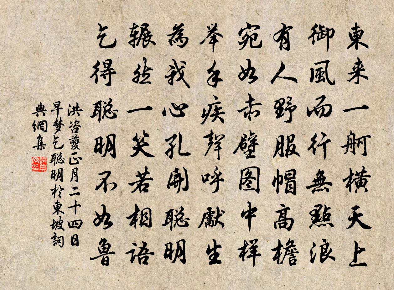 詩詞名句歷史字典書法欣賞書法字典國語詞典說文解字康熙字典古漢語字典標 題 作 者 詩 句 正月二十四日早夢乞聰明於東坡作者:洪咨夔 朝代:宋代原文東來一舸橫天上,御風而行無點浪。有人野服帽高檐,宛如赤壁圖中樣。舉手疾聲呼先生,為我心孔開聰明。輾然一笑若相語,乞得聰明不如魯。詩詞問答問:《正月二十四日早夢乞聰明於東坡》的作者是誰?答:洪咨夔問:該詩寫於哪個朝代?答:宋代書法欣賞正月二十四日早夢乞聰明於東坡書法作品詩詞推薦北園雜詠陸游〔宋代〕歲殘已似早春天,隔水橫林一抹煙。聞道埭西梅半吐,攜兒閒上釣魚船。踏莎行(壽人母八十三)翁溪園〔宋代〕蓂莢飛雙,桂分缺二。金風已肅深秋意。萱庭戲彩恰稱觴,蕊宮仙子天台裔。鶴髮童顏,龜齡福備。孩兒書額添三悼室人詩江淹〔南北朝〕駕言出遊衍。冀以滌心胸。復值煙雨散。清陰帶山濃。素沙匝廣岸。雄虹冠尖峯。出風舞森桂。落日曖圓松。還結瑪瑙坡四詠釋智圓〔宋代〕瑪瑙坡前水,泠泠夏亦寒。夜深明月上,珠顆落冰盤。華延年卜寺劉夢求〔宋代〕邲鑒總龜如往學,未見才名能廣博。希點若來參學時,同年從此不須疑。題胡立方思齋戴復古〔宋代〕每事再思過,參之以古今。唯求合天理,毋妄用吾心。和氣生琴室,清風動竹林。所居雖近市,不許市塵侵。南山感舊劉克莊〔宋代〕髫齔隨二親,旅泊承天寺。姆抱殿上嬉,忽睹瞿曇氏。擬詠懷詩 二庾信〔南北朝〕赭衣居傅岩。垂綸在渭川。乘舟能上月。飛幰欲捫天。誰知志不就。空有直如弦。洛陽蘇季子。連衡遂不連。既無踏莎行佚名〔宋代〕萼破前村,枝橫江路。鐵心應也頻凝佇。怕愁惟恐不禁愁,寧教雪月相分付。不測春來,難追香去。無人知我心先贈葛葦蘇軾〔宋代〕竹椽茅屋半摧傾,肯向蜂窠寄此生。長恐波頭卷室去,欲將船尾載君行。小詩試擬孟東野,大草閒臨張伯英。消遣和劉太守十州詩松島陳瓘〔宋代〕影參岸柏童童綠,葉蔽汀蘭澹澹香。斤斧不來人跡遠,養成千尺勢堂堂。自過漢花菜花彌望不絕士人以其子為油項安世〔宋代〕漢南漢北滿平田,三月黃花也可憐。惟有書生知此味,可無詩句到渠邊。油燈夜讀書千卷,齏臼晨供飲十年。今日以昌黎驗長常攜尺為韻賦筍五首舒邦佐〔宋代〕吾家蒼頭奴,斫玉手自攜。雲恐春風惡,吹開枝高低。水調歌頭蔡伸〔宋代〕相逢非草草,分袂太匆匆。征裘淚痕浥遍,眸子怯酸風。天際孤帆難駐,柳外香軿望斷,雲雨各西東。回首重城遠送王紫微北使梅堯臣〔宋代〕天子命儒臣,遐方重專對。持書下西閣,擁節來窮塞。貂服紫蒙茸,虎旗光彩綷。將迎走氈騎,衛從羅金鎧。當宣清心鏡 京兆全真庵馬鈺〔元代〕皮張仙,修造主。一身兩役,兼為化主。修庵舍、獨辦一間,禱長安施主。論修行,分賓主。悟取氣神,與身為主臨賀別駕李子西同年寄五字詩,以杜句君隨丞楊萬里〔宋代〕曲江與臨武,彼此昔相望。一嶺大如礪,誰雲隔尋丈。離合非人力,此事要天相。升沉亦偶然,豈問優與髒。和伯氏春雨中韻胡仲參〔宋代〕痴寒脈脈壓晴莎,春漸三分景未和。待得濃陰收拾後,花邊春色已無多。寄虔州韓使君張籍〔唐代〕南康太守負才豪,五十如今未擁旄。早得一人知姓字,常聞三事說功勞。月明渡口漳江靜,雲散城頭贛石高。郡政約致明入開善不至二首劉子翬〔宋代〕偶臨沙岸立多時,淡淡煙村日向低。幽事挽人歸不得,一枝梅影浸澄溪。名句推薦君子泰而不驕,小人驕而不泰。孔子弟子《論語·子路篇》 土膏欲動雨頻催,萬草千花一餉開;范成大《春日田園雜興》 春生、夏長、秋收、冬藏,天之正也王詡《鬼谷子·持樞》 富與貴,是人之所欲也;不以其道得之,不處也。孔子弟子《論語·里仁篇》 春宵苦短日高起,從此君王不早朝。白居易《長恨歌》 四面歌殘終破楚,八年風味徒思浙。秋瑾《滿江紅·小住京華》 故人江海別,幾度隔山川。司空曙《雲陽館與韓紳宿別》 力田已告成,計日宜收藏。黃燮清《秋日田家雜詠》 入門休問榮枯事,且看容顏便得知。佚名《增廣賢文·上集》 功名萬里外,心事一杯中。高適《送李侍御赴安西》