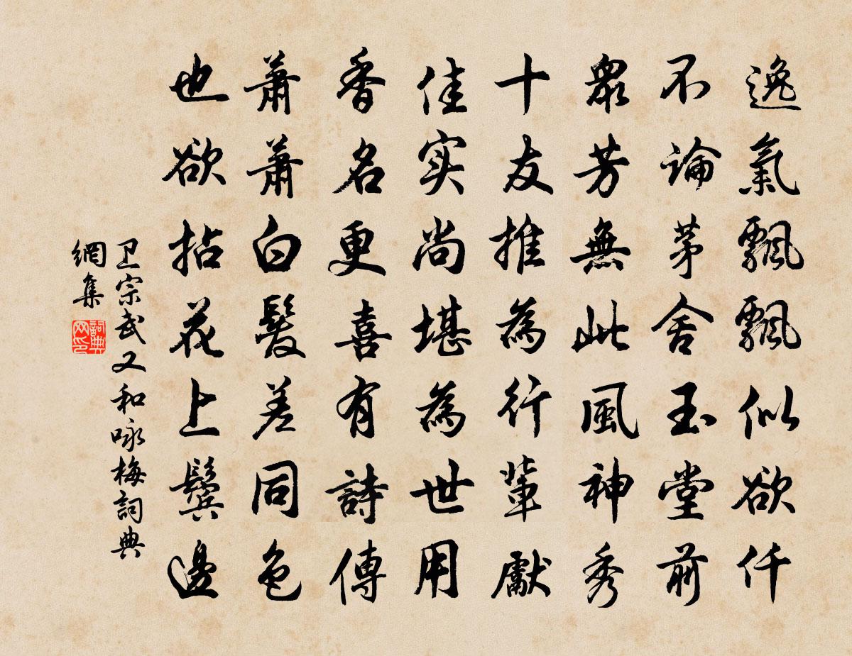 詩詞名句歷史字典書法欣賞書法字典國語詞典說文解字康熙字典古漢語字典標 題 作 者 詩 句 又和詠梅作者:衛宗武 朝代:宋代又和詠梅原文逸氣飄飄似欲仟,不論茅舍玉堂前。眾芳無此風神秀,十友推為行輩先。佳實尚堪為世用,香名更喜有詩傳。蕭蕭白髮差同色,也欲拈花上鬢邊。詩詞問答問:又和詠梅的作者是誰?答:衛宗武問:又和詠梅寫於哪個朝代?答:宋代衛宗武又和詠梅書法欣賞又和詠梅書法作品詩詞推薦送友人江行之廬山肄業唐求〔唐代〕蜀國初開棹,廬峰擬拾螢。獸皮裁褥暖,蓮葉製衣馨。楚水秋來碧,巫山雨後青。莫教銜鳳詔,三度到中庭。風水劉黻〔宋代〕不雨五十日,一雨生意回。詎料雨復痴,日日聞震雷。中元節倏居,巨飈瓷喧豗。故挽水倒流,能撼山欲摧。掀茅夜讀試卷呈君實待制景仁內翰王安石〔宋代〕篝燈時見語驚人,更覺揮毫捷有神。學問比來多可喜,文章非特巧爭新。蕉中得鹿初疑夢,牖下窺龍稍眩真。邂逅寒食王銍〔宋代〕故國千峰外,孤舟一水濱。天涯未歸客,江上欲殘春。雁去銷魂久,花開墜淚頻。東風吹晚雨,芳草路邊人。卜運算元·天生百種愁徐俯〔宋代〕天生百種愁,掛在斜陽樹。綠葉陰陰占得春,草滿鶯啼處。不見生塵步。空憶如簧語。柳外重重疊疊山,遮不斷、游峴山次韻三首陳與義〔宋代〕夜度一程雲,平明踏山址。山神豈妬我,飛雨亂眸子。重岳袞袞去,前傑後俊偉。晦明更百態,始望那及此。路窮社日小飲陸游〔宋代〕催花初過社公雨,對酒喜烹溪友魚。盡道亂山窮絕處,年華未覺異吾廬。賦未見君子憂心靡樂八韻寄李載黃庭堅〔宋代〕飄風從東來,雨足盡西靡。萬物逐波流,金石終自止。渭因涇使濁,菲以葑故毀。智所無奈何,誰能為樗里。詠梅五十首呈史尚書釋紹嵩〔宋代〕竹裹梅花映白頭,梅花欲動憶吾州。只今且為梅花醉,試問梅花可忍不。行夫寄黃山榧子有詩因同來韻劉子翬〔宋代〕老坡文中哮闞聲,凜凜常如對英峙。琅然諷詠興凌雲,瞠若追攀顙流泚。玉山妙唱久寂寥,可與言計有之子。裁箋送範文叔禮部守彭州樓鑰〔宋代〕憂國鬢先雪,愛君心似丹。旌麾雖自適,懷抱未全寬。直道任三黜,故人憐一寒。濛陽毋久駐,旋復簉鵷鸞。蝶戀花晁端禮〔宋代〕瀲灩長波迎鷁首。雨淡煙輕,過了清明候。岸草汀花渾似舊。行人只是添清瘦。瀋水香消羅袂透。雙櫓聲中,午夢戊辰雪孔武仲〔宋代〕初臘氣亦佳,窮冬雪還虐。晚風淅瀝音,暮勢聯翩作。余寒逼觥斝,遠景明池閣。想像山陰人,扁舟在寥廓。題寺壁牟融〔唐代〕僧家勝景瞰平川,霧重嵐深馬不前。宛轉數聲花外鳥,往來幾葉渡頭船。青山遠隔紅塵路,碧殿深籠綠樹煙。聞道偷聲木蘭花(梅)謝薖〔宋代〕景陽樓上鐘聲曉。半面啼妝勻未了。斜月紛紛。斜影幽香暗斷魂。玉顏應在昭陽殿。卻向前村深夜見。冰雪肌膚。山居寂寥與世如隔是非不到榮辱兩忘因憶秋崖吳錫疇〔宋代〕我愛山居好,枌榆老故丘。好峰當戶立,遠水護田流。鼓響移秧日,耞鳴獲稻秋。年豐身老健,一飽外無求。句韓縝〔宋代〕君恩未報身何有,且寄扁舟夢想中。縣境不雨數遣比丘禱佛於廟祀龍於社皆不雨聞毛滂〔宋代〕自酌椒漿酹紫淵,步虛聲徹羽衣翩。壇心月冷刑鵝俎,雨腳風搖浴狶天。百里飽看紅{左禾右罷}稏,一杯輕愧黑達磨大師贊釋普濟〔宋代〕五一竺國,東震旦土。傳佛心宗,無本可據。無本據,一葦橫趨,大江東去。城南野居寄知己曹鄴〔唐代〕奔走未到我,在城如在村。出門既無意,豈如常閉門。作詩二十載,闕下名不聞。無人為開口,君子獨有言。身為名句推薦一枕新愁,殘夜花香月滿樓。項鴻祚《減字木蘭花·春夜聞隔牆歌吹聲》 春風不相識,何事入羅幃。李白《春思》 穠艷一枝細看取,芳心千重似束。蘇軾《賀新郎·夏景》 風風雨雨梨花,窄索簾櫳,巧小窗紗。喬吉《折桂令·客窗清明》 雨過月華生,冷徹鴛鴦浦。柳永《甘草子·秋暮》 樓外垂楊千萬縷。欲系青春,少住春還去。朱淑真《蝶戀花·送春》 人行事施予,以利之為心,則越人易和;以害之為心,則父子離且怨。韓非及後人《韓非子·外儲說左上》 青青河畔草,綿綿思遠道。佚名《飲馬長城窟行》 阿婆還似初笄女,頭未梳成不許看。袁枚《遣興》 金風玉露一相逢,便勝卻人間無數。秦觀《鵲橋仙·纖雲弄巧》