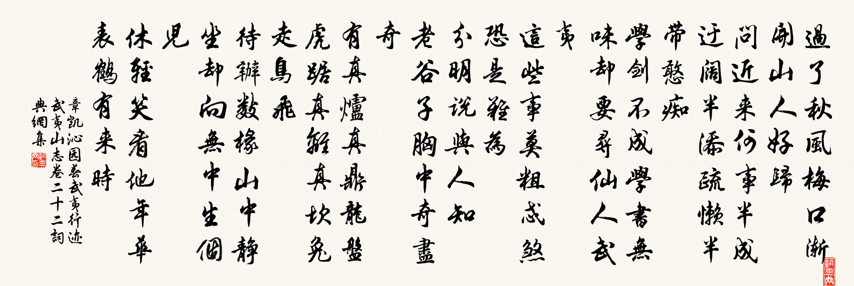 詩詞名句歷史字典書法欣賞書法字典國語詞典說文解字康熙字典古漢語字典標 題 作 者 詩 句 沁園春 武夷行跡 武夷山志卷二十二作者:章凱 朝代:元代原文過了秋風,梅口漸開,山人好歸。問近來何事,半成迂闊,半添疏懶,半帶憨痴。學劍不成,學書無味,卻要尋仙人武夷。這些事,莫粗忒煞,恐是難為。分明說與人知。老穀子胸中奇盡奇。有真爐真鼎,龍盤虎踞,真離真坎,兔走鳥飛。待辦數椽,山中靜坐,卻向無中生個兒。休輕笑,看他年華表,鶴有來時。詩詞問答問:《沁園春 武夷行跡 武夷山志卷二十二》的作者是誰?答:章凱問:該詩寫於哪個朝代?答:元代問:該詩是什麼體裁?答:詞書法欣賞沁園春 武夷行跡 武夷山志卷二十二書法作品詩詞推薦送羅季周主簿之官八桂楊萬里〔宋代〕憶昔相從夜誦時,子垂兩髧我初髭。梧桐葉落猶無睡,桃李春歸總不知。我已懸車老岩岳,子方斂板走階墀。莫嫌蛬朱繼芳〔宋代〕一蛬何唧唧,吟落兒童心。只在竹籬外,篝燈無處尋。肅翁餉石門芥菜劉克莊〔宋代〕食指清晨動,饞涎異味來。高情分石芥,辣性似徂徠。翁誠之輓詞葉適〔宋代〕西方之人美無度,眷此南邑朝陽鳴。如錐出囊擬砭國,似璞有價空連城。三仕郎官老將及,一去郴州喚不譍。朔風送范秉彝李新〔宋代〕東風花吹起原頭綠,牆暗萋萋芳草縟。舞筵輟按杜韋娘,旗亭便聽金衣曲。石城山下路,回首不堪顧。灼灼小花燃早秋西歸有懷劉威〔唐代〕求歸方有計,惜別更堪愁。上馬江城暮,出郊山戍秋。暗銷何限事,白盡去年頭。莫怪頻惆悵,異鄉難再游。予年十四五侍子中兄讀書贛州壽量寺久之寺為周必大〔宋代〕志學今經六十年,招提仍對舊山川。令威化鶴重來日,頂似初顏雪被肩。子文大丞重午日走貺煮酒,清甚,殆與遠水一范成大〔宋代〕臘腳清若空,吾聞其語矣。今晨品義尊,公酒正如此。太常家有此段奇,銷得不齋醉如泥。但恨今無遏雲曲,送我何九於客舍集王昌齡〔唐代〕客有住桂陽,亦如巢林鳥。罍觴且終宴,功業會未了。山月空霽時,江明高樓曉。門前泊舟楫,行次入松筱。此意西江月(老妻生日,因取薌林中所產異物,作是詞以侑觴)向子諲〔宋代〕幾見芙蓉並蒂,忽生三秀靈芝。千年老樹出孫枝。岩桂秋來滿地。白鶴雲間翔舞,綠龜葉上遊戲。齊眉偕老更何疑七老會詩(杲年八十九)胡杲〔唐代〕閒居同會在三春,大抵愚年最出群。霜鬢不嫌杯酒興,白頭仍愛玉爐熏。裴回玩柳心猶健,老大看花意卻勤。鑿落有感蘇泂〔宋代〕滯不求通任布衣,山 * 上玩春暉。每逢到處花開謝,轉覺人生萬事非。四時田園雜興范成大〔宋代〕雨後山家起較遲,天窗曉色半熹微。老翁欹枕聽鶯囀,童子開門放燕飛。頌古四十五首釋如珙〔宋代〕坐禪成佛生妄見,磨磚作鏡妄尤多。打車打牛俱是妄,攪得心腸沒奈何。梅花十絕句趙蕃〔宋代〕松風亭下盛開時,曾辱蘇仙與賦詩。今日折花懷此老,端如嗅菊念東籬。飄飄台曹彥約〔宋代〕清風怒折腰,斷送斜川歸。吾今已歸了,無用頻吹衣。初夏即事寄魯望皮日休〔唐代〕夏景恬且曠,遠人疾初平。黃鳥語方熟,紫桐陰正清。廨宇有幽處,私游無定程。歸來閉雙關,亦忘枯與榮。土室登總持閣岑參〔唐代〕高閣逼諸天,登臨近日邊。晴開萬井樹,愁看五陵煙。檻外低秦嶺,窗中小渭川。早知清淨理,常願奉金仙。戊辰閏正月書懷釋行海〔宋代〕茅屋風光總入詩,今年何事燕歸遲。繁花猶未競春色,百舌最先啼曉枝。深導竹渠防雨漲,密扶花架恐風欹。人生鄧表山鄭啟〔唐代〕白日三清此上時,觀開山下彩雲飛。仙壇丹灶靈猶在,鶴駕清朝去不歸。晉末幾遷陵谷改,塵中空換子孫非。松花名句推薦十分不耐煩,乃為人大病王永彬《圍爐夜話·第五四則》 脅肩諂笑,病於夏畦。孟子《孟子·滕文公章句下·第七節》 寒雨連江夜入吳,平明送客楚山孤。王昌齡《芙蓉樓送辛漸》 至人天隱,其次地隱,其次名隱。王通《中說·卷四·事君篇》 鶯嘴啄花紅溜,燕尾點波綠皺。秦觀《如夢令·春景》 故不登高山,不知天之高也;不臨深溪,不知地之厚也;荀子《勸學》 淡盪春光寒食天。玉爐瀋水裊殘煙。李清照《浣溪沙·淡盪春光寒食天》 相思相見知何日?此時此夜難為情!李白《三五七言 / 秋風詞》 採得百花成蜜後,為誰辛苦為誰甜。羅隱《蜂》 更深黃月落,夜久靨星稀。任希古《和長孫秘監七夕》