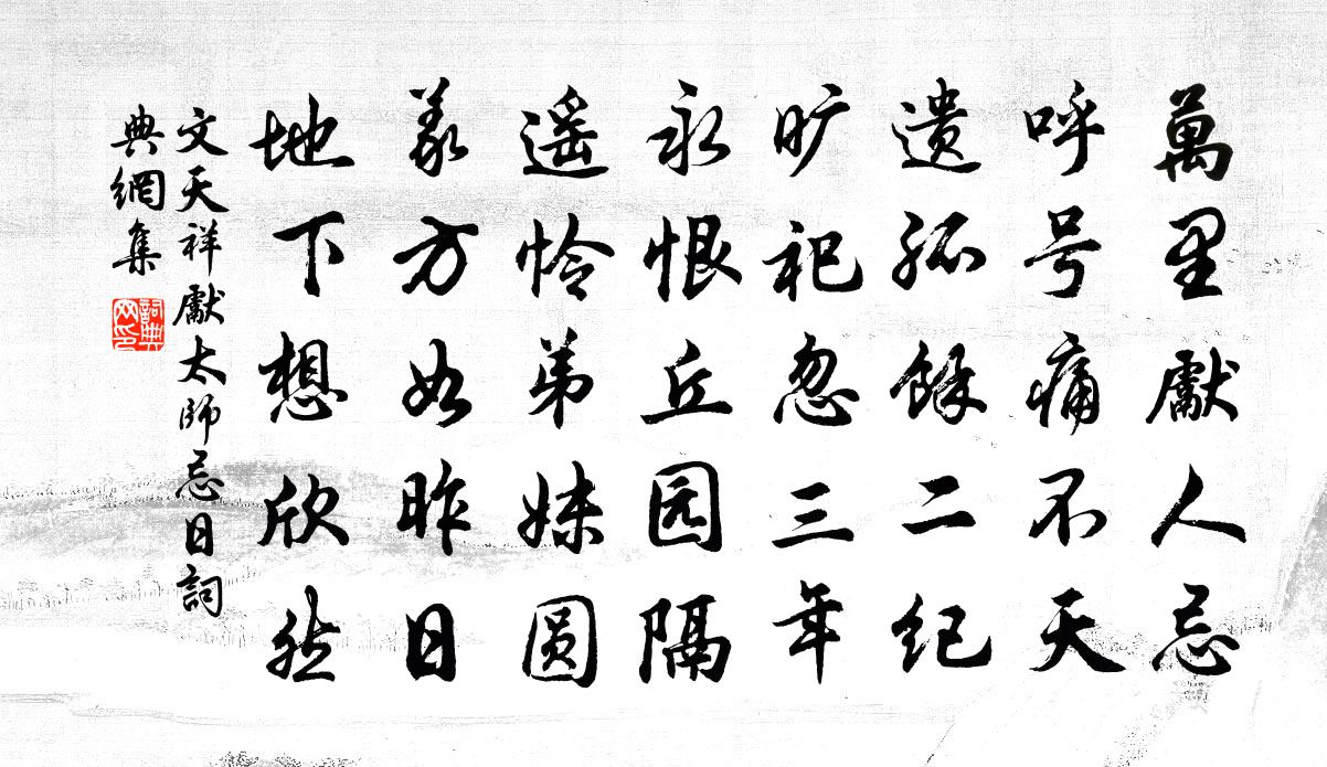 詩詞名句歷史字典書法欣賞書法字典國語詞典說文解字康熙字典古漢語字典標 題 作 者 詩 句 先太師忌日作者:文天祥 朝代:宋代先太師忌日原文萬里先人忌,呼號痛不天。遺孤餘二紀,曠祀忽三年。永恨丘園隔,遙憐弟妹圓。義方如昨日,地下想欣然。詩詞問答問:先太師忌日的作者是誰?答:文天祥問:先太師忌日寫於哪個朝代?答:宋代問:文天祥的名句有哪些?答:文天祥名句大全文天祥先太師忌日書法欣賞先太師忌日書法作品詩詞推薦雪浪閣二首趙蕃〔宋代〕木末闌乾渺未平,泊舟石涇得深行。舟行不見江流闊,一上憑高覺快生。飲湖上初晴後雨二首蘇軾〔宋代〕水光灩瀲晴方好,山色空濛雨亦奇。若把西湖比西子,淡妝濃抹總相宜。由校中秘書授徽倅道出金陵投留守吳公琚高似孫〔宋代〕四朝渥遇鬢微絲,多少恩榮世少知。長樂花深春待宴,重華香暖夕論詩。黃金籯滿無心愛,古錦囊歸有字奇。一笑浣溪沙王質〔宋代〕征雁年來得幾回。春風無雁帶書歸。故應春瘦減春衣。花柳傷心經歲月,江湖無夢失津涯。到家無樹不紅飛。乞姚花二首黃庭堅〔宋代〕正是風光嬾困時,姚黃開晚落應遲。欲雕好句乞春色,日曆如山不到詩。逍遙詠宋太宗〔宋代〕經心玄妙理,道德念陰符。九轉金丹鼎,三才玉匱書。恆常皆隱秘,達者見清虛。倏忽神明意,先賢覺自願。彭澤懷古黃彥平〔宋代〕人言寧飲建業水,陶公不污彭法米。淳耀之烈當未渝,義熙之政何如此。不能先驅淨螻蟻,忍傍車輪攀獺尾。已荒贈大慈寺嘯翁開士史守之〔宋代〕掛錫雲飛處,心閒境亦閒。萬緣空俗想,一缽飽松關。身幻從茲化,風高未許攀。繁華滿眼底,付與水潺潺。感皇恩(和才仲西山子)王以寧〔宋代〕千古洞庭湖,百川爭注。雪浪銀濤正如許。騎鯨詩客,浩氣決雲飛霧。背人歌欸乃,凌空去。我欲從公,翩然鵠舉無俗念佚名〔宋代〕參玄齟齬,強鑽研道法,堅如鋼鐵。鳥噪猿啼談不二,切忌隨他分別。喝下明心,杖頭見性,此理固難說。疑團打兩生姜特立〔宋代〕齊魯云何兩大臣,初無名字掛朝紳。若將出處評高致,更是夔龍以上人。鷓鴣天佚名〔宋代〕清明將近春時節。清溪詞孔武仲〔宋代〕譙門之南溪水長,斜暉倒閃青銅光。下與長江作支股,愁霖漲天江潦黃。江潦黃,入清溪。清溪到底終無泥,還如講徹禮記崇政殿開宴應制夏竦〔宋代〕幄坐尊儒術,華光御講筵。爰開柏梁宴,為畢曲台篇。法從飛緌接,藩房綺組聯。賜花均彩萼,陪鼎雜冬鮮。甘潤贈柯山道士鄭雲谷來住灃之洞辰二首李曾伯〔宋代〕道人本分事,不用達人詩。煙霞痼疾間,風月陶寫之。漆園直寓言,謫仙豈吾師。卷懷置心齋,焚薌比希夷。簡夫別墅鄭獬〔宋代〕靜境清無敵,門前系鹿車。買山憑野客,覓竹到鄰家。棋為尋圖勝,書因借本差。平時非厭仕,所樂在桑麻。春閨雜詠問庖嫗華岳〔宋代〕詩道風光在水西,水西我意未為奇。若教南北東溪去,更費詩人無限詩。又和松碧軒三絕胡寅〔宋代〕欣此幽居惜未深,時搴芳秀浣塵襟。棟樑自是君材器,鐵石空餘我寸心。漁家傲 以上周詠先校舊抄圭塘款乃集本許有許有孚〔元代〕雪後西山崖壁峭。奇觀難與他人道。煨宇有爐無客造。從壑誚。巡檐且索梅花笑。冷蕊疏花開矯矯。水村妝點霜林挽思泉居士王柏〔宋代〕平生不蓄買山錢,晚得佳城豈偶然。官職叢中韜素志,風波險處謁名賢。只將和氣占心地,尚想清尊養性天。宗黨名句推薦一身報國有萬死,雙鬢向人無再青。陸游《夜泊水村》 莫唱當年長恨歌,人間亦自有銀河。袁枚《馬嵬》 棲鴉流水點秋光,愛此蕭疏樹幾行。紀映淮《詠秋柳》 夕陽鳥外,秋風原上,目斷四天垂。柳永《少年游·長安古道馬遲遲》 柳帶搖風漢水濱,平蕪兩岸爭勻。牛希濟《臨江仙·柳帶搖風漢水濱》 繁霜儘是心頭血,灑向千峰秋葉丹。戚繼光《望闕台》 上不失天時,下不失地利,中得人和,而百事不廢。荀子《荀子·王霸》 芳菲歇去何須恨,夏木陰陰正可人。秦觀《三月晦日偶題》 春色惱人眠不得,月移花影上欄乾。王安石《春夜》 數年來往鹹京道,殘杯冷炙謾消魂晏殊《山亭柳·贈歌者》
