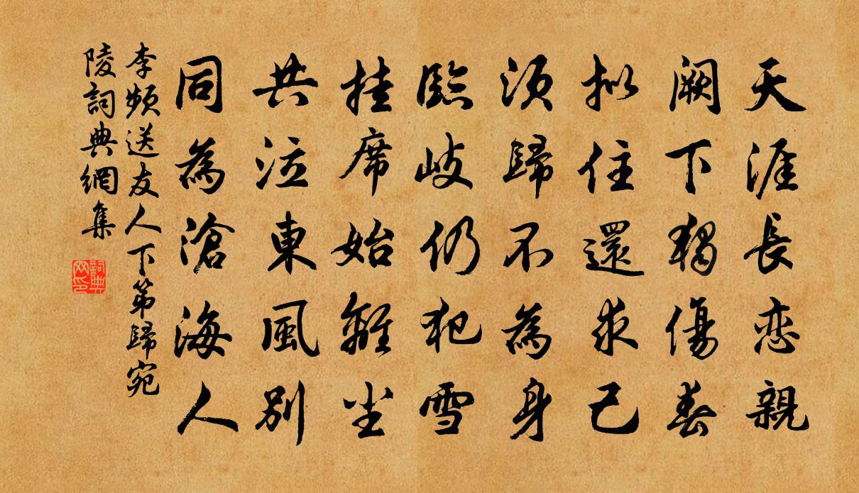 詩詞名句歷史字典書法欣賞書法字典國語詞典說文解字康熙字典古漢語字典標 題 作 者 詩 句 送友人下第歸宛陵作者:李頻 朝代:唐代送友人下第歸宛陵原文天涯長戀親,闕下獨傷春。擬住還求己,須歸不為身。臨岐仍犯雪,掛席始離塵。共泣東風別,同為滄海人。詩詞問答問:送友人下第歸宛陵的作者是誰?答:李頻問:送友人下第歸宛陵寫於哪個朝代?答:唐代問:送友人下第歸宛陵是什麼體裁?答:五律李頻送友人下第歸宛陵書法欣賞送友人下第歸宛陵書法作品注釋全唐詩:卷587-65詩詞推薦九月申屠伯驥同飲壽張蚩尤冢上王奕〔宋代〕蚩尤一夢四千年,涿鹿如今又不然。柵上懸絲重放下,草門朽骨尚高眠。升烏沉兔人今古,點鵲痴蟬事後先。醉插水龍吟(自遣)趙長卿〔宋代〕煞曾著意斟量過,天下事、無窮盡。貪榮貪富,朝思夕計,空勞方寸。躡足封王,功名蓋世,誰如韓信。更堆金游上天竺呂祖謙〔宋代〕淨域何虛寂,居然隔市喧。僧來混不語,吾亦欲忘言。至樂存簞食,浮名類觸藩。行行返初服,賁趾老邱樊。贈閒師(一作送令閒上人)許渾〔唐代〕近日高僧更有誰,宛陵山下遇閒師。東林共許三乘學,南國爭傳五字詩。初到庾樓紅葉墜,夜投蕭寺碧雲隨。秋江復用前韻李彌遜〔宋代〕喚起春眠恨伯勞,一簪華發不禁搔。緩尋親綠偏疑竹,細數輕紅錯認桃。宮詞宋白〔宋代〕繡衣宮女把宮門,不遣中人謁至尊。晚霽微行向何處,灞陵原接杏花村。水調歌頭(自湖北漕移湖南,總領王、趙守置酒南樓,席上留別)辛棄疾〔宋代〕折盡武昌柳,掛席上瀟湘。二年魚鳥江上,笑我往來忙。富貴何時休問,離別中年堪恨,憔悴鬢成霜。絲竹陶寫耳游靈隱寺道諫〔宋代〕長吟遊古寺,九里入青松。鳥向花間語,僧從月下逢。陰廊連碧殿,清磬雜疏鍾。回首夕陽晚,煙霞鎖亂峰。詠史下曹丕陳普〔宋代〕侏儒一節足亡身,衰絰三年笑 * 。不逐猇亭天子便,龍舟何用到江濱。挽悟悅師二章衛宗武〔宋代〕耆宿已凋零,如題亦曉星。宗門僧巨棟,梵宇世傳燈。身閱空花境,心潛多業經。悅禪方有悟,六秩吊頹齡。倉使和詩出奇不窮再次韻四首劉克莊〔宋代〕作雨賓春雪餞冬,田家休戚使家同。魚非人所當加察,馬與民皆不可窮。政爾和風並暖日,管他雌霓更雄虹。耿侯六年立春日人日作白居易〔唐代〕二日立春人七日,盤蔬餅餌逐時新。年方吉鄭猶為少,家比劉韓未是貧。鄉園節歲應堪重,親故歡游莫厭頻。試作寄葛源張鑄〔宋代〕銀銅坑冶是新差,職任催綱勝一階。更使下官供腳色,下官蹤跡轉沈埋。至日見菊花盛開有感羅公升〔宋代〕玄冥用事久,百卉不復余。今晨轉陽律,始見天地初。黃花獨何事,佳色炯自如。淵明骨已朽,餘子不稱渠。風霜失調名佚名〔宋代〕一年一度春來,何時是了。花落花開渾是夢,只解把人引調。可憐浮世,等閒過日,卻不識,綠水青山,四時都好出居庸蔡珪〔金代〕亂石妨車轂,深沙困馬蹄。天分斗南北,人向日東西。側腳柴荊短,平頭土舍低。山花三兩樹,笑殺武陵溪。寄西山嵩雪庭釋文珦〔宋代〕支遁還山去,翛然世外心。不曾離磵壑,長是愛雲林。馬放秋場靜,龍眠夜井深。山林如許到,早晚亦相尋。商於逢友人喻坦之〔唐代〕行役何時了,年年骨肉分。春風來漢棹,雪路入商雲。水險溪難定,林寒鳥異群。相逢聊坐石,啼狖語中聞。奉使契丹二十八首 惠州〈傳聞南朝逃叛者多蘇轍〔宋代〕孤城千室閉重闉,蒼莽平川絕四鄰。漢使塵來空極目,沙場雪重欲無春。羞歸應有李都尉,念舊可憐徐舍人。會逐韓員外愈、皇甫侍御(氵是)見過,因而命作。李賀〔唐代〕華裾織翠青如蔥,金環壓轡搖玲瓏。馬蹄隱耳聲隆隆,入門下馬氣如虹。雲是東京才子,文章巨公。二十八宿羅心名句推薦過而能改者,民之上也。左丘明《國語·魯語·季文子論妾馬》 知有兒童挑促織,夜深籬落一燈明。葉紹翁《夜書所見》 未知鹿死誰手房玄齡《晉書·載記·第五章》 賭近盜,淫近殺。馮夢龍《警世通言·卷三十五》 蟬鳴空桑林,八月蕭關道。王昌齡《塞下曲四首》 腸已斷,淚難收。相思重上小紅樓。辛棄疾《鷓鴣天·晚日寒鴉一片愁》 與人善言,暖於布帛;傷人之言,深於矛戟。荀子《荀子·榮辱》 斷香殘酒情懷惡。西風催襯梧桐落。李清照《憶秦娥·詠桐》 柳岸風來影漸疏,使君家似野人居。杜牧《齊安郡晚秋》 何日歸家洗客袍?銀字笙調,心字香燒。蔣捷《一剪梅·舟過吳江》