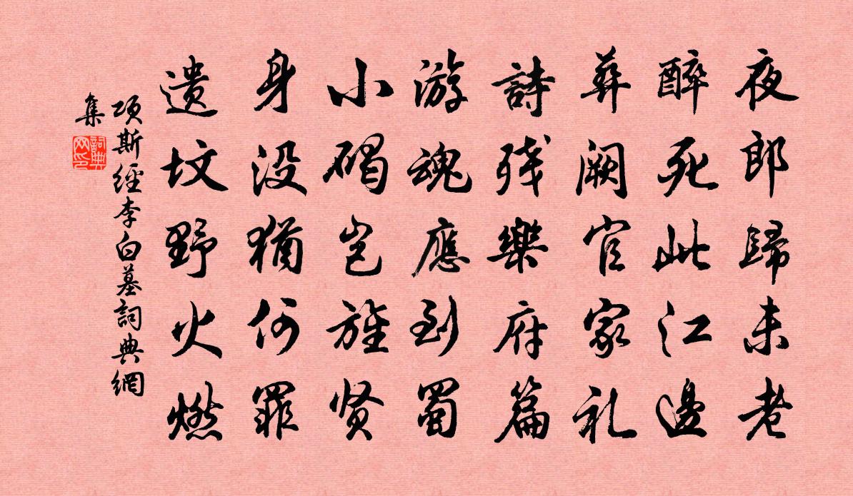 詩詞名句歷史字典書法欣賞書法字典國語詞典說文解字康熙字典古漢語字典標 題 作 者 詩 句 經李白墓作者:項斯 朝代:唐代經李白墓原文夜郎歸未老,醉死此江邊。葬闕官家禮,詩殘樂府篇。遊魂應到蜀,小碣豈旌賢。身沒猶何罪,遺墳野火燃。詩詞問答問:經李白墓的作者是誰?答:項斯問:經李白墓寫於哪個朝代?答:唐代問:經李白墓是什麼體裁?答:五律項斯經李白墓書法欣賞經李白墓書法作品注釋全唐詩:卷554-42詩詞推薦東齋雜詠(盆池)張耒〔宋代〕點點青萍秋後衰,溶溶晴日見魚兒。水邊窺影何方客,自照行吟憔悴姿。春日田園雜興十首陳舜道〔宋代〕春來非是愛吟詩,詩是田園盡興時。蓐食出門天欲曙,荷鑰歸路月相隨。踏青漫有心情在,耕綠寧甘骨力疲。個段送傳宣李子范供奉歸闕強至〔宋代〕曾共征西幕府來,相逢今日魏王台。喜情重把論交袂,感淚頻添話舊杯。此別情懷無限惡,他時談笑尚容陪。馬蹄獨步南園寄子忱曹勛〔宋代〕野老悲春事,相如復倦遊。肯來傾濁酒,同與散清愁。遠岸重重柳,晴江處處舟。飛紅殘照晚,閒倚水邊樓。光澤朱君輓詞四首林亦之〔宋代〕長記前回過我廬,艱難步履喚兒扶。莫將馬箠敲門去,寒水無人野嶼孤。念奴嬌(二和)劉克莊〔宋代〕並游英俊,從頭數、富貴消磨誰紀。道眼看來,嘆人生如寄,家如旅邸。教婢羹藜,課奴種韭,聊誑殘牙齒。草堂原易林景熙〔宋代〕滎河通昆源,古出龍馬瑞。包犠真天人,一見測其秘。八卦已支離,重為六十四。爻象互立名,繫辭發洙泗。盡泄高士詠玄晏先生吳筠〔唐代〕士安逾弱冠,落魄未修飾。一朝因感激,志學忘寢食。著書窮天人,辭聘守玄默。薄葬信昭儉,可為將來則。十報恩馬鈺〔元代〕山侗三願報師恩。鍛鍊靈胎在玉京。鉛汞烹煎先有驗,虎龍 * 豈無聲。三光並秀超三味,五嶽同峰出五行。三五郊廟歌辭。周郊祀樂章。武舞樂佚名〔唐代〕圭瓚方陳禮,乾旄乃象功。成文非羽籥,猛勢若羆熊。頌古一百首釋智愚〔宋代〕烈焰瀾翻為說時,百千諸佛盡攢眉。梵音深遠難明辨,只許韶陽雪老知。送朱慶餘及第歸越張籍〔唐代〕東南歸路遠,幾日到鄉中。有寺山皆遍,無家水不通。湖聲蓮葉雨,野氣稻花風。州縣知名久,爭邀與客同。玉交枝/憶秦娥劉燾〔宋代〕念誰伴、茜裙翠袖。龐居士贊釋崇岳〔宋代〕心空及第,深根固帝。共說無生,異類中行。惱亂禪家至今日,不知日午打三更。挽周季卿吳芾〔宋代〕一時推曠達,末俗少如公。自得高人趣,居多長者風。生涯書卷里,世事酒杯中。瞑目應無憾,傳家有阿戎。壽秀王八十釋智朋〔宋代〕道壽宗翰玉亭亭,益固維城重典刑。八十手扶靈壽杖,鹹瞻南極老人星。燕漕司進士小詩奉勉度正〔宋代〕奮跡山林志甚疏,濫當春棘品賢書。學開鄒魯人無異,文到卿雲士有餘。力戰吝驕存廣大,深培根本黜浮虛。此中寄題劉仲更澤州家園韓維〔宋代〕聞君有佳尚,買勝不論錢。逕鑿蒼林蘚,亭開翠壁煙。從花窮洛譜,得石記唐年。數卷書勇萬,言章木以千。晨昏奉送魏六丈佑少府之交廣杜甫〔唐代〕賢豪贊經綸,功成空名垂。子孫不振耀,歷代皆有之。鄭公四葉孫,長大常苦飢。眾中見毛骨,猶是麒麟兒。磊落樊將軍廟汪遵〔唐代〕玉輦曾經陷楚營,漢皇心怯擬休兵。當時不得將軍力,日月須分一半明。名句推薦使能,國之利也。左丘明《左傳·文公·文公六年》 惜衣有衣,惜食有食。馮夢龍《警世通言·卷三》 不見襄陽登覽,磨滅遊人無數,遺恨黯難收。陸游《水調歌頭·多景樓》 長夏村墟風日清,檐牙燕雀已生成。張耒《夏日三首·其一》 冰合大河流,茫茫一片愁。納蘭性德《菩薩蠻·白日驚飈冬已半》 風起,雪飛炎海變清涼。蘇軾《定風波·南海歸贈王定國侍人寓娘》 嘆息此人去,蕭條徐泗空李白《經下邳圯橋懷張子房》 無常亂之國,無不可理之民者。吳兢《貞觀政要·卷五· * 平》 文官不愛錢,武官不惜死,則天下太平。張廷玉《明史·列傳·卷一百四十三》 它山之石,可以攻玉。佚名《鶴鳴》