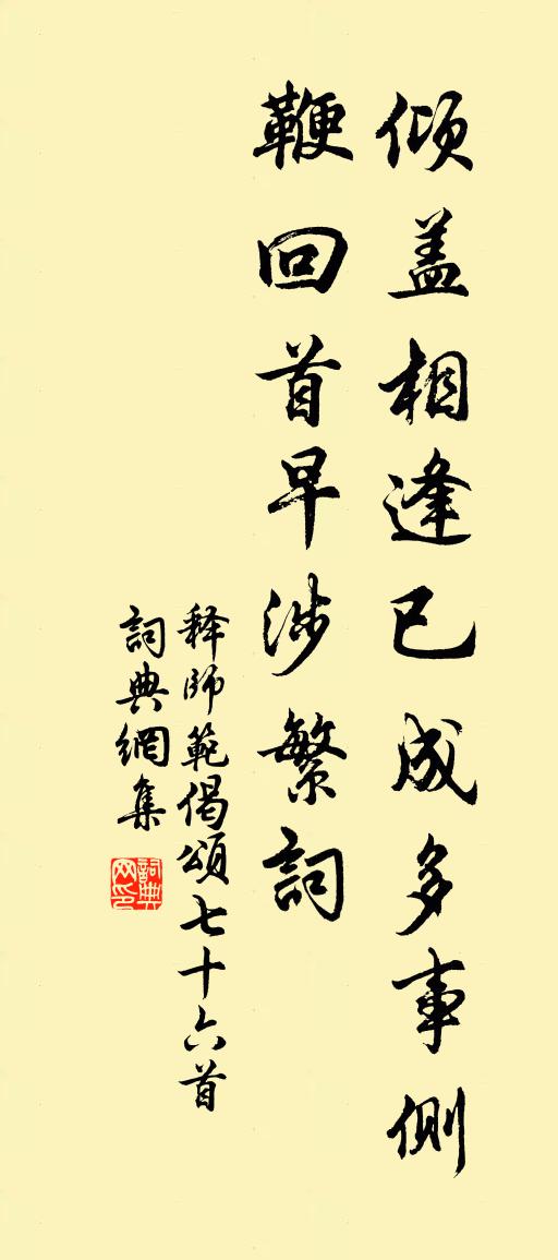 詩詞名句歷史字典書法欣賞書法字典國語詞典說文解字康熙字典古漢語字典標 題 作 者 詩 句 偈頌七十六首作者:釋師範 朝代:宋代偈頌七十六首原文傾蓋相逢,已成多事,側鞭回首,早涉繁詞。詩詞問答問:偈頌七十六首的作者是誰?答:釋師範問:偈頌七十六首寫於哪個朝代?答:宋代釋師範偈頌七十六首書法欣賞偈頌七十六首書法作品詩詞推薦曲江秋日韓偓〔唐代〕斜煙縷縷鷺鷥棲,藕葉枯香折野泥。有個高僧入圖畫,把經吟立水塘西。譏劉秘監獻佞固灶劉黻〔宋代〕白玉堂中翰墨師,忍令奏牘玷塗碑。向時剛道梅花累,今累梅花自不知。偶成姜特立〔宋代〕僻習難施日用間,老人拗事更相關。愁來得句翻成樂,忙裡尋詩卻是閒。又二首呂祖謙〔宋代〕平生丈人行,每語盡箴規。問字揚雄宅,談經董相帷。壺觴陪勝踐,杖屨及深期。誰料南歸日,墳前宿草衰。寄杭州崔使君裴夷直〔唐代〕朝下歸來只閉關,羨君高步出人寰。三年不見塵中事,滿眼江濤送雪山。採菊李建勛〔唐代〕簇簇竟相鮮,一枝開幾番。味甘資曲糵,香好勝蘭蓀。古道風搖遠,荒籬露壓繁。盈筐時採得,服餌近知門。喜春吟邵雍〔宋代〕春至已將詩探伺,春歸更用酒追尋。酒因春至春歸飲,詩為花開花謝吟。花謝花開詩屢作,春歸春至酒頻斟。情多西江月牧常晁〔元代〕釋氏禪經律論,儒家傳記詩書。老君三六部真符。止論一心兩字。了得一明心地,諸餘土苴何須。忘形忘氣總歸虛縉雲道中徐似道〔宋代〕夜泊紅樓市,朝餐黑笠家。淺溪才泛鴨,疏樹不藏鴉。鬲上村坊酒,眉尖野店茶。尚緣門有竹,忘卻去程賒。瞻禮孔子吟邵雍〔宋代〕執卷何人不讀書,能知性者又何如。工居天下語言內,妙出世間繩墨餘。陶冶有無天事業,權衡治亂帝功夫。大哉食魚憶新開湖鄭獬〔宋代〕柳條穿頰一雙鯉,鱗插金錢腰尾長。何日酒泉飛白浪,湖邊先問把罾郎。病中大雪數日未嘗起觀虢令趙薦以詩相屬戲用蘇軾〔宋代〕經旬臥齋閣,終日親劑和。不知雪已深,但覺寒無奈。飄蕭窗紙鳴,堆壓檐板墮。(關中皆以板為檐。風飆助凝冽觀范陽遞俘儲光羲〔唐代〕北河旄星隕,鬼方獮林胡。群師舞弓矢,電發歸燕墟。皇皇軒轅君,贊贊皋陶謨。方思壯軍實,遠近遞生俘。車馬始生七章章八句上皇子嘉王生辰陳傅良〔宋代〕百鼎羅珍羞,世豈無調飢。錦綺爛盈門,藍縷還誰衣。龍樓近日月,茅舍或不支。三宮子孫孫,亦有孤與嫠。和頭巾趙希逢〔宋代〕休言抱道更懷才,大叫天門雲欲排。獨自一冠猶屢變,事幾何以御方來。懷遠父斯遠成父趙蕃〔宋代〕春風吹雨晝成昏,蕭寺蕭條早閉門。坐久行人更蕭瑟,定傾老酒向何村。施南太守以猿兒為寄作詩答之(得之黔中,生即頭白)王周〔唐代〕虞人初獲酉江西,長臂難將意馬齊。今日未啼頭已白,不堪深入白雲啼。寄李處州趙蕃〔宋代〕近別遂累日,逢人空附書。雖能道所以,未辱報何如。千里江山外,一春風雨余。夢成同泛宅,起欲命籃輿。秋興八首追和杜老王之道〔宋代〕雲影曚曨日灑暉,金湖西畔晚陰微。漁用繚繞青山去,楓葉追隨白鳥飛。摩詰家風非世有,淵明心性與時違。近來官舍竹王禹偁〔宋代〕誰種蕭蕭數百竿,伴吟偏稱作閒官。不隨夭艷爭春色,獨守孤貞待歲寒。聲拂琴床生雅趣,影侵棋局助清歡。明年名句推薦玉手佳人,笑把琵琶理。顧德輝《蝶戀花·春江暖漲桃花水》 垂楊拂綠水,搖艷東風年。李白《折楊柳》 是法平等無有高下。鳩摩羅什譯《金剛經·淨心行善》 淡盪春光寒食天。玉爐瀋水裊殘煙。李清照《浣溪沙·淡盪春光寒食天》 八月秋高風怒號,卷我屋上三重茅。杜甫《茅屋為秋風所破歌》 鳳簫聲動,玉壺光轉,一夜魚龍舞。辛棄疾《青玉案·元夕》 家家乞巧望秋月,穿盡紅絲幾萬條。林傑《乞巧》 萬里嬋娟,幾許霧屏雲幔。吳文英《玉漏遲·瓜涇度中秋夕賦》 象龍喚不應,竹龍起行雨張孝祥《湖湘以竹車激水粳稻如雲書此能仁院壁》 日暖桑麻光似潑,風來蒿艾氣如薰。蘇軾《浣溪沙·軟草平莎過雨新》