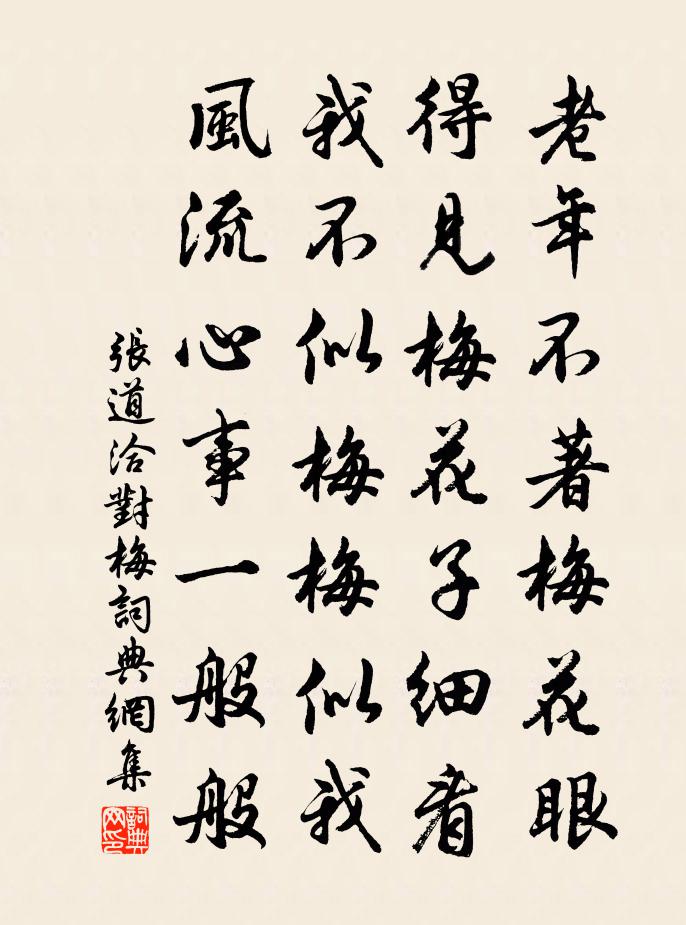 詩詞名句歷史字典書法欣賞書法字典國語詞典說文解字康熙字典古漢語字典標 題 作 者 詩 句 對梅作者:張道洽 朝代:宋代對梅原文老年不著梅花眼,得見梅花子細看。我不似梅梅似我,風流心事一般般。詩詞問答問:對梅的作者是誰?答:張道洽問:對梅寫於哪個朝代?答:宋代張道洽對梅書法欣賞對梅書法作品詩詞推薦渭川獵張鎡〔宋代〕鳴冬朔風聲披靡,原樹莽蒼枯死。出門四望來無人,何許翁閒守寒水,服中百萬總活法,閉口不言心自喜。姓名絕病中賞梅贈元晦老友劉子翬〔宋代〕梅邊無與談,賴有之子至。荒寒一點香,足以酬天地。天地亦無心,受之自人意。韜白任新和,風味要如此。南陽春日十首陳舜俞〔宋代〕簿書堆里得天真,謾為浮名役此身。門柳偶同陶靖節,君羹空羨潁封人。沙鷗舊許為吾侶,巢燕何曾厭我貧。已共示梅山弟八句陳著〔宋代〕浮世蘧廬付一呀,詩書餘瀝子孫家。兩池分受高低水,四岸量栽次第花。笑傲溪山如故舊,招邀雲月共生涯。相逢府西池北新葺水齋即事招賓偶題十六韻白居易〔唐代〕繚繞府西面,潺湲池北頭。鑿開明月峽,決破白苹洲。清淺漪瀾急,夤緣浦嶼幽。直衝行徑斷,平入臥齋流。石疊以詩句詠梅點綴裙腰粉不掃方蒙仲〔宋代〕慎勿掃蒼苔,芳英堪藉地。丘壑足風流,欠得脂粉氣。玉樓春李子酉〔宋代〕紗窗春睡朦朧著。相見尚懷相別惡。夢隨城上角聲殘,淚逐樓前花片落。東風不解吹愁卻。明月幾番乖後約。當時枕流軒關希聲〔宋代〕山出太虛外,溪流千古高。臨窗喧客枕,洗耳濺僧袍。夜月氣猶凜,秋風聲更豪。二年游賞劇,欲別首頻搔。華陽吟三十首白玉蟾〔宋代〕人身自有一蓬萊,十二層樓白玉階。奼女金翁常宴會,堂前夜夜牡丹開。再和前韻三首曾協〔宋代〕猛士相逢亦破顏,恰如組練壯師乾。誰令野宿三更月,綴鐵成衣徹骨寒。句張釜〔宋代〕休把行藏問化工。有感方岳〔宋代〕桃花紅雨柳花綿,風物愁予重惘然。滿目江山分楚越,舊遊池館鎖塵煙。朝雲漠漠今安在,夜月荒荒空自圓。只有閼逢敦{妝女換羊}二月十一日與一二僚友游叔司馬光〔宋代〕下馬久徘徊,林芳殊未開。人同真有意,須待主翁來。我生晁說之〔宋代〕我生初世本堯年,大厲群哇不謂然。方喜神光射天下,忽驚烽火到甘泉。寺人袞服參岩廟,宮女素衣游市廛。一道鹽倉作呈叔能同官葛立方〔宋代〕平生懶作子公書,俯首銓曹一紀余。第有神馳招隱館,久無夢到承明廬。文字真宜覆醬瓿,技能只合服鹽車。清才覽古五首方回〔宋代〕讀書以修身,末惟利這漁。夏侯詫拾芥,桓榮陳其車。初學眯訓詁,利心已炎如。為吏未識字,嗜賄不顧驅。青青戲贈潁州萬壽尉吳待問楊億〔宋代〕宦途南北最情親,歲晏相逢潁水濱。舊日青衿同學校,暫時黃綬困埃塵。樽中滿酌香醪美,門外高懸彩棒新。雞黍寄璨師韋應物〔唐代〕林院生夜色,西廊上紗燈。時憶長松下,獨坐一山僧。寄審知並屬彥博三首趙蕃〔宋代〕病榻論詩罷,僧輿趨駕歸。倦書疏竹几,多夢繞湖扉。赤葉霜前墜,黃花雨後稀。直堪凋鬢髮,何只減腰圍。芝溪院李新〔宋代〕青蓋行春踏雁沙,連山舊燒起新芽。馬蹄何處窮餘興,猶有豀山一樹花。名句推薦和戎詔下十五年,將軍不戰空臨邊。陸游《關山月》 君子以見善則遷,有過則改。佚名《易傳·象傳下·益》 野幕敞瓊筵,羌戎賀勞旋。盧綸《和張僕射塞下曲·其四》 牛靿咤咤,田確確,旱塊敲牛蹄趵趵。元稹《田家詞 / 田家行》 層樓望,春山疊;家何在?辛棄疾《滿江紅·點火櫻桃》 橫笛驚征雁,嬌歌落塞雲。岑參《奉陪封大夫九日登高》 姑蘇台上烏棲時,吳王宮裡醉西施。李白《烏棲曲》 微雨從東來,好風與之俱。陶淵明《讀山海經·其一》 惟有兩行低雁,知人倚、畫樓月。范成大《霜天曉角·梅》 飄零疏酒盞,離別寬衣帶。秦觀《千秋歲·水邊沙外》