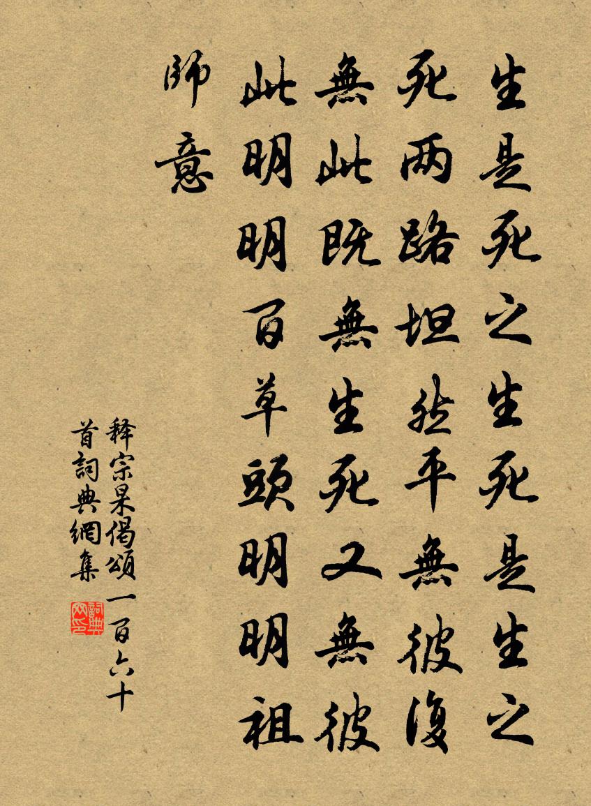 詩詞名句歷史字典書法欣賞書法字典國語詞典說文解字康熙字典古漢語字典標 題 作 者 詩 句 偈頌一百六十首作者:釋宗杲 朝代:宋代偈頌一百六十首原文生是死之生,死是生之死。兩路坦然平,無彼復無此。既無生死,又無彼此。明明百草頭,明明祖師意。詩詞問答問:偈頌一百六十首的作者是誰?答:釋宗杲問:偈頌一百六十首寫於哪個朝代?答:宋代釋宗杲偈頌一百六十首書法欣賞偈頌一百六十首書法作品詩詞推薦答宗人袞羅隱〔唐代〕崑崙水色九般流,飲即神仙憩即休。敢恨守株曾失意,始知緣木更難求。鴒原謾欲均餘力,鶴髮那堪問舊遊。遙望琴丁謂〔宋代〕材妙嶧陽枝,弦調野繭絲。清音飛雉操,雅曲白駒詩。屬意山水際,寄聲鸞鳳時。南薰如在御,忠義必傾思。武侯廟古柏雍陶〔唐代〕密葉四時同一色,高枝千歲對孤峰。此中疑有精靈在,為見盤根似臥龍。送友人南歸王維〔唐代〕萬里春應盡,三江雁亦稀。連天漢水廣,孤客郢城歸。鄖國稻苗秀,楚人菰米肥。懸知倚門望,遙識老萊衣。和張乾三公亭吳儆〔宋代〕三公偉績絕前塵,千古凌煙向月明。剪盡甘棠殺風景,遺民猶記舊亭名。和陶命子韻示津調官吳芾〔宋代〕既有餘力,且親燈火。讀破萬卷,百倍於我。我恨書少,意不自可。汝能雪恥,天亦見假。和正父游榕溪韻張栻〔宋代〕隔岸高低露碧山,眼明使作故園看。直從榕影度輕舫,更傍溪光撫曲欄。鴻雁來希空悵望,梅花開早未初寒。喜君噪雀宋庠〔宋代〕楚雀乘春翐翐飛,蒜頭椒目稟生微。風前莫學驚鷗散,堂上人無海客機。示子孫陸游〔宋代〕茆屋惟須補漏穿,家人衣食亦隨緣。豈容一事相關白,已過傳家十二年。湘中贈范鄖羅隱〔唐代〕丹桂無心彼此諳,二年疏懶共江潭。愁知酒醆終難捨,老覺人情轉不堪。雲外鴛鴦非故舊,眼前膠漆似煙嵐。勞歌送汀州源使君張籍〔唐代〕曾成趙北歸朝計,因拜王門最好官。為郡暫辭雙鳳闕,全家遠過九龍灘。山鄉只有輸蕉戶,水鎮應多養鴨欄。地僻立春後一日作范成大〔宋代〕浮生萬法本悠哉,大笑羲娥轉轂催。官事已邀痴作伴,春風應共老俱來。雲容雪意將詩問,柳眼花心待酒媒。九十和謝方智善王洋〔宋代〕瀟湘十畝弄柔猗,獨染啼斑事已奇。但愛波聲鳴犖确,不須蠅翅避琉璃。莫疑山路崎嶇險,爭脫繩橋性命危。慚愧勸行樂白居易〔唐代〕少年信美何曾久,春日雖遲不再中。歡笑勝愁歌勝哭,請君莫道等頭空。頌古四首釋梵琮〔宋代〕德山托缽話,低頭得人怕。三家村里人,醉後胡廝罵。寄紫閣隱者張籍〔唐代〕紫閣氣沉沉,先生住處深。有人時得見,無路可相尋。夜鹿伴茅屋,秋猿守栗林。唯應采靈藥,更不別營心。庚申元日口號陸游〔宋代〕晚塗初入長生運,新歲仍當大有年。剩與鄉鄰同覓醉,市樓酒賤不論錢。題李賓客舊居李虞〔唐代〕逢時不得致昇平,豈是明君忘姓名。眼暗發枯緣世事,今來無淚哭先生。視旱過雨楊萬里〔宋代〕巳旱何秋雨,無禾始水聲。病民豈天意,致此定誰生。湯爪寧須翦,桑羊可緩烹。小儒空自嘆,得到鳳凰城。滿江紅盧炳〔宋代〕罨畫池亭,對十萬、盈盈粉面。依翠蓋、臨風一曲,霓裳舞遍。亭上人如蓬島客,坐中別有飛瓊伴。占世間、風月名句推薦遲日江山麗,春風花草香。杜甫《絕句二首》 驅雞上樹木,始聞叩柴荊。杜甫《羌村三首·其三》 江上陰雲鎖夢魂,江邊深夜舞劉琨。譚用之《秋宿湘江遇雨》 一春不識西湖面。翠羞紅倦。許棐《後庭花·一春不識西湖面》 宿醉離愁慢髻鬟,六銖衣薄惹輕寒,慵紅悶翠掩青鸞韓偓《浣溪沙·宿醉離愁慢髻鬟》 漢月垂鄉淚,胡沙費馬蹄。岑參《磧西頭送李判官入京》 蕃甲鎖蛇鱗,馬嘶青冢白。李賀《塞下曲》 親愛我,孝何難。親憎我,孝方賢。李毓秀《弟子規·入則孝》 以小人尚民而威,以非所取於民而巧,是傷國之大災也。荀子《荀子·王霸》 方而不割,廉而不劌,直而不肆,光而不耀。老子《老子·德經·第五十八章》