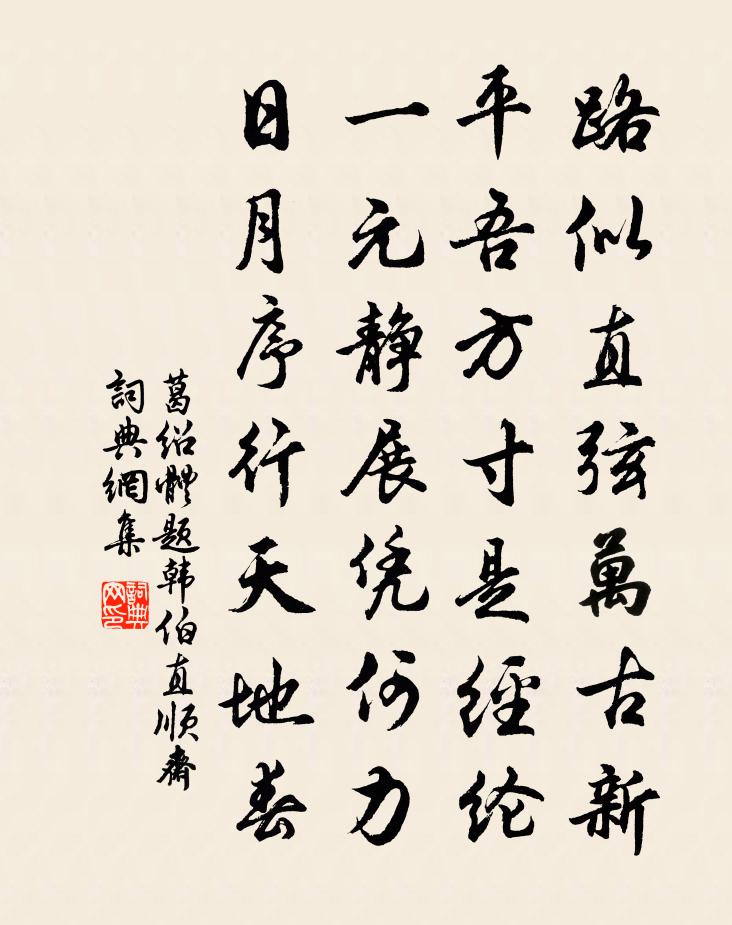 詩詞名句歷史字典書法欣賞書法字典國語詞典說文解字康熙字典古漢語字典標 題 作 者 詩 句 題韓伯直順齋作者:葛紹體 朝代:宋代題韓伯直順齋原文路似直弦萬古新,平吾方寸是經綸。一元靜展憑何力,日月序行天地春。詩詞問答問:題韓伯直順齋的作者是誰?答:葛紹體問:題韓伯直順齋寫於哪個朝代?答:宋代葛紹體題韓伯直順齋書法欣賞題韓伯直順齋書法作品詩詞推薦劍門讀賈公疏詩石石介〔宋代〕劍門駐馬立踟躕,讀盡新篇味有餘。關令多情兼好事,詩名留得賈公疏。寂歷古關道二首李廌〔宋代〕寂歷古關道,曉煙寒未分。愁情滿秋草,歸思隔黃雲。客路自多感,宿酲猶帶醺。蕭蕭倦遊意,況可久離群。頌一百則釋重顯〔宋代〕金烏急,玉兔速,善應何曾有輕觸。展事投機見洞山,跛鼈盲龜入空谷。花簇簇,錦簇簇,南地竹兮北地木。因思相和歌辭。怨詩三首李暇〔唐代〕羅敷初總髻,蕙芳正嬌小。月落始歸船,春眠恆著曉。何處期郎游,小苑花台間。相憶不可見,且復乘月還。別來和資政侍郎湖亭雜詠絕句十首遠山梅堯臣〔宋代〕插雲千萬重,一望不可暫。前嶺與後峰,翠色濃復淡。金剛隨機無盡頌善現起請分第二釋印肅〔宋代〕慈尊護念因,曠大劫相親。眾生皆我子,豈獨出家人。洞仙歌 九日王丹桂〔元代〕風高露冷,又報重陽候。過雨群山倍明秀。正披岩、紅葉接徑黃花,堆錦繡,裊裊清香依舊。凝神望久。思入無何贈蘇趙叟兄弟陸游〔宋代〕君家真德門,才傑生袞袞。托契則甚深,所恨相識晚。攜文數過我,每讀必三反;譬如天廄駒,真是渥窪產。閉門挽故知容州朝請陶公胡文舉〔宋代〕孤松挺挺凜高風,萬語形容不盡中。獨指平塘塘上水,水之清處儼如公。句劉師道〔宋代〕青帝翠華沈物外,素娥孀影吊雲端。攻媿齋樓鑰〔宋代〕聖賢不得見,道散固已久。學者多自賢,鮮肯事師友。顛冥聲利中,悔吝皆自取。動言無媿作,未知果然否。寡過寄華岳孫逸人李商隱〔唐代〕靈岳幾千仞,老松逾百尋。攀崖仍躡壁,啖葉復眠陰。海上呼三島,齋中戲五禽。唯應逢阮籍,長嘯作鸞音。醉太平·春晚辛棄疾〔宋代〕態濃意遠。眉顰笑淺。薄羅衣窄絮風軟。鬢雲欺翠卷。南園花樹春光暖。紅香徑里榆錢滿。欲上鞦韆又驚懶。且歸次韻斯遠三十日見寄趙蕃〔宋代〕窗明內晴景,書味真雋永。長年悔遠遊,紛蠹幾莫整。子猷調固疏,竹可一日無。看渠姿爾瘦,瘦而何用腴。因茲新移竹栽喜於得雨而池中鸂鶒乃以水溢而去戲陸游〔宋代〕霧雨三日天沉陰,西溪水長二尺深。土濡新竹有生意,池滿文禽無住心。竹根蘇活賴此雨,禽亦歸飛戲煙浦。去留林下五吟邵雍〔宋代〕生來未始畫田疇,無歲無時長有秋。隨分杯盤俱是樂,等閒池館便成游。風花雪月千金子,水竹雲山萬戶侯。欲俟絕句六十四首張伯端〔宋代〕玄珠有象逐陽生,陽極陰消漸剝形。十月霜飛丹始熟,恁時神鬼也須驚。為牟德范題石湖遺墨意有未盡復賦五首方回〔宋代〕日長飢雀窺鐺釜,雨過跳蛙上灶爐。莫笑曬書亡玉軸,荊州還識半人無。次韻答張子開教授陳著〔宋代〕兩翁相對五里近,一病同眠八月天。彼此醫治須努力,要成歡醉菊花前。盧竹溪得處士號邑尹有詩盧以其唱及其自和來陳著〔宋代〕夢破邯鄲百念齊,長汀西畔半分溪。護符清出黃冠品,承命有加紫詔泥。徑捷更誰疑晚節,山居有客侈新題。老吾名句推薦忙日苦多閒日少,新愁常續舊愁生。陸游《浣溪沙·和無咎韻》 眾芳搖落獨暄妍,占盡風情向小園。林逋《山園小梅二首》 中年親友難別,絲竹緩離愁。蘇軾《水調歌頭·安石在東海》 曾把芳心深相許。故夢勞詩苦。史達祖《留春令·詠梅花》 人處疾則貴醫。韓非及後人《韓非子·解老》 不教而誅,則刑繁而邪不勝;教而不誅,則奸民不懲。荀子《荀子·富國》 寄言儔侶,莫負廣寒沈醉。文徵明《念奴嬌·中秋對月》 馬蹄踏水亂明霞,醉袖迎風受落花。劉因《山家·馬蹄踏水亂明霞》 西湖到日,重見梅鈿皺。吳文英《瑞龍吟·送梅津》 無一語,對芳尊。安排腸斷到黃昏。秦觀《鷓鴣天·枝上流鶯和淚聞》