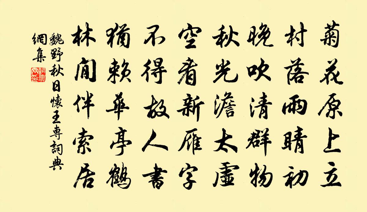 詩詞名句歷史字典書法欣賞書法字典國語詞典說文解字康熙字典古漢語字典標 題 作 者 詩 句 秋日懷王專作者:魏野 朝代:宋代秋日懷王專原文菊花原上立,村落雨睛初。晚吹清群物,秋光澹太虛。空看新雁字,不得故人書。猶賴華亭鶴,林閒伴索居。詩詞問答問:秋日懷王專的作者是誰?答:魏野問:秋日懷王專寫於哪個朝代?答:宋代魏野秋日懷王專書法欣賞秋日懷王專書法作品詩詞推薦山中避難作來鵠〔唐代〕山頭烽火水邊營,鬼哭人悲夜夜聲。唯有碧天無一事,日還西下月還明。和子瞻濠州七絕逍遙堂蘇轍〔宋代〕猖狂戰國古神仙,曳尾泥葎老更安。厭世乘雲人不見,空墳聊復葬衣冠。送壽芳恭三友歸安吉釋行海〔宋代〕此心偏向寂寥難,學至寂寥心自安。楊柳忽驚秋色晚,芭蕉不耐雨聲寒。白雲深處人相別,明月圓時我獨看。極目公居王周〔唐代〕公居門館靜,旅寄萬州城。山共秋煙紫,霜並夜月清。無愁乾酒律,有句入詩評。何必須林下,方馳吏隱名。酬玉汝吳汝弌〔宋代〕日暮雲倒飛,苦雨濕茅屋。奇哉五碎金,青草眠黃犢。天行貴葆真,心骨迥凡俗。一尺 * 花,秋風播芳馥。有懷寄同舍宋祁〔宋代〕不為秋歸人未歸,淮南又見葉丹時。漢皇好少身今老,楚客愁醒啜始醨。夕棧長風驚代馬,曉天團露怨江蘺。夫君沁園春洪咨夔〔宋代〕飲馬鹹池,總轡崑崙,橫鶩九州。慶中興機會,天生山甫,非常事業,天授留侯。左搏龍蛇,右馴虎兕,萬里中原曾無逸郎中名燕居曰和三續社有詩次韻樓鑰〔宋代〕通地通天只箇中,千岐雖別大都同。兩家偶爾流傳盛,一貫臨之內外融。欲境掃開心在我,浮雲散盡月當空。感而買花李壁〔宋代〕風格孤高卻後時,夜來律管已灰吹。無端紅紫偷先發,未見瓊瑤第一枝。送莫內翰五首釋慧空〔宋代〕今者叢林走大聲,不言無眼只無睛。願公善保千鈞重,莫管他家熱椀鳴。游善題寺二首李長者畫像孔武仲〔宋代〕磥砢一居士,娉婷雙少年。對景如無有,著書方浩然。分身聊示現,誰悟此因緣。【正宮】叨叨令周文質〔元代〕自嘆築牆的曾入高宗夢,釣魚的也應飛熊夢。受貧的是個淒涼夢,做官的是個榮華夢。笑煞人也末歌,笑煞人也末簡友人吳則禮〔宋代〕從來老子興不淺,未怕雙鬢渾欲斑。安得希有大勇健,盡尋南徐江上山。鷓鴣天(中秋後一夕宴修成之、富正甫作)郭應祥〔宋代〕萬里澄空沒點雲。素娥依舊駕冰輪。自緣人意看承別,未必清輝減一分。傾白墮,擁紅裙。不知誰主復誰賓。更籌同陳宰黃簿游靈山八首宰雲吾輩可謂忙裡偷閒陳造〔宋代〕一代無為翁,雅志屬丘壑。至今玉雪句,為山鎮不若。生平嵇生龍,何時令威鶴。弔古但三嘆,九原如可作。次韻孫推官朴見寄二首蘇轍〔宋代〕蒙慍未能憂悄悄,得閒時復醉昏昏。知君亦學無言語,豈悟維摩不二門。病懶近來全廢學,宦遊唯是苦思鄉。粗知念奴嬌(次陸務觀見貽念奴嬌韻)韓元吉〔宋代〕湖山泥影,弄晴絲、目送天涯鴻鵠。春水移船花似霧,醉里題詩刻燭。離別經年,相逢猶健,底恨光陰速。壯懷渾題靈仙觀張祁〔宋代〕樓殿起山巔,無塵地自偏。松廊暗雲霧,粉壁艷神仙。名姓藏丹府,衣冠訪洞天。幼輿丘壑質,定合老松泉。家園即事鄭清之〔宋代〕樂天故不憂,作德心逸休。雞蟲笑杜甫,蝴蝶夢莊周。苛政猛於虎,蹊田奪之牛。書傳亂人意,周易在床頭。寄題刁景純藏春塢蘇軾〔宋代〕自首歸來種萬松,待看千尺舞霜風。年拋造物陶甄外,春在先生杖屨中。楊柳長齊低戶暗,櫻桃爛熟滴階紅。何時名句推薦涼葉蕭蕭散雨聲,虛堂淅淅掩霜清。元好問《秋懷》 客子過壕追野馬,將軍韜箭射天狼。李夢陽《秋望》 憑觴靜憶去年秋,桐落故溪頭。晏幾道《訴衷情·憑觴靜憶去年秋》 虛牖傳寒柝,孤燈照絕編。歐陽詹《除夜長安客舍》 野雲萬里無城郭,雨雪紛紛連大漠。李頎《古從軍行》 春風只在園西畔。薺菜花繁胡蝶亂。嚴仁《玉樓春·春思》 滿堂唯有燭花紅,歌且從容,杯且從容。辛棄疾《一剪梅·中秋元月》 朝落暮開空自許,竟無人解知心苦晏幾道《蝶戀花·笑艷秋蓮生綠浦》 居上不寬,為禮不敬,臨喪不哀,吾何以觀之哉?孔子弟子《論語·八佾篇》 見人善,即思齊。縱去遠,以漸躋。李毓秀《弟子規·信》