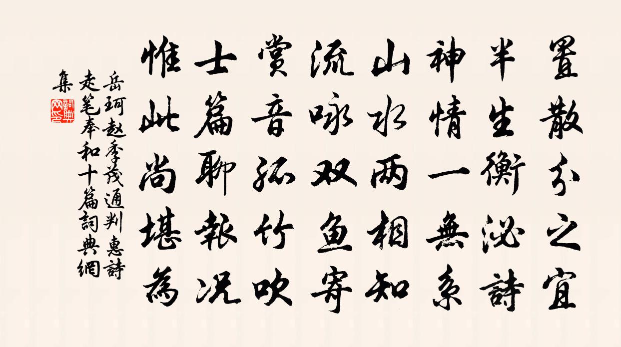 詩詞名句歷史字典書法欣賞書法字典國語詞典說文解字康熙字典古漢語字典標 題 作 者 詩 句 趙季茂通判惠詩走筆奉和十篇作者:岳珂 朝代:宋代原文置散分之宜,半生衡泌詩。神情一無系,山水兩相知。流詠雙魚寄,賞音孤竹吹。士篇聊報況,惟此尚堪為。詩詞問答問:《趙季茂通判惠詩走筆奉和十篇》的作者是誰?答:岳珂問:該詩寫於哪個朝代?答:宋代書法欣賞趙季茂通判惠詩走筆奉和十篇書法作品詩詞推薦出山相贊釋心月〔宋代〕道無修證,入山何為。法無去來,出山何之。黃金屋宅草離離,天上人間說向誰。春日書事張耒〔宋代〕蟲飛絲墮兩悠揚,人意遲遲日共長。春草滿庭門寂寂,數欞窗日掛空堂。杜仲高高九萬相會戴復古〔宋代〕杜癖詩無敵,高髯畫絕綸。笑談能不朽,富貴或成塵。今古多奇事,乾坤幾怪民。相逢不容易,一醉楚江濱。建炎丞相成國呂忠穆公退老堂徐公裕〔宋代〕注意惟聞簡帝心,聊成退老寓登監。放懷綠野岩瞻重,寄傲平泉國念深。海闊水雲和島嶼,時清鐘鼓樂園林。謝公送聰首座兼簡陳寺丞釋鹹傑〔宋代〕十載相從話歲寒,刀山劍樹慣躋攀。風雲會合機輪轉,行看知音笑展顏。和黃魯直效進士作二首歲寒知松柏蘇軾〔宋代〕龍蟄雖高臥,雞鳴不廢時。炎涼徒自變,茂悅兩相知。已負棟樑質,肯為兒女姿。那憂霜貿貿,未喜日遲遲。難與閒居雜詠三十二首悌陳淳〔宋代〕悌以其事兄,溫恭盡乃情。出門惟敬長,內外一於誠。龜堂雨後作陸游〔宋代〕澤國春多雨,龜堂病少悰。雖名舊朝士,其實老耕農。一點葦間火,數聲煙外鍾。詩材故不乏,處處起衰慵。細雨楊萬里〔宋代〕孤悶無言獨倚門,梅花細雨欲黃昏。可憐檐滴不脫灑,點點何曾離舊痕。偈傾一百三十三首釋法薰〔宋代〕三通鼓罷,簇簇上來。諸人減卻多少威光,南山入地三尺。句廖凝〔唐代〕滿汀漚不散,一局黑全輸。獵回千帳雪,探密大河冰。落盡最高樹,始知松柏青。飯僧春嶺蕨,醒酒雪潭魚。風清題京口多景樓劉過〔宋代〕壯觀東南二百州,景於多處卻多愁。江流千古英雄淚,山掩諸公富貴羞。北府只今唯有酒,中原在望莫登樓。西風留客裴夷直〔唐代〕青梅欲熟筍初長,嫩綠新陰繞砌涼。湖館翛然無俗客,白衣居士且匡床。福昌雜詠五首張耒〔宋代〕張翰飄然欲鱠鱸,周南久客意何如。風悲故國荊榛地,日落空城雉兔墟。明月搗衣聞洛杵,故人憑雁寄南書。旅歌菩薩蠻謝逸〔宋代〕縠紋波面浮鸂鶒。蒲芽出水參差碧。滿院落梅香。柳梢初弄黃。衣輕紅袖皺。春困花枝瘦。睡起玉釵橫。隔簾聞曉聞彝叟游展江亭韓維〔宋代〕西亭不覺又春風,弱柳微波四面中。更欲煩君亭下看,海棠枝上淺深紅。臨江仙(將孫生日賦)劉辰翁〔宋代〕二十年前此日,女兄慶我生兒。簪萱弄彩聽孫啼。典衣沽美酒,數待冠昏時。亂後飄零獨在,紫荊墓棘風吹。尊前次韻衡山徐監酒同考府學試八首項安世〔宋代〕祝融峰下築糟邱,此段輸君一流。誤到塵中踏塵土,卻思江上駕漁舟。金剛隨機無盡頌無法可得分第二十二釋印肅〔宋代〕相如玉片瑕,翳眼有空花。投機不施笏,定動豈能差。東歸至衢城十五裡頭五邁〔宋代〕征衣犯火雲,來自長安道。浹背汗淋漓,遵程行數跛。險阻已備嘗,心氣覺如雪。京華紈袴兒,顏色差強好。玉斝名句推薦聲無小而不聞,行無隱而不形。荀子《荀子·勸學》 深林人不知,明月來相照。王維《竹里館》 以近知遠,以一知萬,以微知明。此之謂也。荀子《荀子·非相》 獨上江樓思渺然,月光如水水如天。趙嘏《江樓舊感》 謙謙君子,卑以自牧佚名《易傳·象傳上·謙》 外亂而內整,示飢而實飽,內精而外鈍。姜子牙《六韜·文韜·兵道》 稚子金盆脫曉冰,彩絲穿取當銀鉦。楊萬里《稚子弄冰》 欲把相思說似誰,淺情人不知。晏幾道《長相思·長相思》 我也不登天子船,我也不上長安眠。唐寅《把酒對月歌》 千嬌面、盈盈佇立,無言有淚,斷腸爭忍回顧。柳永《採蓮令·月華收》
