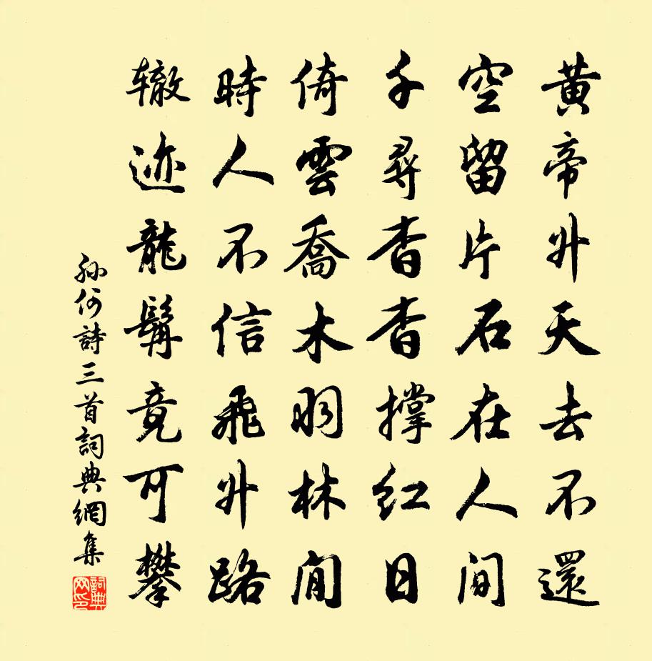 詩詞名句歷史字典書法欣賞書法字典國語詞典說文解字康熙字典古漢語字典標 題 作 者 詩 句 詩三首作者:孫何 朝代:宋代詩三首原文黃帝升天去不還,空留片石在人間。千尋杳杳撐紅日,倚雲喬木羽林閒。時人不信飛升路,轍跡龍髯竟可攀。詩詞問答問:詩三首的作者是誰?答:孫何問:詩三首寫於哪個朝代?答:宋代孫何詩三首書法欣賞詩三首書法作品詩詞推薦蝶戀花 送胡一之上襄陽舒頔〔元代〕鍾阜相催何汲汲。猿鶴休驚,卻上襄陽驛。袖拂峴山碑蘚碧。淒涼淚眼今猶昔。勳業正須年少日。楚雨湘雲,囊錦丞相龐公歸政就第數有新詩傳播都下偶成拙句宋祁〔宋代〕第門行馬護清埃,拂席時時宴具開。安石風流今日是,平津賓客幾人來。幄中謀熟君籌在,川上身閒汝檝回。絕俗句曹緯〔宋代〕自笑無機觸事真。築舍陸游〔宋代〕築舍水雲鄉,蕭然似淨坊。粥鐺菰米滑,羹釜藥苗香。素壁圖嵩華,明窗讀老莊。與人元淡淡,不是故相忘。和韻送逸軒劉民文天祥〔宋代〕少日屠龍事已勞,送人千里發江濤。蓬萊地近風方細,閶闔門開日正高。春里看花須款款,雨中剪韭且陶陶。金吾答王君石遺包虎二軸梅堯臣〔宋代〕老包曰嶽嶽生鼎,二人畫虎通神明。凡為一虎不知價,鉅公貴士珍其名。死來年深搜尋盡,何意好事識尤精。丹楓和沈秀才潘良貴〔宋代〕軟語乾時芻拳美,苦言投俗桂姜辛。山河若欲攄幽憤,盥手焚香讀過秦。仁宗皇帝輓詞五首王珪〔唐代〕忽覺宮車晚,乘雲御帝鄉。空餘群玉殿,不奏萬年觴。白髮孤臣淚,黃塵九陌荒。返虞歌未斷,陵柏已蒼蒼。滄洲白鷺軒五首汪炎昶〔宋代〕遙空幾見落斜行,多在萍汀蓼岸傍。認得從身煙雨態,數聲相伴戛斜陽。重到都門俲轆轤體柴望〔宋代〕兩年不作京華夢,重到湖山事已非。柳外晚風寒食節,花間天氣雨晴時。闌乾獨憑鶯飛去,簾幕低垂燕未歸。欲托武陵春(賡何顯夫小舟有景)盧炳〔宋代〕紅荻黃蘆秋已老,妝點楚江頭。更有吳姬撥小橈。來往自妖嬈。款款艤舟臨別岸,短纜系花梢。料得前身是莫愁。再次韻答程帥高機宜四首陳造〔宋代〕名德誰今挺古風,人嗟汲直合居中。揮毫有物鬼落膽,與世無心雲度空。倚聽金鑾拜新渥,又煩竹馬走群童。貝宮駕自啟聖還內王安石〔宋代〕衣冠原廟漢家儀,羽衛親來此一時。天子當懷霜露感,都人亦嘆鼓簫悲。紛紛瑞氣隨雲漢,漠漠榮光上日旗。塵土踏莎行姜夔〔宋代〕燕燕輕盈,鶯鶯嬌軟。分明又向華胥見。夜長爭得薄情知,春初早被相思染。別後書辭,別時針線。離魂暗逐郎行太常引王惲〔元代〕春風碧水靜林丘。對書史,日優遊。來往更風流。問誰似、東陵故侯。黃陂襟度,曲江譽望,山立看揚休。春釀盡莘夫再用前韻作詩謝余過其居復用韻答之趙蕃〔宋代〕漫道平生風馬牛,也能歷歷記吾州。相從大勝十年讀,肯過輕為一飯留。氣合未知投分晚,腹虛終苦和詩搜。我方周五聲調曲 徵調曲 一庾信〔南北朝〕乾坤以含養覆載。日月以貞明照臨。達人以四海為務。明君以百姓為心。水波瀾者源必遠。樹扶疎者根必深。雲雨和用明梅十三絕胡寅〔宋代〕的皪輕臨宋玉牆,世間顏色盡凡妝。病夫欲作天花觀,無奈時時得暗香。金州冬月陪太守游池(一作林下對雪送僧歸草堂寺)無可〔唐代〕殘臘雪紛紛,林間起送君。苦吟行迥野,投跡向寒雲。絕頂晴多去,幽泉凍不聞。唯應草堂寺,高枕脫人群。唐氏林亭孫邦〔宋代〕華屋沈沈野外居,茂林清蔭繞門閭。移花植果心無事,抱子弄孫歡有餘。閒過西疇觀刈穫,懶尋南郭命巾車。問君名句推薦春江潮水連海平,海上明月共潮生。張若虛《春江花月夜》 溪谷少人民,雪落何霏霏!曹操《苦寒行》 思爾為雛日,高飛背母時。白居易《燕詩示劉叟》 古之君子,過則改之。孟子《孟子·公孫丑章句下·第九節》 至道深微,惟人是弘李大師、李延壽《南史·本紀·卷四》 野橋經雨斷,澗水向田分。劉長卿《碧澗別墅喜皇甫侍御相訪》 我有一罇酒,欲以贈遠人。佚名《舊題蘇武詩 / 別詩四首·其一》 彩線輕纏紅玉臂,小符斜掛綠雲鬟。佳人相見一千年。蘇軾《浣溪沙·端午》 舉目山河異,偏傷周顗情。李白《金陵新亭》 磧里征人三十萬,一時回向月明看。李益《從軍北征》