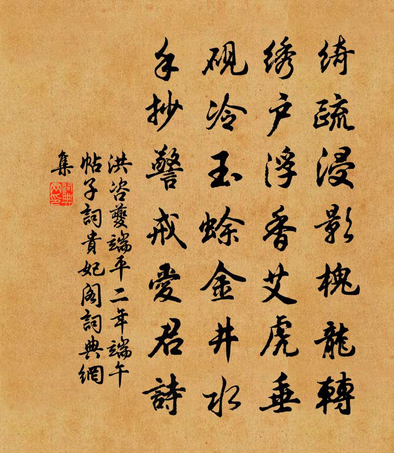 詩詞名句歷史字典書法欣賞書法字典國語詞典說文解字康熙字典古漢語字典標 題 作 者 詩 句 端平二年端午帖子詞貴妃閣作者:洪咨夔 朝代:宋代端平二年端午帖子詞貴妃閣原文綺疏浸影槐龍轉,繡戶浮香艾虎垂。硯冷玉蜍金井水,手抄警戒愛君詩。詩詞問答問:端平二年端午帖子詞貴妃閣的作者是誰?答:洪咨夔問:端平二年端午帖子詞貴妃閣寫於哪個朝代?答:宋代洪咨夔端平二年端午帖子詞貴妃閣書法欣賞端平二年端午帖子詞貴妃閣書法作品詩詞推薦滿庭芳畢大節〔宋代〕井絡儲精,岷江鍾秀,挺生名世真賢。充閭佳氣,非霧亦非煙。況值小春時候,蓂背下、八莢爭妍。餘波在,九華寄行宮監門王以通釋永頤〔宋代〕玉鉤簾外前朝柳,斬鴨闌邊小艷葩。莫道君王不曾問,好收銀鑰護宮花。岳陽樓宴王員外貶長沙(一題作南州有贈)賈至〔唐代〕極浦三春草,高樓萬里心。楚山晴靄碧,湘水暮流深。忽與朝中舊,同為澤畔吟。停杯試北望,還欲淚沾襟。送王判官同提點坑冶梅堯臣〔宋代〕地雖不愛寶,利在與民共。務國不務民,儻有安得用。孟氏美王囿,其說久已誦。聊此陳薄言,忉怛不能重。山田久欲折王安石〔宋代〕山田久欲折,秋至尚求雨。婦女喜秋涼,踏車多笑語。朔雲卷眾水,慘澹吹平楚。橫陂與直塹,疑即沒洲渚。霍霍經鋤陳藻〔宋代〕兩間陋屋牖經鋤,經是心明鋤是蔬。種果始初花可玩,繞牆藤蔓實堪儲。若能棲止身為鳳,何必賓士食要魚。人見次韻邦直見答二首蘇轍〔宋代〕真能一醉逃煩暑,定勝三杯御臘寒。自有詩書供永日,莫將絲竹亂風灘。舞雩何處歸春莫,叩角誰人怨夜漫。聞道醉蓬萊·夷則商七夕和方南山吳文英〔宋代〕望碧天書斷,寶枕香留,淚痕盈袖。誰識秋娘,比行雲纖瘦。象尺熏爐,翠針金縷,記倚床同繡。月瓊梳,冰銷菩薩蠻 題倪徵君惠麓圖 珊瑚網名書題跋卷十王國器〔元代〕秋聲吹碎江南樹。正是瀟湘腸斷處。一片古今愁。荒*水亂流。披圖驚歲月。舊夢何堪說。追憶謾多情。人間無此與國賢良夜歌二首張柬之〔唐代〕柳台臨新堰,樓堞相重複。窈窕鳳凰姝,傾城復傾國。杏間花照灼,樓上月裴回。帶嬌移玉柱,含笑捧金杯。採蓮詞張潮〔唐代〕朝出沙頭日正紅,晚來雲起半江中。賴逢鄰女曾相識,並著蓮舟不畏風。和景仁噴玉潭司馬光〔宋代〕昨朝景氣如暑天,僮僕流汗衣裘單。安知向曉暴風作,一變陽春成大寒。此時結友尋名山,伶俜徒步水石間。棘刺絳州園池范仲淹〔宋代〕絳台使君府,亭閣參園圃。一泉西北來,群峰高下睹。池魚或躍金,水簾長布雨。怪柏鎖蛟虬,醜石斗貙虎。群花止酒楊萬里〔宋代〕止酒先立約,庶幾守得堅。自約復自守,事亦未必然。約語未出口,意已慘不驩。平生死愛酒,愛酒寧棄官。億昔天津感事二十六首邵雍〔宋代〕溪邊閒坐眼慵開,波射長堤勢欲摧。多少水禽文彩好,幾番飛去又飛來。次韻方教采芹亭方岳〔宋代〕終日看山自一奇,寒溪更與月相宜。採芹人去夜岑寂,政是先生得意時。乞貓二首曾幾〔宋代〕春來鼠壤有餘蔬,乞得貓奴亦已無。青蒻裹鹽仍裹茗,煩君為致小於菟。次槐卿舅詠梅二絕喻良能〔宋代〕玉肌冰滑不多枝,半映清池半近籬。寒雪尚遲新月早,橫斜分影到漣漪。題開元天寶遺事范成大〔宋代〕謝蠻舞袖貴妃弦,秦國如花虢國妍。不賞纏頭三百萬,阿姨何處費金錢?王文恭公輓詞二首黃庭堅〔宋代〕先皇憑玉幾,末命寄元勛。賓日行黃道,攀髯上白雲。四時成歲律,五色補天文。不謂堂堂去,今為馬鬣墳。名句推薦東城漸覺風光好。宋祁《玉樓春·春景》 今年海角天涯。蕭蕭兩鬢生華。李清照《清平樂·年年雪裡》 燕子不知人去也,飛認闌乾。韓疁《浪淘沙·莫上玉樓看》 已訝衾枕冷,復見窗戶明。白居易《夜雪》 一條藤徑綠,萬點雪峰晴。李白《冬日歸舊山》 種田人,改習塵市生涯,定為敗路;讀書人,乾與衙門詞訟,便入下流。王永彬《圍爐夜話·第六十則》 寧可枝頭抱香死,何曾吹落北風中。鄭思肖《畫菊》 龍噓氣成雲,雲固弗靈於龍也。韓愈《雜說一·龍說》 小桃無主自開花,菸草茫茫帶曉鴉。戴復古《淮村兵後》 人生在勤,不索何獲。范曄《後漢書·列傳·張衡列傳》