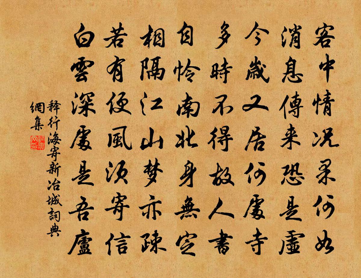 詩詞名句歷史字典書法欣賞書法字典國語詞典說文解字康熙字典古漢語字典標 題 作 者 詩 句 寄新冶城作者:釋行海 朝代:宋代寄新冶城原文客中情況果何如,訊息傳來恐是虛。今歲又居何處寺,多時不得故人書。自憐南北身無定,相隔江山夢亦疎。若有便風須寄信,白雲深處是吾廬。詩詞問答問:寄新冶城的作者是誰?答:釋行海問:寄新冶城寫於哪個朝代?答:宋代釋行海寄新冶城書法欣賞寄新冶城書法作品詩詞推薦次韻蔡學士梅詩劉子翬〔宋代〕梅梢破白香清切,清雨含春不成雪。瑤池仿佛萬妃游,縞裙練帨何鮮潔。凌晨燦爛忽驚眼,客中又過嘉平月。年年虱白玉蟾〔宋代〕褲里無供給,褌頭盡受降。賜之湯沐罷,投置不毛邦。賀新郎(壽陳新淥)趙必〔宋代〕壽酒浮萸菊。記年年、重陽嘉節,開尊華屋。綠鬢朱顏春不改,彼美人兮如玉。有錦繡、珠璣滿腹。戶外紅塵飛不載酒過景仁不園韓維〔宋代〕地勝依危堞,城高若半峰。銜觴驚歲序,候雪仰雲容。不假貓滋竹,須防犬敗松。顧慚文俗吏,游步躡仙蹤。嘉禾百詠水心亭張堯同〔宋代〕波光磨不盡,鏡面絕纖塵。照昨紅亭子,亭這似美人。赴南恩道間和楊體南三首黃公度〔宋代〕身任東西南北居,心安到處即吾廬。窮途俗眼休相薄,沮洳焉知無大魚。逍遙詠宋太宗〔宋代〕青松本不樹蕭條,學士因何智自勞。金水朗然明皎潔,雪山堆積就中高。志心但覓三神藥,凡目難風萬里毫。我獨偈頌五十一首釋道沖〔宋代〕孰名為佛,禮者是誰。設或未辨端倪,看四棱塌地。梅釋行海〔宋代〕上外無花耐歲寒,花魁今古品題難。清香合讓梅為最,陽艷叢中許牡丹。始生之日黎明以職事出郊喻良能〔宋代〕征鞍隨曉色,重露濕衣巾。誰謂懸弧日,翻為執轡辰。野花工笑客,啼鳥故窺人。呼酒澆孤悶,何心作好春。廣濟道中孔武仲〔宋代〕牽確山坡瘦馬行,年朝春色未分明。蔫黃猶是舊時葉,格礫稍聞新歲聲。強涉遠塗非我好,亦逢佳景得心平。寒威歸自越避寇海濱寒食不得祭掃林景熙〔宋代〕持酒無因灑墓松,禽聲花色慘東風。去年此日身為客,及到鄉山又客中。嘲杜鵑白玉蟾〔宋代〕杜宇聲聲蓋自嗟,春殘何事更天涯。不歸則是歸還是,伊是無家或有家。遣興陸游〔宋代〕酒量愁翻減,詩聲老轉低。日高羹馬齒,霜冷駕雞棲。已判功名迕,寧論簿領迷。賴無權入手,軟弱實如泥。自詠遁翁高遁翁〔宋代〕虛名蝸角不攖情,老木棉裘分此生。世事只隨今日過,心田留待後人耕。舊書豈厭從頭看,險路何妨退步行。俯仰閨情效香奩體黃庚〔宋代〕懶向妝檯對鏡鸞,羅衣怯薄正春寒。黃金絡索珊瑚墜,獨立春風看牡丹。賊平賀本路史禽良叔彌忠四首王邁〔宋代〕六十青蚨米五升,兒童滿口說常平。方愁餞火無聊賴,一沐恩波得並生。真佛現身來救度,老天著眼自分明。從今郊祀樂章太祖皇帝位酌獻登歌作大呂宮彰安崔敦詩〔宋代〕一德開墓,百年垂統。中天禘郊,薄海朝貢。寶龜相承,器鼎加重。澤深慶綿,帝復命宋。客游釋文珦〔宋代〕客游忘歲月,長是自調心。野水偏多浪,浮雲易作陰。途窮何用哭,興到即須吟。吟到忘言境,方諧正始音。十月旦讀子美北風吹瘴癘羸老思散策之句初寮朱翌〔宋代〕戰休左觸氏,夢破大槐國。肝膽方一家,燕越非異域。是中路坦平,本自無降陟。乾坤有乾坤,無極復無極。海角名句推薦寺憶曾游處,橋憐再渡時。杜甫《後游》 前年伐月支,城上沒全師。張籍《沒蕃故人》 蠟炬風搖簾不下,竹影半牆如畫。項鴻祚《清平樂·池上納涼》 情往似贈,興來如答。劉勰《文心雕龍·物色》 知而弗為,莫如勿知;親而弗信,莫如勿親。佚名《孔子家語·子路初見》 送子軍中飲,家書醉里題。岑參《磧西頭送李判官入京》 寶馬雕車香滿路。辛棄疾《青玉案·元夕》 誰念遷客歸來,老大傷名節。李綱《六么令·次韻和賀方回金陵懷古鄱陽席上作》 前哲以善人爲寶,不以珠玉爲寶李大師、李延壽《南史·列傳·卷十三》 性孤高似柏,阿嬌金屋。陸容《滿江紅·詠竹》