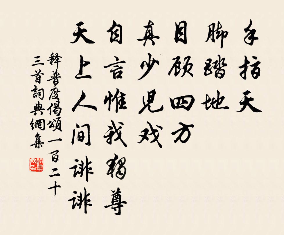 詩詞名句歷史字典書法欣賞書法字典國語詞典說文解字康熙字典古漢語字典標 題 作 者 詩 句 偈頌一百二十三首作者:釋普度 朝代:宋代偈頌一百二十三首原文手指天,腳踏地。目顧四方,真少兒戲。自言惟我獨尊,天上人間誹誹。詩詞問答問:偈頌一百二十三首的作者是誰?答:釋普度問:偈頌一百二十三首寫於哪個朝代?答:宋代釋普度偈頌一百二十三首書法欣賞偈頌一百二十三首書法作品詩詞推薦無弦琴饒延年〔宋代〕月作金徽風作弦,清音不在指端傳。有時彈罷無生曲,露滴松梢鶴未眠。偶作楊簡〔宋代〕處處青山人不識,步步踏著此岩石。妙妙妙妙不可言,可惜可惜大可惜。我夢陸游〔宋代〕我夢入煙海,初日如金熔,赤手騎怒鯨,橫身當渴龍。百日京塵中,詩料頗闕供。此夕復何夕,老狂洗衰慵。夢覺句錢惟演〔宋代〕正好睡時行十里,不交談處飲三杯。猛將吟孟郊〔唐代〕擬膾樓蘭肉,蓄怒時未揚。秋鼙無退聲,夜劍不隱光。虎隊手驅出,豹篇心卷藏。古今皆有言,猛將出北方。禪人並化主寫真求贊釋正覺〔宋代〕其離而入,其微而出。一彈指響樓閣開,身現門門千百億。偈頌一百四十一首釋師範〔宋代〕正覺山前,雙林樹下。弄假像真,弄真像假。臨風哮吼載嵩牛,顧影嘶鳴韓乾馬。觀水嘆二首楊萬里〔宋代〕亂石厄江水,要使水無路。不知石愈密,激得水彌怒。回鋒打別港,勇往遮不住。我舟歷諸灘,閱盡水態度。一聞送僧文光范仲淹〔宋代〕一品山前識,迢迢三十春。多慚畫戟里,重見白雲人。宮詞宋白〔宋代〕春來車駕入西都,父老千人拜路隅。潛問馬嵬端正樹,枝條猶似舊家無。李翰林徐夤〔唐代〕謫下三清列八仙,獲調羹鼎侍龍顏。吟開鎖闥窺天近,醉臥金鑾待詔閒。舊隱不歸劉備國,旅魂長寄謝公山。遺編春秋戰國門魯仲連周曇〔唐代〕昔迸燒牛發戰機,夜奔驚火走燕師。今來躍馬懷驕惰,十萬如無一撮時。贈安成詩謝靈運〔南北朝〕時文前代。徽猷系從。於邁吾子。誕俊華宗。明發迪吉。因心體聰。微言是賞。斯文以崇。次酬胡編校劉黻〔宋代〕癯然同旦過,一飯鼓魚音。樹俗情全懶,忘言道亦深。斜陽浮野馬,明月照棲禽。誰續梅花賦,相期鐵石心。句吳奎〔宋代〕奚車一牛駕,朝馬兩人騎。星子驛別客汪元量〔宋代〕星江彼此系行舟,我向南州君北州。彭澤初歸元亮醉,沙場遠使子卿愁。人生離合花間蝶,世事浮沉柳外鷗。明日酬滑州公儀龍圖見寄歐陽修〔宋代〕畫舫齋前舊菊叢,十年開落任秋風。知君為我留紅◇,猶記栽花白髮翁。南鄉子(烏衣園)黎廷瑞〔宋代〕醉罷黑瑤池。渺渺春雲海嶠歸。畫楝珠簾成昨夢,誰知。百姓人家幾度非。相對語斜暉。腸斷江城柳絮飛。再見玉晚步陳與義〔宋代〕手把古人書,閒讀下廣庭。荒村無車馬,日落雙檜青。曠然神慮靜,濁俗非所寧。逍遙出荊扉,竚立瞻郊坰。須臾柳絮張夫人〔唐代〕靄靄芳春朝,雪絮起青條。或值花同舞,不因風自飄。過尊浮綠醑,拂幌綴紅綃。那用持愁玩,春懷不自聊。名句推薦象龍喚不應,竹龍起行雨張孝祥《湖湘以竹車激水粳稻如雲書此能仁院壁》 舍心腹而順手足羅貫中《三國演義·第二十三回》 秋夜訪秋士,先聞水上音。袁枚《夜過借園見主人坐月下吹笛》 橫戈從百戰,直為銜恩甚。李白《塞下曲六首》 堂上謀臣尊俎,邊頭將士干戈辛棄疾《西江月其六》 恐鳳靴,挑菜歸來,萬一灞橋相見。史達祖《東風第一枝·詠春雪》 遠岫出山催薄暮,細風吹雨弄輕陰。梨花欲謝恐難禁。李清照《浣溪沙·小院閒窗春色深》 始知鎖向金籠聽,不及林間自在啼。歐陽修《畫眉鳥》 法不仁,不可以為法。墨子《墨子·04章 法儀》 瑤草一何碧,春入武陵溪。黃庭堅《水調歌頭·遊覽》