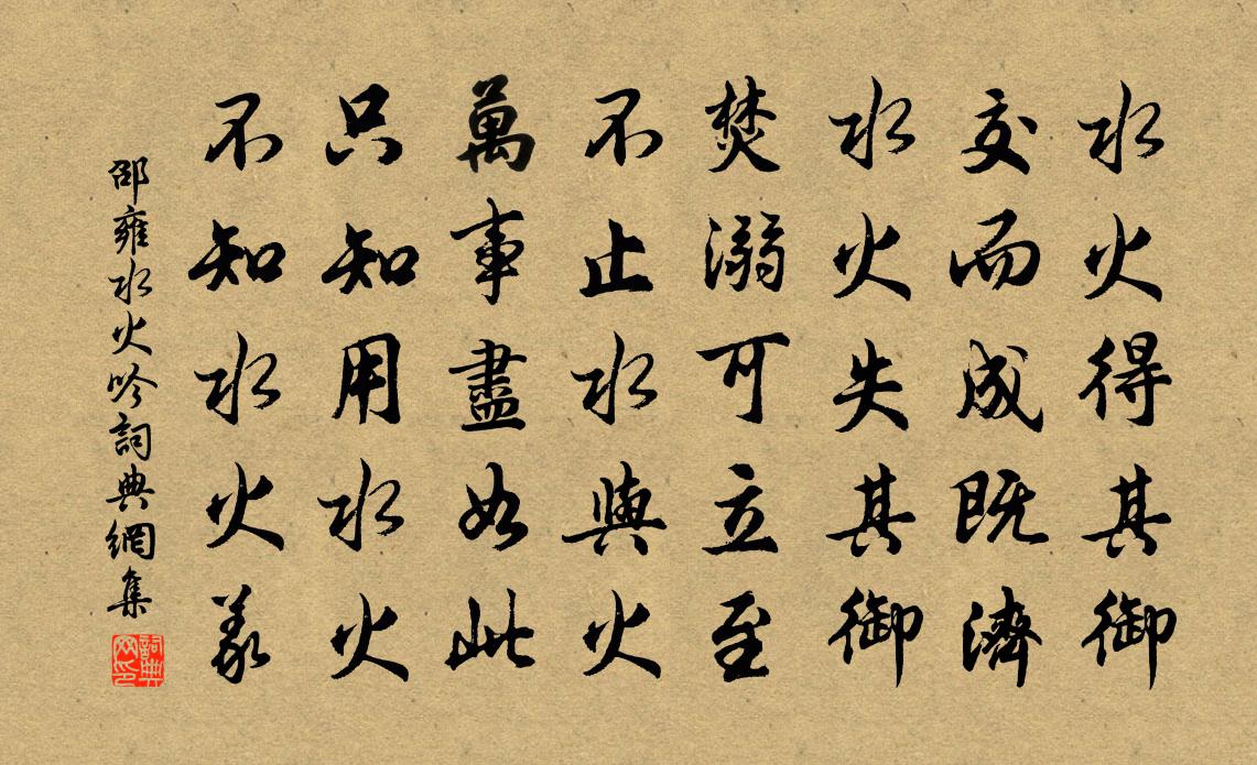 詩詞名句歷史字典書法欣賞書法字典國語詞典說文解字康熙字典古漢語字典標 題 作 者 詩 句 水火吟作者:邵雍 朝代:宋代水火吟原文水火得其御,交而成既濟。水火失其御,焚溺可立至。不止水與火,萬事盡如此。只知用水火,不知水火義。詩詞問答問:水火吟的作者是誰?答:邵雍問:水火吟寫於哪個朝代?答:宋代邵雍水火吟書法欣賞水火吟書法作品詩詞推薦和王石澗儒免韻何夢桂〔宋代〕鴞林何處聽遺音,三嘆斯文試共論。梁木夢非千聖往,瓜丘煙斷六經存。悠悠滄海東流遠,耿耿中天北極尊。吾道三山賀鑄〔宋代〕南朝鳳皇台,置酒昔高會。酒酣望三山,宛在青山外。長喔謫仙吟,如啖鯨鯢鱠。明日信東風,孤帆出其背。荒戍過東坡墳田錫〔元代〕富貴一場春夜夢,文章萬斛冷雲泉。英魂返卻眉山秀,依舊春風草木天。殺駝破瓮佚名〔南北朝〕昔有一人,於瓮中盛谷。駱駝入瓮食谷,首不得出。主人以為憂,無計可施。有一老人來語之,曰:“汝莫憂,吾壬辰恭和御製聞喜宴詩吳泳〔宋代〕清問諄諄許盡言,以書為轍道為軒。鑒觀萬古知成法,條析群疑見大原。櫻苑近頒天上句,燕杯新帶雨邊恩。燃藜雨中高翥〔宋代〕濃雲漠漠雨飛飛,不放東風取次吹。先自一春晴意少,那堪梅子欲黃時。宮詞張公庠〔宋代〕中使傳呼喜復忙,盡催歌舞到昭陽。薰爐煙山隨指見,無奈衣輕不受寒。贈琴士劉伯華蔡沈〔宋代〕公子方年少,絲桐長有名。曲雖仍舊譜,指要發新聲。澗落泉初響,風清月正明。起予千古意,愴惻不勝情。金鰲山善際寺題壁佚名〔宋代〕黃帽當年駕舳艫,東浮鯨海出三吳。中興事業風波惡,好作君王坐右圖。思越人·紫府東風放夜時賀鑄〔宋代〕紫府東風放夜時。步蓮穠李伴人歸。五更鐘動笙歌散,十里月明燈火稀。香苒苒,夢依依。天涯寒盡減春衣。鳳凰懷武夷紅石子二首貫休〔唐代〕常思紅石子,獨自住山椒。窗外猩猩語,爐中奼奼嬌。乳香諸洞滴,地秀眾峰朝。曾見奇人說,煙霞恨太遙。弋者太令人軒氏輓詞樓鑰〔宋代〕緣斷身先隱,年侵鬢未華。死生猶曉夢,富貴更空花。佛祖親提印,兒孫競起家。無因拜靈幾,一奠趙州茶。高士詠廣成子吳筠〔唐代〕廣成臥雲岫,緬邈逾千齡。軒轅來順風,問道修神形。至言發玄理,告以從杳冥。三光入無窮,寂默返太寧。普天樂·西山夕照徐再思〔元代〕晚雲收,夕陽掛,一川楓葉,兩岸蘆花。鷗鷺棲,牛羊下。萬頃波光天圖畫,水晶宮冷浸紅霞。凝煙暮景,轉暉老雨夜宋祁〔宋代〕滯雨兼蘭夕,遙帷更燭房。疾雷方破柱,驚電或生牆。易斷幽衾夢,頻回逐客腸。新歡誰復得,最是楚高唐。又和寒食感懷韓維〔宋代〕絮飛絲墮滿春陰,嘆息流光節物深。雞鞠自喧遊俠地,鶯花空思長年心。寂寥功業看孤劍,淡薄清懷寄素琴。我亦寓建寧推廳送黃子俊陳著〔宋代〕一聆清話覺昏蒙,樽酒何時可再同。最是秋風恃輕薄,易吹羈袂作西東。偈頌八十七首釋慧開〔宋代〕樹凋葉落,體露金風。更問如何,眼瞎耳聾。題山僧水閣施肩吾〔唐代〕山房水閣連空翠,沈沈下有蛟龍睡。老僧趺坐入定時,不知花落黃金地。送端式歸漳州梅堯臣〔宋代〕來居天王都,常夢苦竹溪。乃識高僧趣,不為利物迷。海燕乘華屋,區區竟銜泥。安知矯翼鷗,豈類斷尾雞。性同名句推薦荷葉生時春恨生,荷葉枯時秋恨成。李商隱《暮秋獨游曲江》 莫辭酒味薄,黍地無人耕。杜甫《羌村三首·其三》 易挑錦婦機中字。難得玉人心下事。劉克莊《玉樓春·戲林推》 夫孝者,善繼人之志,善述人之事者也。子思《中庸·第十九章》 幾多情,無處說,落花飛絮清明節。魏承班《漁歌子·柳如眉》 生民之本,要當稼稽而食,桑麻以衣。顏之推《顏氏家訓·治家篇》 紅酥手,黃縢酒,滿城春色宮牆柳。陸游《釵頭鳳·紅酥手》 何期今日酒,忽對故園花。文森《九日》 時不可留,眾不可逆。范曄《後漢書·本紀·光武帝紀上》 惟德動天,無遠弗屆。佚名《尚書·虞書·大禹謨》