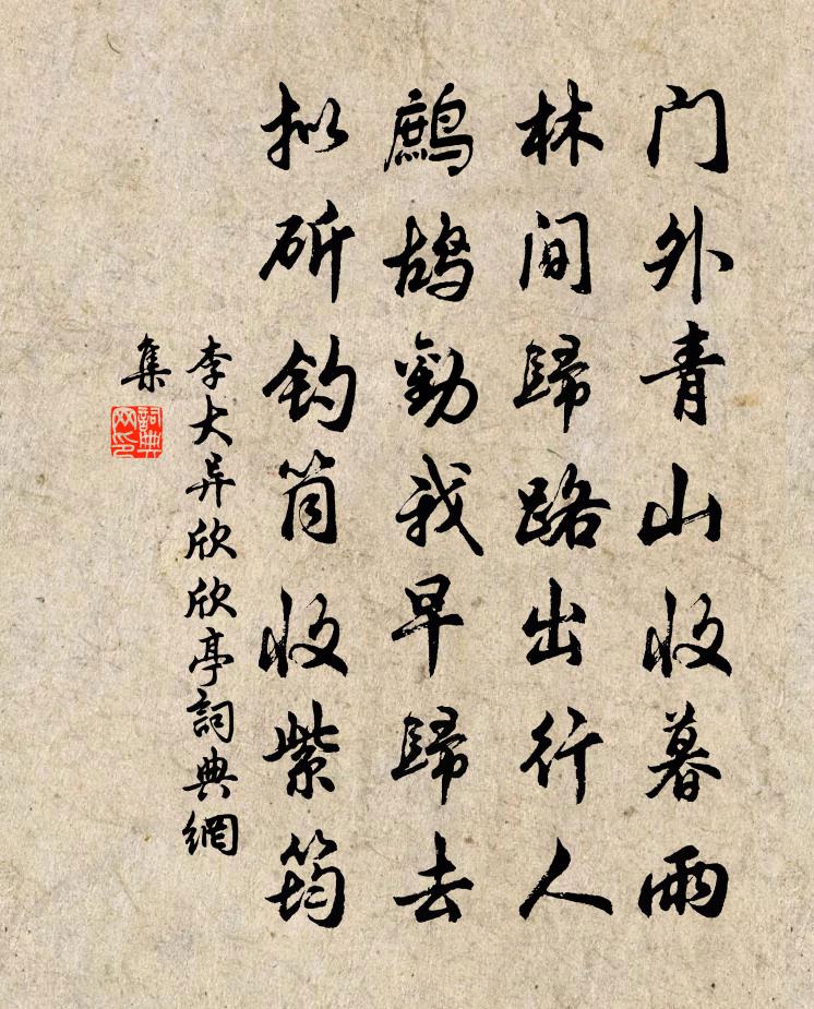詩詞名句歷史字典書法欣賞書法字典國語詞典說文解字康熙字典古漢語字典標 題 作 者 詩 句 欣欣亭作者:李大異 朝代:宋代欣欣亭原文門外青山收暮雨,林間歸路出行人。鷓鴣勸我早歸去,擬斫釣筒收紫筠。詩詞問答問:欣欣亭的作者是誰?答:李大異問:欣欣亭寫於哪個朝代?答:宋代李大異欣欣亭書法欣賞欣欣亭書法作品詩詞推薦桃源憶故人何澹〔宋代〕拍堤芳草隨人去。洞口山無重數。翦朝露成樹。爭晚漁翁住。今人忍聽秦人語。只有花無今古。欲飲仙家壽醑。記離京留題蔣店姚勉〔宋代〕合門傳旨放朝參,歸覲親庭曉整驂。葵藿丹心猶戀戀,五雲繚繞望宮南。望江南/憶江南佚名〔宋代〕清夜老,流水淡疏星。雲母窗前生曉色,梧桐葉上得秋聲。村落一雞鳴。催喚起,帶夢著冠纓。老去悲秋如宋玉,丹青閣王伯大〔宋代〕傑閣岧嶢估碧蒼,菊花時節此持觴。市聲一段隔秋水,橋影半空橫夕陽。挺挺霜筠排壑立,涓涓石溜引山長。人言【黃鐘】人月圓 中秋小酌宋褧〔元代〕紅螺香灩金莖露,清興溢璇霄。玉盤光冷,雲鬢霧濕,丹闕煙銷。□□此夜,明年明月,何似今宵。西風喚我,瑤小疾治藥偶書陸游〔宋代〕御戎虛上策,治疾闕全功。安得如神禹,常行無事中?寄題明月禪院二首釋贊寧〔宋代〕積翠湖心迤邐長,洞台簫寺兩交光。鳥行黑點波濤白,楓葉紅連橘柚黃。人我絕時隈樹石,是非來處接帆檣。如何南海文天祥〔宋代〕朅來南海上,人死亂如麻。腥浪拍心碎,飆風吹鬢華。一山還一水,無國又無家。男子千年志,吾生未有涯。送李屯田子震赴宛丘簽判蘇頌〔宋代〕交遊情分十年餘,從宦差池後會疏。遠塞新歸饒意氣,長年相遇倍勤渠。登朝蚤臥郎官帳,入幕還陪丞相車。咫尺雜體詩 謝光祿莊郊遊江淹〔南北朝〕肅舲出郊際。徙樂逗江陰。翠山方藹藹。青浦正沉沉。涼葉照沙嶼。秋榮冒水潯。風散松架險。雲郁石道深。靜默題未開牡丹孫魴〔唐代〕青苞雖小葉雖疏,貴氣高情便有餘。渾未盛時猶若此,算應開日合何如。尋芳蝶已棲丹檻,襯落苔先染石渠。無限夢還京(大石調)柳永〔宋代〕夜來匆匆飲散,欹枕背燈睡。酒力全輕,醉魂易醒,風揭簾櫳,夢斷披衣重起。悄無寐。追悔當初,繡閣話別太容頌古九首釋梵思〔宋代〕喚應尋常誰不曉,及乎按劍總茫然。分明好個神仙訣,父子從來不許傳。予與子寔避盜同走崆峒予以其年十一月歸侍金利登〔宋代〕聞君歸梅水,經我鳳凰山。走馬來相會,匆匆具杯盤。君行今已反,我歸夢尚寒。回首舊遊處,白骨猶荒煙。昔年蒲氏別墅十詠稻畦文同〔宋代〕決水轉橫渠,交塍畫方罫。秋風報秋熟,滿頃吹罷亞。早春閒居姚合〔唐代〕寂寞日何為,閒居春色遲。驚風起庭雪,寒雨長檐澌。強飲樽中酒,嘲山世外詩。此生仍且在,難與老相離。寄題劉巨卿家六詠蒙齋楊萬里〔宋代〕是心如維斗,萬物所取正。蒙之以微雲,孤光更淵靚。翌日趙守轉以酴醿惠予用前韻謝之鄭剛中〔宋代〕壓架新蕤香未露,先得一枝天所付。既得復持平等心,膽瓶轉施愚翁處。宿蒼谿館劉滄〔唐代〕孤館門開對碧岑,竹窗燈下聽猿吟。巴山夜雨別離夢,秦塞舊山迢遞心。滿地莓苔生近水,幾株楊柳自成陰。空思題總持寺程公許〔宋代〕息台山上最高峰,異事相傳管氏童。檀幣昔嫌三窟撤回,齋盂今喜十方同。中宵急灑竹間雨,萬壑俄喧松下風。欲名句推薦蔞蒿滿地蘆芽短,正是河豚欲上時。蘇軾《惠崇春江晚景 / 惠崇春江曉景》 擇子莫擇父,擇親莫擇鄰。佚名《增廣賢文·下集》 別離在今晨,見爾當何秋。韋應物《送楊氏女》 迴廊遠砌生秋草,夢魂千里青門道。馮延巳《菩薩蠻·迴廊遠砌生秋草》 雲橫秦嶺家何在?雪擁藍關馬不前。韓愈《左遷至藍關示侄孫湘》 離堂思琴瑟,別路繞山川。陳子昂《春夜別友人二首·其一》 君子成人之美,不成人之惡;小人反是。孔子弟子《論語·顏淵篇》 曲則全,枉則直,窪則盈,敝則新,少則得,多則惑。老子《老子·道經·第二十二章》 半床落月蛩聲病,萬里寒雲雁陣遲。曹雪芹《殘菊》 眾芳搖落獨暄妍,占盡風情向小園。林逋《山園小梅二首》