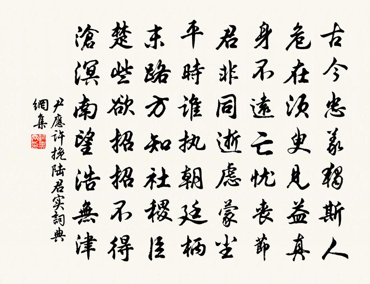 詩詞名句歷史字典書法欣賞書法字典國語詞典說文解字康熙字典古漢語字典標 題 作 者 詩 句 挽陸君實作者:尹應許 朝代:宋代挽陸君實原文古今忠義獨斯人,危在須臾見益真。身不遠亡憂喪節,君非同逝慮蒙塵。平時誰執朝廷柄,末路方知社稷臣。楚些欲招招不得,滄溟南望浩無津。詩詞問答問:挽陸君實的作者是誰?答:尹應許問:挽陸君實寫於哪個朝代?答:宋代尹應許挽陸君實書法欣賞挽陸君實書法作品詩詞推薦題金華徐伯光義聚規約徐元傑〔宋代〕每慨人無善後圖,蕩然家檢亦何疎。眼前漫不知由己,身後誰能管得渠。喜見雙溪今軌範,更綿一脈古詩書。了知聞汪昌宗訃方回〔宋代〕四海舊知識,亂來俱白頭。時聞一人死,身復幾年留。相遇長安市,頻驚□尉侯。胸中皂白事,夢逐杞天休。夏日二首張耒〔宋代〕重雲卷雨過山來,遍灑中田到曉回。錯落晴山移斗極,陰森暗峽宿風雷。佳人夜夜齊紈恨,騷客年年鵯鵊哀。欲見次韻酬孫明復見寄余靖〔宋代〕門外車塵絕,樽前俗慮無。輕身脫羈絆,曳尾得泥塗。出處天真在,炎涼物性殊。寄言欽雅意,相望隔江湖。聞微之江陵臥病以大通中散碧腴垂雲膏寄之因題四韻白居易〔唐代〕已題一帖紅消散,又封一合碧雲英。憑人寄向江陵去,道路迢迢一月程。未必能治江上瘴,且圖遙慰病中情。到時九日偶成呈彥舉家鉉翁〔宋代〕高陽今日是重陽,與客憑高送一觴。白首相逢俱老大,黃花隨地看芬芳。故園三徑都荒了,目斷晴空歸路渺。人生題青紗連二枕秦南運〔宋代〕陰香裝艷入青紗,還與敧眠好事家。夢裡卻成三色雨,枕山不敢斗清華。南園賞花邵雍〔宋代〕三月初三花正開,閒同親舊上春台。尋常不醉此時醉,更醉猶能舉大杯。送封尚書節制興元薛逢〔唐代〕大封茅土鎮褒中,醉出都門殺氣雄。陌上晚花迎虎節,馬前新月學彎弓。珂臨響澗聲先合,旆到春山色更紅。欲識丁未禮部貢院監門次張伯子判院韻兼簡正甫判虞儔〔宋代〕金門誤喜綴朝班,猶自塵勞債未還。曉漏驚催門外鵠,春蠶空想管中斑。群公神遇無全目,老我旁觀只汗顏。安得臨江仙(詔芳亭贈坐客)葉夢得〔宋代〕一醉年年今夜月,酒船聊更同浮。恨無羯鼓打梁州。遺聲猶好在,風景一時留。老去狂歌君勿笑,已拚雙鬢成秋。過五里逕三首楊萬里〔宋代〕瘦日當中暖稍回,冷山未許瘴全開。溪光遠隔深深竹,特地穿簾入轎來。送竹枕與勾希載太博喻良能〔宋代〕誰人彩斲渭川村,有節輪囷秋竹根。割我便便春晝睡,乞君栩栩夢中魂。頌古釋慧空〔宋代〕咄哉王老師,赤窮身也賣。吃些油糍歸,至今被人怪。春雪梅堯臣〔宋代〕臘前望盈尺,奸縮不應乞。萬物及向榮,而反事凝凓。與雨暗爭能,不念傷彼茁。雖然便消釋,終是乖氣律。新陽送人游淮海(一作宿友人池)溫庭筠〔唐代〕背檣燈色暗,宿客夢初成。半夜竹窗雨,滿池荷葉聲。簟涼秋閤思,木落故山情。明發又愁起,桂花溪水清。雲門即事林景熙〔宋代〕最愛林中過客稀,坐分片石澹忘歸。僧閒時與雲來往,鶴老不知城是非。瀟灑山光秋入畫,清寒花氣曉侵衣。一溪詠史詩望夫山胡曾〔唐代〕一上青山便化身,不知何代怨離人。古來節婦皆銷朽,獨爾不為泉下塵。和文與可洋川園池三十首 竹塢蘇軾〔宋代〕晚節先生道轉孤,歲寒惟有竹相娛。粗才杜牧真堪笑,喚作軍中十萬夫。次韻宋尚書山居十五詠竹徑方岳〔宋代〕此君老去更風猷,冰雪生寒我輩流。穿徑略容攜客共,交情疇昔雅相投。名句推薦千錘萬鑿出深山,烈火焚燒若等閒。于謙《石灰吟》 春風江上路,不覺到君家高啟《尋胡隱君》 雲中亂拍祿山舞,風過重巒下笑聲。杜牧《過華清宮絕句三首》 國之興也,天遺之賢人與極言之士;國之亡也,天遺之亂人與善諛之士。呂不韋《呂氏春秋·覽·先識覽》 北風利如劍,布絮不蔽身。白居易《村居苦寒》 明月青山夜,高天白露秋。李嶠《同賦山居七夕》 撫我則後,虐我則仇。佚名《尚書·周書·泰誓》 天寒水鳥自相依,十百為群戲落暉。秦觀《還自廣陵》 南國辛居士,言歸舊竹林孟浩然《都下送辛大之鄂》 亭上秋風,記去年裊裊,曾到吾廬。辛棄疾《漢宮春·會稽秋風亭觀雨》