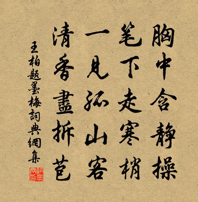 詩詞名句歷史字典書法欣賞書法字典國語詞典說文解字康熙字典古漢語字典標 題 作 者 詩 句 題墨梅作者:王柏 朝代:宋代題墨梅原文胸中含靜操,筆下走寒梢。一見孤山客,清香盡拆苞。詩詞問答問:題墨梅的作者是誰?答:王柏問:題墨梅寫於哪個朝代?答:宋代王柏題墨梅書法欣賞題墨梅書法作品詩詞推薦題耕織圖二十四首奉懿旨撰趙孟頫〔元代〕七月暑尚熾,長日弄機杼。頭蓬不暇梳,揮手汗如雨。嚶嚶時鳥鳴,灼灼紅榴吐。何心娛耳目,往來忘傴僂。織為齊安郡夫人金氏輓詞樓鑰〔宋代〕五子俱英發,尤知仲氏賢。勤明真世濟,廉儉信家傳。別乘徑為郡,高城欲捍邊。版輿俄棄養,事業待他年。春夜高翥〔宋代〕小窗兀兀守更殘,案上詩書亦懶觀。頻翦燭花聽夜雨,盡垂簾影隔春寒。破除夢幻從頭了,安置身心向下看。老子山居雜詩九十首曹勛〔宋代〕寒毬格雖下,春事亦可尋。故園少見之,花葉均來禽。芳蓓暖苞玉,半腮紅淺深。與客屢清賞,只恐風雨侵。追尊皇太后輓詞二首蘇轍〔宋代〕德美鍾岐嶷,榮華倍感傷。一時朝野恨,百世本支長。出祖悲無憾,因山儉有光。他年過嵩洛,望拜裕陵旁。席君從於洛城種金橘今秋始結六實以其四獻開司馬光〔宋代〕物不須多且賞奇,禦寒想見結庵時。江南江北徒虛語,盡信前書是不宜。定風波劉處玄〔元代〕臨醮諸公戒行清。動天感應福非輕。壬潤瓊田農盡喜,秋成。*田珠長豆苗生。要報天恩崇道德,隨緣知足莫相爭頌古四十四首釋法泰〔宋代〕行婆能擊塗毒鼓,遠近聞之皆膽怖。唯有南泉與趙州,同死同生殊不顧。阿呵呵,伎死禪和不奈何。夜宿金庭洞高似孫〔宋代〕夙聞桐柏山,下入金庭洞。五雲所出沒,千翠相迎送。川明芝自燁,夏冷雪猶凍。沙泉注陽穴,水碧孕陰峒。天光對月了殘經贊釋慧開〔宋代〕始見些兒光影,要了未後一段。若是無門拳頭,不打這般鈍漢。秋興八首·其一杜甫〔唐代〕玉露凋傷楓樹林,巫山巫峽氣蕭森。江間波浪兼天涌,塞上風雲接地陰。叢菊兩開他日淚,孤舟一系故園心。寒衣同柳侍郎題侯釗侍郎新昌里(一作酬候釗侍郎春日見寄)盧綸〔唐代〕清源君子居,左右盡圖書。三徑春自足,一瓢歡有餘。庭莎成野席,闌藥是家蔬。幽顯豈殊跡,昔賢徒病諸。乞米高登〔宋代〕臣飢欲死侏儒飽,方朔誰憐是歲星。館下諸生笑豐暖,江頭漁父誚清醒。魯公已作乞米帖,陶令旋尋儲粟瓶。親舊雨晴徐步陳與義〔宋代〕百年幾晴朝,徐步山徑濕。忽悟春已深,鳴禽飛相及。雪消眾綠淨,霧罷群峰立。澗邊千嵁岩,今日何復集。導引佚名〔宋代〕仙宗靈祖,儀氣降中宸。孚宥慶維新。國工熔范成金像,儀炳動威神。玉虛聖境絕纖塵。歡忭洽群倫。導迎雲駕歸宮詞宋白〔宋代〕天玉風清北內聞,東朝相慶冊儲君。春坊曉奏元良瑞,雞戟門西現彩雲。雙楓浦(在瀏陽縣)杜甫〔唐代〕輟棹青楓浦,雙楓舊已摧。自驚衰謝力,不道棟樑材。浪足浮紗帽,皮須截錦苔。江邊地有主,暫借上天回。送杜子卿歸西淮黃庭堅〔宋代〕雪意涔涔滿面風,杜郎馬上若征鴻。樽前談笑我方惜,天外淮山誰與同。行望酒帘沽白蟻,醉吟詩句入丹楓。一時贈方乾處士歌吳融〔唐代〕把筆盡為詩,何人敵夫子?句滿天下口,名聒天下耳。不識朝,不識市,曠逍遙,閒徙倚。一杯酒,無萬事;一葉法喜涇長老請贊釋大觀〔宋代〕有準繩,無捉措。開口錯商量,鐵蒺藜確確。日冷月熱,涇清渭濁,昨夜鳳巢生鸑鷟。名句推薦妾本秦羅敷,玉顏艷名都。李白《陌上桑》 記少年、駿馬走韓盧,掀東郭。辛棄疾《滿江紅·和范先之雪》 遠書歸夢兩悠悠,只有空床敵素秋。李商隱《端居》 人不可以無恥。無恥之恥,無恥矣。孟子《孟子·盡心章句上·第六節》 獨行潭底影,數息樹邊身。賈島《送無可上人》 和大怨,必有餘怨;報怨以德,安可以為善?老子《老子·德經·第七十九章》 客子過壕追野馬,將軍韜箭射天狼。李夢陽《秋望》 天上星河轉,人間簾幕垂。涼生枕簟淚痕滋。李清照《南歌子·天上星河轉》 還怕兩人俱薄命,再緣慳、剩月零風裡。納蘭性德《金縷曲·亡婦忌日有感》 無端嫁得金龜婿,辜負香衾事早朝。李商隱《為有》
