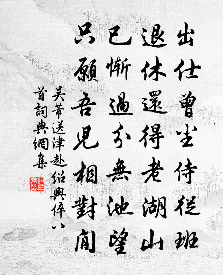 詩詞名句歷史字典書法欣賞書法字典國語詞典說文解字康熙字典古漢語字典標 題 作 者 詩 句 送津赴紹興倅八首作者:吳芾 朝代:宋代送津赴紹興倅八首原文出仕曾塵侍從班,退休還得老湖山。已慚過分無池望,只願吾兒相對閒。詩詞問答問:送津赴紹興倅八首的作者是誰?答:吳芾問:送津赴紹興倅八首寫於哪個朝代?答:宋代吳芾送津赴紹興倅八首書法欣賞送津赴紹興倅八首書法作品詩詞推薦梅市書事陸游〔宋代〕羸馬孤愁不可勝,小詩未忍付瞢騰。一聲客枕江頭雁,數點商船雨外燈。和徐發承議懷歸李復〔宋代〕駸駸長路倦羸驂,搔首飛塵苦戰酣。猿過故山驚曉帳,苔生舊釣暗秋潭。土風膏潤田耕熟,物意清幽井汲甘。一別楓橋寺張師中〔宋代〕吳門多精藍,此寺名尤古。距城七里餘,冠蓋日亭午。斜逕通采香,遠岫對棲虎。岩扉橫野橋,塔影落前浦。霜樓鵲橋仙(和蔡子周)侯置〔宋代〕鶴髮蕭森,玉顏腴潤,養就黃芽金鼎。一區松菊老湘濱,但心遠、何妨人境。袞衣家世,鳴鸞歌舞,到了春冰消盡贈雷怡真白玉蟾〔宋代〕煉就紅鉛不計斤,五湖四海十餘春。今朝杖屨廬山下,雨笠煙蓑一個身。早春桂林殿應詔上官儀〔唐代〕步輦出披香,清歌臨太液。曉樹流鶯滿,春堤芳草積。風光翻露文,雪華上空碧。花蝶來未已,山光暖將夕。言命釋紹嵩〔宋代〕宇宙雙蓬鬢,升沉盡聽他。僧居隨處好,身事逐年多。異國逢佳節,流光等逝波。無謀長委命,言命欲如何。嘉定六年皇后閣春貼子詞五首真德秀〔宋代〕殿稱觴早包,仙班擁翠翹。春來多樂事,人日是明朝。延禧觀趙師秀〔宋代〕寂寞古仙宮,松林常有風。鶴毛兼葉下,井氣與雲同。背日苔磚紫,多年粉壁紅。相傳陶縣令,曾住此山中。十三四用喜雪韻四首吳潛〔宋代〕安西都護肯辭難,不怕亡胡起怨端。節義士知堪作使,神仙人豈戀為官。寒肩此際如樓聳,眩眼當年似席看。百丈頌古三十三首釋師觀〔宋代〕大唐國里無禪師,獨弄單提見也無。茫茫宇宙人無數,幾個男兒是丈夫。湖南漕李革夫被召乃丐歸戴復古〔宋代〕浪說歸朝歸豫章,新居萬柳百花傍。何如表奏明光殿,乞取東湖作醉鄉。金陵驛文天祥〔宋代〕萬里金甌失壯圖,袞衣顛倒落泥塗。空流杜宇聲中血,半脫驪龍頷下須。老去秋風吹我惡,夢回寒月照人孤。千年長歌行王昌齡〔唐代〕曠野饒悲風,颼颼黃蒿草。系馬倚白楊,誰知我懷抱。所是同袍者,相逢盡衰老。北登漢家陵,南望長安道。下有和楊六尚書喜兩弟漢公轉吳興,魯士賜章服,白居易〔唐代〕華筵賀客日紛紛,劍外歡娛洛下聞。朱紱寵光新照地,彤襜喜氣遠凌雲。榮聯花萼詩難和,樂助塤篪酒易醺。感羨言行相顧吳叔達〔唐代〕聖人垂政教,萬古請常傳。立志言為本,修身行乃先。相須寧得闕,相顧在無偏。榮辱當於己,忠貞必動天。大名詠史下曹操七首陳普〔宋代〕濮陽火裹又潼關,幾度鯨牙虎口間。銅雀台前閒極目,驚魂猶繞白狼山。晚春戴復古〔宋代〕春來涉幾日,又到落花時。老面羞看鏡,愁懷強作詩。雨牆蝸篆古,風樹鳥巢危。有客適相過,樽前一局橫。泛舟歸自郡中舟中偶成吳芾〔宋代〕薄日烘雲影,輕風濺浪花。數峰排絕岸,一雁落平沙。冉冉寒生袖,悠悠夢到家。前村誰有酒,試遣小童賒。禪人寫真求贊釋正覺〔宋代〕明回老兔宮,冷下蒼龍窟。諸人名邈兮搖手未然,萬象森羅兮點頭具足。名句推薦行有不得者,皆反求諸己,其身正而天下歸之。孟子《孟子·離婁章句上·第四節》 君子不重則不威,學則不固。主忠信,無友不如己者,過,則勿憚改。孔子弟子《論語·學而篇》 皎皎窗中月,照我室南端。潘安《悼亡詩三首》 念去去,千里煙波,暮靄沉沉楚天闊。柳永《雨霖鈴·寒蟬淒切》 八月長江萬里晴,千帆一道帶風輕。崔季卿《晴江秋望》 花光濃爛柳輕明,酌酒花前送我行。歐陽修《別滁》 巧詐不如拙誠。韓非及後人《韓非子·說林上》 見梨花初帶夜月,海棠半含朝雨。万俟詠《三台·清明應制》 松葉堪為酒,春來釀幾多。張九齡《答陸澧》 聰以知遠,明以察微。司馬遷《史記·五帝本紀》