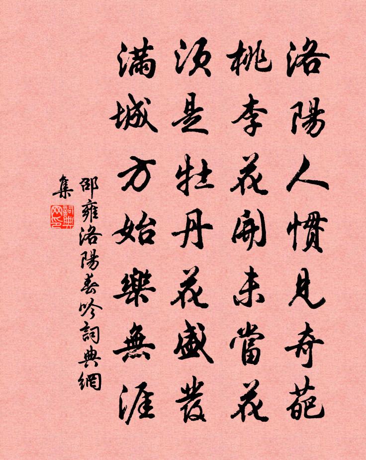 詩詞名句歷史字典書法欣賞書法字典國語詞典說文解字康熙字典古漢語字典標 題 作 者 詩 句 洛陽春吟作者:邵雍 朝代:宋代洛陽春吟原文洛陽人慣見奇葩,桃李花開未當花。須是牡丹花盛發,滿城方始樂無涯。詩詞問答問:洛陽春吟的作者是誰?答:邵雍問:洛陽春吟寫於哪個朝代?答:宋代邵雍洛陽春吟書法欣賞洛陽春吟書法作品詩詞推薦讀書喻良能〔宋代〕一飽無餘事,平生萬卷書。短檠頭雪白,端為惜居諸。喜七兄疾愈二首張耒〔宋代〕南鄰隱士龍虎鼎,東寺比丘堅密身。欲知十室有信處,顧此兩賢非世人。戰勝天魔初起定,寶成丹灶不妨貧。何時谷自亂離之後在西蜀半紀之餘多寓止精舍…四韻以吊之鄭谷〔唐代〕每思聞淨話,雨夜對禪床。未得重相見,秋燈照影堂。孤雲終負約,薄宦轉堪傷。夢繞長松塔,遙焚一炷香。投李益賈島〔唐代〕四十歸燕字,千年外始吟。已將書北嶽,不用比南金。觀競渡(一作劉禹錫詩,一作張建封詩)薛逢〔唐代〕三月三日天清明,楊花繞江啼曉鶯。使君未出郡齋內,江上已聞齊和聲。使君出時皆有引,馬前已被紅旗陣。兩岸醉中得上都親友書以予停俸多時憂…乘酒興詠而報之白居易〔唐代〕頭白醉昏昏,狂歌秋復春。一生耽酒客,五度棄官人。異世陶元亮,前生劉伯倫。臥將琴作枕,行以鍤隨身。歲要次韻分司南京李誠之待制求酒二首蘇轍〔宋代〕春深風雨半相和,節物令人意緒多。中酒何須問賢聖,和詩今尚許羊何。高人不受塵土侵,三年浙江藏何深。久閒送王存之文同〔宋代〕野水冰生薄似綿,短亭梅發大於錢。想君歸到江陽日,欲話今時已去年。金明池·詠寒柳柳如是〔明代〕有悵寒潮,無情殘照,正是蕭蕭南浦。更吹起,霜條孤影,還記得,舊時飛絮。況晚來,煙浪斜陽,見行客,特地元符戊寅與無斁弟卜居緡城東述情晁補之〔宋代〕四海一居何處卜,北窗祗取見家山。要無名利來心曲,便有園林世出間。拙宦莫興三黜嘆,老歸未厭百年閒。先君滿路花 歲日贈馮六等王丹桂〔元代〕節令頻移政,寒暑遞相遷。光陰駒過隙、古今傳。曉來萬戶,歡笑賀新年。誰肯回光照,紺發童顏,漸成衰鬢皤然初到廬山喻良能〔宋代〕匡廬山水甲南州,況是曾經靖節游。眼底總堪供賦詠,新詩不礙細雕鎪。勸孝趙與泌〔宋代〕三復蓼莪思二親,親恩天地無比倫。生我鞠我長育我,出入腹我何艱辛。為人這子欲報德,吳天於我心罔極。順承玉樓春高觀國〔宋代〕多時不踏章台路。依舊東風芳草渡。鶯聲喚起水邊情,日影炙開花上霧。謝娘不信佳期誤。認得馬嘶迎繡戶。今宵晚坐新亭對溪山有感二首錢時〔宋代〕莫道壺中日月長,壺中日月只尋常。乾坤今古無窮妙,是我庭前一草芒。送表兄趙奏院赴南外知宗鄒登龍〔宋代〕御屏往往題名字,朝路彬彬藹薦書。天許留中監邸奏,日求補外得堂除。暫煩龍種司瑤籍,行立鴛班侍玉輿。丙枕別程女元好問〔金代〕芸齋淅淅掩霜寒,別酒青燈語夜闌。生女便知聊寄託,中年尤覺感悲歡。松間小草栽培穩,掌上明珠棄擲難。明日送王伯初通判婺州司馬光〔宋代〕煜熗屏星駕,迢遙婺女區。嵐光晴向背,溪溜暖縈紆。萬室鳴機杼,千艘隘舳艫。若逢耆舊問,能說隱侯無。訪章禪老李中〔唐代〕比尋禪客叩禪機,澄卻心如月在池。松下偶然醒一夢,卻成無語問吾師。此日不再得示同學楊時〔宋代〕此日不再得,頹波注扶桑。躚躚黃小群,毛髮忽已蒼。願言績學子,共惜此日光。術業貴及時,勉之在青陽。行己名句推薦對茲佳品酬佳節,桂拂清風菊帶霜。曹雪芹《螃蟹詠》 輕舟泛月尋溪轉,疑是山陰雪後來李白《東魯門泛舟二首》 耕犁千畝實千箱,力盡筋疲誰復傷?李綱《病牛》 慈母倚門情,遊子行路苦。王冕《墨萱圖·其一》 禮者,人道之極也。荀子《荀子·禮論》 勸君莫惜金縷衣,勸君惜取少年時。杜秋娘《金縷衣》 敬他人,即是敬自己;靠自己,勝於靠他人。王永彬《圍爐夜話·第五七則》 一春略無十日晴,處處浮雲將雨行。汪藻《春日·一春略無十日晴》 潤逼琴絲,寒侵枕障,蟲網吹黏簾竹。周邦彥《大酺·越調春雨》 秋風吹不盡,總是玉關情。李白《子夜吳歌·秋歌》