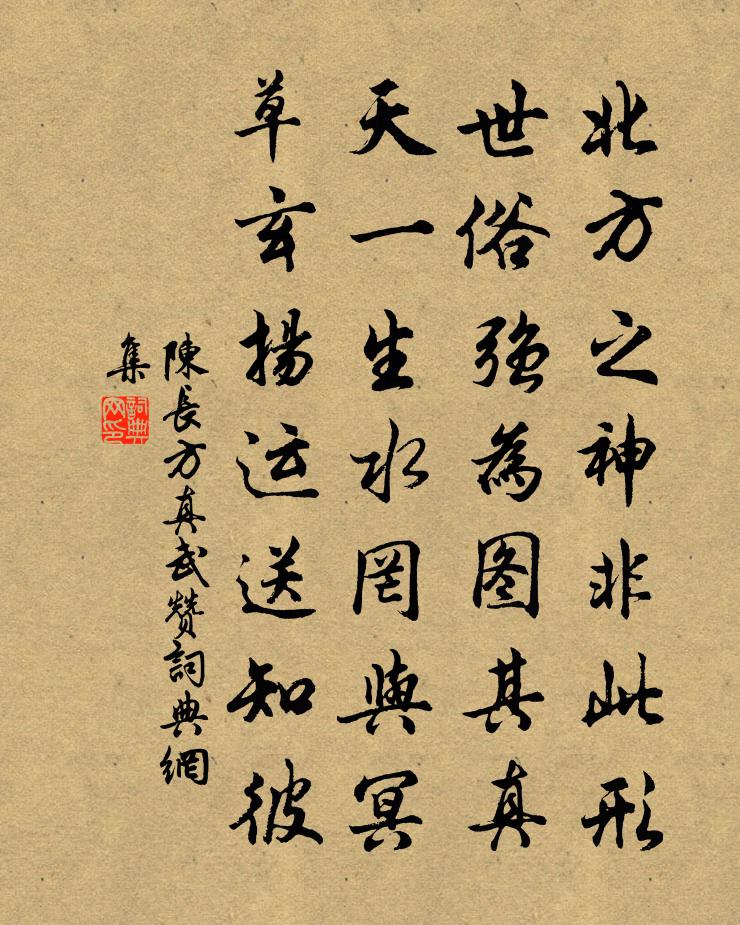 詩詞名句歷史字典書法欣賞書法字典國語詞典說文解字康熙字典古漢語字典標 題 作 者 詩 句 真武贊作者:陳長方 朝代:宋代真武贊原文北方之神非此形,世俗強為圖其真。天一生水罔與冥,草玄揚運送知彼。詩詞問答問:真武贊的作者是誰?答:陳長方問:真武贊寫於哪個朝代?答:宋代陳長方真武贊書法欣賞真武贊書法作品詩詞推薦又號李乂語佚名〔唐代〕李下無蹊徑。錢郎中寫真求贊釋正覺〔宋代〕勝淨明心,混融古今。河漢之氣清秋闊,牛斗之光寒夜深。機歷歷兮錦梭吐緒,道綿綿兮玉線聯針。月漾珊瑚海,廣州石門寺重送李尚赴朝,時兼宗正卿楊衡〔唐代〕象闕趨雲陛,龍宮憩石門。清鐃猶啟路,黃髮重攀轅。藻變朝天服,珠懷委地言。那令蓬蒿客,茲席未離尊。席上如統制傅公韻陳天麟〔宋代〕遲遲春永晝如年,芳草池塘屬惠連。一笑誰雲今易得,四並須信古難全。山圍錦繡將軍樹,雲遏笙歌刺史天。不向丁田家有贈王維〔唐代〕君心尚棲隱,久欲傍歸路。在朝每為言,解印果成趣。晨雞鳴鄰里,群動從所務。農夫行餉田,閨妾起縫素。開軒經鋤陳藻〔宋代〕兩間陋屋牖經鋤,經是心明鋤是蔬。種果始初花可玩,繞牆藤蔓實堪儲。若能棲止身為鳳,何必賓士食要魚。人見過報恩張九成〔宋代〕籃與訪蕭寺,煙暝漲春空。遠樹樓頭綠,殘霞山外紅。昏鍾發林杪,人語殷橋東。回首都無跡,人生真夢中。閨意蒲壽宬〔宋代〕聘得深村玉雪姿,力勝杵臼案齊眉。笑他老大專房寵,猶把房幃比舊時。寄題朱元晦武夷精舍陸游〔宋代〕先生結屋綠岩邊,讀易懸知屢絕編。不用采芝驚世俗,恐人謗道是神僊。玉照堂觀梅二十首張鎡〔宋代〕蕭然日月岸綸巾,春滿幽園肯倦行。一事尚須煩造物,看松微雨看梅晴。暮春王安石〔宋代〕北山吹雨送殘春,南澗朝來綠映人。昨日杏花渾不見,故應隨水到江濱。移松與斯遠同賦趙蕃〔宋代〕垂垂白髮侵,落落青松愛。協趣在山林,移根出蓬艾。中秋與僚佐登江陵郡城觀月張栻〔宋代〕涼意今年早,蟾光七澤多。憑欄共懷古,擁袂獨高歌。風物關山遠,功名歲月過。一樽聊復爾,於此興如何。次韻五詩諭悲秋者樓鑰〔宋代〕黃雲萬頃一時收,喜見高空風露秋。歲事及今將告畢,人生到老盍歸休。固知景物能與感,亦有痴人苦過憂。胸次浴罷陸游〔宋代〕浴罷淡無事,出門隨意行。相如知渴減,叔寶覺神清。新月參差影,殘蟬斷續聲。躊躕遂忘去,風露欲三更。過建劍飲食陳藻〔宋代〕賣食鮮雖少,開酤賤卻醇。不知天地里,何處享全珍。奉和御製奉安聖像禮成夏竦〔宋代〕琳宮胥宇象清都,金閣叢楹閟寶符。昭假仙遊彰胄緒,范鎔真像極規模。精衷欽翼明威顯,近輔恭迎茂典敷。美應重過瓜步山梅堯臣〔宋代〕魏武枕賦忘歸,枕孤軍處山枕頂。雖鄰枕江上浦,鑿岩山巔井。豈是欲勞兵,防患在萌穎。我昔常登臨,徘徊愛晴祭汾陰樂章韓休〔唐代〕於穆浚哲,維清緝熙。肅事昭配,永言孝思。滌濯靜嘉,馨香在茲。神之聽之,用受福釐。宮詞楊皇后〔宋代〕紫禁仙輿詰旦來,旌旗遙倚望春台。不知庭霰今朝下,疑是林花昨夜開。名句推薦人問誰,對以名。吾與我,不分明。李毓秀《弟子規·謹》 當壚秦女,十五語如弦。賀鑄《行路難·縛虎手》 猶憐慣去國,疑是夢還家。盧僎《歲晚還京台望城闕成口號先贈交親》 殘雪樓台,遲日園林。韓疁《高陽台·除夜》 人法地,地法天,天法道,道法自然。老子《老子·道經·第二十五章》 宰相必起於州部,猛將必發於卒伍。韓非及後人《韓非子·顯學》 野戰格鬥死,敗馬號鳴向天悲。李白《戰城南》 帝鄉三千里,杳在碧雲間。李白《登敬亭北二小山余時送客逢崔侍御並登此地》 村北村南,穀雨才耕遍。秀麥連岡桑葉賤。范成大《蝶戀花·春漲一篙添水面》 等閒老去年華促。只有江梅伴幽獨。孫道絢《滴滴金·梅》