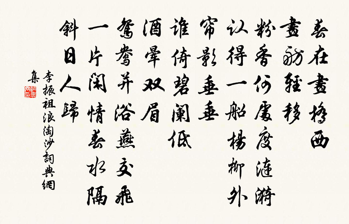 詩詞名句歷史字典書法欣賞書法字典國語詞典說文解字康熙字典古漢語字典標 題 作 者 詩 句 浪淘沙作者:李振祖 朝代:宋代浪淘沙原文春在畫橋西。畫舫輕移。粉香何處度漣漪。認得一船楊柳外,簾影垂垂。誰倚碧闌低。酒暈雙眉。鴛鴦並浴燕交飛。一片閒情春水隔,斜日人歸。詩詞問答問:浪淘沙的作者是誰?答:李振祖問:浪淘沙寫於哪個朝代?答:宋代問:浪淘沙是什麼體裁?答:詞李振祖浪淘沙書法欣賞浪淘沙書法作品詩詞推薦殿前歡·對菊自嘆張養浩〔元代〕可憐秋,一簾疏雨暗西樓,黃花零落重陽後,減盡風流。對黃花人自羞,花依舊,人比黃花瘦。問花不語,花替人初憩河陽郡齋三首宋庠〔宋代〕積晦雲初罷,餘光火尚流。疏桐凋晚日,孤扇避高秋。令尹何妨仕,將軍不必侯。此心機息轉,只好弄群鷗。送河中張胄曹往太原計會回耿湋〔唐代〕北風長至遠,四牡向幽并。衰木新田路,寒蕪故絳城。遙聽邊上信,遠計朔南程。料變當臨事,遙知外國情。偈頌八十五首釋妙倫〔宋代〕德山低頭,夾山點頭。俱胝豎起手指頭,玄沙{上祝下土}破腳指頭,都來不出山僧拄杖頭。一葉落,天下秋。大江東去王寂〔元代〕芳姿蕙態,笑人間、脂粉尋常紅白。大抵風流天也惜,賦與梅魂蘭魄。元相名姝,謝家尤物,縹緲真仙格。朝來酒尉遲杯(雙調)柳永〔宋代〕寵佳麗。算九衢紅粉皆難比。天然嫩臉修蛾,不假施朱描翠。盈盈秋水。恣雅態、欲語先嬌媚。每相逢、月夕花朝野花任希夷〔宋代〕野徑風來陣陣香,名花未省植何方。卻思一卉何能爾,應是春原集眾芳。讀韓退之詩有作晁說之〔宋代〕萬樹殘英委泥滓,柳花成絮獨高飛。自憐織質無人賞,宛轉還從洛浦歸。寄題何戢秀才琬琰堂張耒〔宋代〕幽人築淇澳,不與世相聞。獨攜千卷書,過於骨肉親。辛苦作室堂,插架如魚鱗。時時體不住,一遇千載人。山川效趙學士體成口號十章獻開府太師司馬光〔宋代〕矮帽長條紫縠衫,朱門深靜似重岩。莫言永日渾無事,種藥移花一一監。沁園春方岳〔宋代〕子盍規夫,商丘之木,有樗不才。縱斧斤睥睨,何妨雪立,風煙傲兀,怎問春回。老子似之,倦遊久矣,歸曬漁蓑送呂興元李新〔宋代〕太平天子事東封,洛苑迴鑾訪侍中。自古相門終出相,試持圭璧近重瞳。嘉定巳巳立秋得膈上疾近寒露乃小愈陸游〔宋代〕粥香可愛貧方覺,睡味無窮老始知。要識放翁真受用,大冠長劍只成痴。蟲豸詩。蜘蛛(三首)元稹〔唐代〕蜘蛛天下足,巴蜀就中多。縫隙容長踦,虛空織橫羅。縈纏傷竹柏,吞噬及蟲蛾。為送佳人喜,珠櫳無奈何。網密題僧明惠房秦系〔唐代〕檐前朝暮雨添花,八十真僧飯一麻。入定幾時將出定,不知巢燕污袈裟。晉門再吟周曇〔唐代〕貪泉何處是泉源,只在靈台一點間。必也心源元自有,此泉何必在江山。雕陂黃庭堅〔宋代〕雕陂之水清且泚,屈為印文三百里。呼船載過七十餘,褰裳亂流初不記。竹輿嶇埡山徑涼,僕姑呼婦聲相倚。篁中南園觀梅陸游〔宋代〕幽徑疏籬洗世塵,眼明見此數枝新。橫斜恰受三更月,璀璨先回萬物春。洛浦淩波矜絕態,緱山騎鶴想前身。放翁寄懷林景熙〔宋代〕圖上追三笑,詩中寄七哀。孤棲非絕物,多難亦成才。歲儉米生竹,春寒衣上苔。不知遼海客,化鶴幾時回。代元城吳令暗為答李商隱〔唐代〕背闕歸藩路欲分,水邊風日半西曛。荊王枕上原無夢,莫枉陽台一片雲。名句推薦輦轂繁華事可傷,師師垂老過湖湘劉子翬《汴京紀事》 中心愿,平虜保民安國。宋江《滿江紅·喜遇重陽》 萬里乘雲去復來,隻身東海挾春雷。秋瑾《黃海舟中日人索句並見日俄戰爭地圖》 駐馬橋西,還系舊時芳樹。高觀國《玲瓏四犯·水外輕陰》 應是夜寒凝。惱得梅花睡不成。黃升《南鄉子·冬夜》 江山如有待,花柳自無私。杜甫《後游》 澤國江山入戰圖,生民何計樂樵蘇。曹松《己亥歲二首·僖宗廣明元年》 梅花雪,梨花月,總相思。張惠言《相見歡·年年負卻花期》 鏡中已覺星星誤。人不負春春自負。辛棄疾《玉樓春·風前欲勸春光住》 私勿與人,謀必辟。來俊臣《羅織經·治下卷第三》