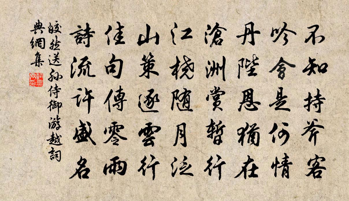 詩詞名句歷史字典書法欣賞書法字典國語詞典說文解字康熙字典古漢語字典標 題 作 者 詩 句 送孫侍御游越作者:皎然 朝代:唐代送孫侍御游越原文不知持斧客,吟會是何情。丹陛恩猶在,滄洲賞暫行。江橈隨月泛,山策逐雲行。佳句傳零雨,詩流許盛名。詩詞問答問:送孫侍御游越的作者是誰?答:皎然問:送孫侍御游越寫於哪個朝代?答:唐代問:送孫侍御游越是什麼體裁?答:五律皎然送孫侍御游越書法欣賞送孫侍御游越書法作品注釋全唐詩:卷819-42詩詞推薦山居十首方岳〔宋代〕我愛山居好,紅稠處處花。支粘居士屩,藤覆野人家。入饌春燒筍,分燈夜作茶。無人共襟抱,煙雨話桑麻。次韻游龍門十絕洪咨夔〔宋代〕稻花秋晚蟹洗手,薺菜春初餳膠牙。築底空山誰辦此,留君只有石邊茶。以王通一所畫小舟橫截春江圖為韓無咎壽章甫〔宋代〕江上春風花滿樹,春水才平舊痕處。何人笑傲一扁舟,橫截千波萬波去。王郎有句藏毫端,寫出生綃半幅間。明窗詠荊軻柳宗元〔唐代〕燕秦不兩立,太子已為虞。千金奉短計,匕首荊卿趨。窮年徇所欲,兵勢且見屠。微言激幽憤,怒目辭燕都。朔風題丹灶四首耿南仲〔宋代〕始知勾漏地,猶勝步兵營,往躅今誰繼,遊人空慕名。乍晴行西村陸游〔宋代〕堤樹叢祠北,煙村古埭南。買魚論木盎,挑薺滿荊籃。積潦經旬月,晴光見二三。農功殊可念,保麥復祈蠶。偈頌一百二十三首釋祖欽〔宋代〕春風蕩蕩,春日熙熙。花開笑面,柳展歡眉。處處呢喃紫燕,聲聲睍睆黃鸝。麻三斤,乾屎橛,庭前柏樹子,遮里八月十四夜月用舊作韻呈諸友魏了翁〔宋代〕鬢髮成宣面欲黎,逢人恥誦故年詩。才看震象應知滿,未睹乾爻已識虧。止處光明渾在里,偶然顯晦謾隨時。風光戀繡衾李太古〔宋代〕桔花風信滿院香。摘青梅、猶自怕嘗。向綠密、紅疏處,喜相逢、飛下一雙。堪憐堪惜還堪愛,喚青衣、推上繡窗蝶戀花佚名〔宋代〕之側,他日將老焉。植梅種竹,以委肖韓,故句尾及之,使知鄙意未嘗一日不在茲亭也長羨東林山下路。萬疊雲山失調名韓維〔宋代〕兄弟對舉杯。和陶歸園田居六首蘇軾〔宋代〕坐倚朱藤杖,行歌紫芝曲。不逢商山翁,見此野老足。願同荔支社,長作雞黍局。教我同光塵,月固不勝燭。霜飆洞山十詠冰壺洞金履祥〔宋代〕洞外煙雲膚寸合,洞中冰雪百尋飛。壺中日月憑誰記,水自飛淙雲自歸。題岐王舊山池石壁白居易〔唐代〕樹深藤老竹迴環,石壁重重錦翠斑。俗客看來猶解愛,忙人到此亦須閒。況當霽景涼風后,如在千岩萬壑間。黃綺春晚書懷陸游〔宋代〕老客天涯心尚孩,惜春直欲挽春回。長繩縱系斜陽住,右手難移故國來。暑近蚊雷先隱轔,雨前螘垤正崔嵬。茹芝同鄧使君賞雙頭牡丹李石〔宋代〕兼金必貴雙,珏玉不獨只。嫣然彼叢生,佳處亦求匹。沙寒水成練,雪洞山立壁。春回小洛陽,淑氣自融液。主人念奴嬌(和人)葛郯〔宋代〕馮夷微怒,被鮫人水府,織成綃縠。何處飛來雙白鷺,點破一溪寒玉。岸柳煙迷,海棠酒困,贏得春眠足。憑欄搔行香子(永州為魏深甫壽)戴復古〔宋代〕萬古崔嵬,二水漣漪。此江山、天下之奇。太平氣象,百姓熙熙。有文章公,經綸手,把州麾。滿斟壽酒,笑捻梅奉餞高尊師如貴道士傳道籙畢歸北海李白〔唐代〕道隱不可見,靈書藏洞天。吾師四萬劫,歷世遞相傳。別杖留青竹,行歌躡紫煙。離心無遠近,長在玉京懸。余在北門時每立春必前索宮中春詞十餘解今逢宋祁〔宋代〕漠漠春從天際來,春旂已在望春台。寒銷嶺上容梅落,暖拂江南放雁回。名句推薦畫閣朱樓盡相望,紅桃綠柳垂檐向。王維《洛陽女兒行》 移風易俗,莫善於樂。孔子及其弟子《孝經·廣要道》 萋萋芳草憶王孫。柳外樓高空斷魂。李重元《憶王孫·春詞》 浪花有意千里雪,桃花無言一隊春。李煜《漁父·浪花有意千里雪》 墉集欺貓鼠,林藏逐雀鸇。徐威《中秋詠懷借杜子美秋日述懷一百韻和寄柳州假鳴桑先生》 雲里帝城雙鳳闕,雨中春樹萬人家。王維《奉和聖制從蓬萊向興慶閣道中留春雨中春望之作應制》 但屈指西風幾時來,又不道流年暗中偷換。蘇軾《洞仙歌·冰肌玉骨》 懷君屬秋夜,散步詠涼天。韋應物《秋夜寄邱員外 / 秋夜寄丘二十二員外》 行善濟人,人遂得以安全,即在我亦為快意王永彬《圍爐夜話·第五一則》 砌下落梅如雪亂,拂了一身還滿。李煜《清平樂·別來春半》