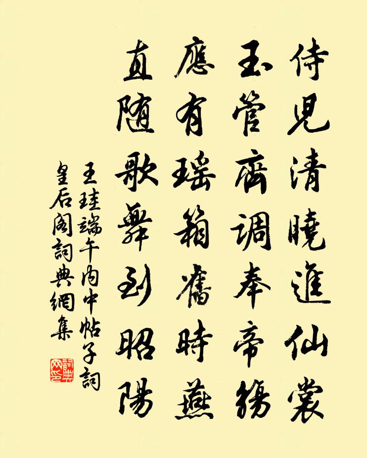 詩詞名句歷史字典書法欣賞書法字典國語詞典說文解字康熙字典古漢語字典標 題 作 者 詩 句 端午內中帖子詞皇后閣作者:王珪 朝代:唐代端午內中帖子詞皇后閣原文侍兒清曉進仙裳,玉管齊調奉帝觴。應有瑤箱舊時燕,直隨歌舞到昭陽。詩詞問答問:端午內中帖子詞皇后閣的作者是誰?答:王珪問:端午內中帖子詞皇后閣寫於哪個朝代?答:唐代王珪端午內中帖子詞皇后閣書法欣賞端午內中帖子詞皇后閣書法作品詩詞推薦雜曲歌辭。十二月樂辭。九月李賀〔唐代〕離宮散螢天似水,竹黃池冷芙蓉死。月綴金鋪光脈脈,涼苑虛庭空澹白。露花飛飛風草草,翠錦斕斑滿層道。雞人秋日即事二首王之道〔宋代〕枕緣睡熟來魂夢,衣為酣頻帶酒痕。多事長紅兼短白,雨余相倚映江村。驛樓韓偓〔唐代〕流雲溶溶水悠悠,故鄉千里空回頭。三更猶憑闌乾月,淚滿關山孤驛樓。訴衷情侯善淵〔元代〕中朝金國聖皇明。有慶賀清平。天元運周甲子,正是好修行。歸真靜,體真清。氣神靈。玄門闡化,太上真風,接夏佚名〔宋代〕赤帝旗迎火雲起,南山石裂吳牛死。繡楹夜夜箔蝦須,象榻重重簟湘水。彤彤日腳燒冰井,古陌塵飛野煙靜。漢帝冬佚名〔宋代〕蒼茫枯磧陰雲滿,古木號空晝光短。雲擁三峰岳色低,冰堅九曲河聲斷。浩汗霜風颳天地,溫泉火井無生意。澤國醉蓬萊趙善括〔宋代〕正槐堂日永,梅雨消塵,麥風搖翠。天祐昌辰,誕中興嘉瑞。秀偉標姿,從容謀斷,笑吐平戎計。漢節歸來,邊塵水調歌/水調佚名〔宋代〕八月秋欲半,後夜月將圓。天潢當日流潤,餘派落人寰。塵掃長淮千里,威振南蠻八郡,梓里繡衣還。芳毓燕山桂鄰僧送桃花王洋〔宋代〕性根本自白環宮,分得天邊一種紅。比似將花供金粟,何如乞米送盧仝。挽張正應陸九淵〔宋代〕海門晝夜吼奔雷,卻立吳山亦壯哉。前殿神仙三島邃,正門閶闔九天開。玉階恭授大官賜,象簡親承御墨回。多少偈頌一百六十首釋宗杲〔宋代〕細不通風,大通車馬。突出當陽,孰辨真假。虛空{左木右覇}柄。無手人能把。破驢蹋倒摘茶輪,草庵卸下瑠璃代人傷往詩 一庾信〔南北朝〕青田松上一黃鶴。相思樹下兩鴛鴦。無事交渠更相失。不及從來莫作雙。採桑子晏幾道〔宋代〕雙螺未學同心綰,已占歌名。月白風清,長倚昭華笛里聲。知音敲盡朱顏改,寂寞時情。一曲離亭,借與青樓忍淚張中丞傳後敘韓愈〔唐代〕 元和二年四月十三日夜,愈與吳郡張籍閱家中舊書,得李翰所為《張巡傳》。翰以文章自名,為此傳頗詳密。寄雪蓬姚監丞蔡槃〔宋代〕憶昔青燈夜對床,斷猿聲里早梅香。一從去棹沖寒雪,幾度憑闌到夕陽。秋思漸於蟬外覺,別愁偏向雁邊長。梧桐淳之九兄以仆承乏制曹幸聯局事向當成績蝟辱宋庠〔宋代〕漢家挈令賴諸公,末至緣何玷選中。馬尾不知書畫誤,鳥聲偏樂友心同。忘憂日接三杯善,軋思時分一溉功。敢向失調名佚名〔宋代〕千絲萬緒惹春風。會昌元年春五絕句。題朗之槐亭白居易〔唐代〕春風可惜無多日,家醞唯殘軟半瓶。猶望君歸同一醉,籃舁早晚入槐亭。為黃龍心禪師燒香頌三首黃庭堅〔宋代〕老師身今七十六,老師心亦七十六。夢中沈卻 * 船,文殊頓足普賢哭。謁文公上方杜甫〔唐代〕野寺隱喬木,山僧高下居。石門日色異,絳氣橫扶疏。窈窕入風磴,長蘆紛卷舒。庭前猛虎臥,遂得文公廬。俯視名句推薦立身之道何窮,只得一敬字,便事事皆整。王永彬《圍爐夜話·第一六三則》 風吹柳花滿店香,吳姬壓酒喚客嘗。李白《金陵酒肆留別》 更把玉鞭雲外指,斷腸春色在江南。韋莊《古離別》 芳草斷煙南浦路,和別淚,看青山朱淑真《江城子·賞春》 醉月頻中聖,迷花不事君李白《贈孟浩然》 迎醉面,暮雪飛花,幾點黛愁山暝。吳文英《十二郎·垂虹橋》 落日熔金,暮雲合璧,人在何處。李清照《永遇樂·落日熔金》 窮且益堅,不墜青雲之志。王勃《滕王閣序》 雨余溪水掠堤平,閒看村童謝晚晴。陸游《觀村童戲溪上》 用人之道,又當以心術為本也。宋濂、王褘《元史·列傳·卷六十八》