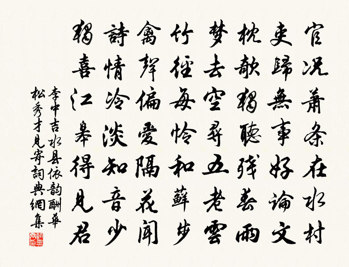 詩詞名句歷史字典書法欣賞書法字典國語詞典說文解字康熙字典古漢語字典標 題 作 者 詩 句 吉水縣依韻酬華松秀才見寄作者:李中 朝代:唐代吉水縣依韻酬華松秀才見寄原文官況蕭條在水村,吏歸無事好論文。枕欹獨聽殘春雨,夢去空尋五老雲。竹徑每憐和蘚步,禽聲偏愛隔花聞。詩情冷淡知音少,獨喜江皋得見君。詩詞問答問:吉水縣依韻酬華松秀才見寄的作者是誰?答:李中問:吉水縣依韻酬華松秀才見寄寫於哪個朝代?答:唐代問:吉水縣依韻酬華松秀才見寄是什麼體裁?答:七律李中吉水縣依韻酬華松秀才見寄書法欣賞吉水縣依韻酬華松秀才見寄書法作品注釋全唐詩:卷749-39詩詞推薦春晴晁端禮〔宋代〕燕子來時,清明過了,桃花亂飄紅雨。倦客淒涼,千里雲山將暮。淚眸回望,人在玉樓深處。向此多應念遠,憑欄矮齋雜詠二十首患瘡華岳〔宋代〕前迴風疾遍身紅,布褐因燒艷火烘。兩腿熱瘡今又發,休將紙被把頭蒙。福岩讀張湖南舊詩張栻〔宋代〕茲游奇絕平生事,只欠瀛仙冰雪姿。元是經行題品地,卻從山際誦新詩。太師魏國史公輓歌詞陸游〔宋代〕道德補天石,勳勞夾日龍。犯顏無不盡,造膝略皆從。歲貢來戎幣,秋防滅塞烽。畫圖麟閣上,猶足折遐沖。布袋和尚贊三首釋智朋〔宋代〕靠布袋作夢,有甚惺惺處。若遇當行家,喚醒吃茶去。又次邦衡族侄長彥司戶韻周必大〔宋代〕聖世恩榮盛孝章,北窗自欲傲羲皇。通家喜燕雞豚社,治郡愁親雁鶩行。陌上花開人鬥草,瓮頭酒熟客傳觴。及時初夏即事楊萬里〔宋代〕旋作東陂已水聲,才經急雨恰新晴。提壺醒眼看人醉,布穀催農不自耕。一似老夫堪笑死,萬方口業拙謀生。嘲紅酬周開祖示長調見索詩集張先〔宋代〕辯玉當看破石詩,泥沙有實即山輝。都廛往往無真璞,誤使人憑鼠臘歸。自法雲歸陸游〔宋代〕落日疏林數點鴉,青山闕處是吾家。歸來何事添幽致,小灶燈前自煮茶。盧子俞幼孫晬日陳藻〔宋代〕我與良翁似有緣,命名與述戰龍天。事忙不記垂弧旦,恰到渠家遇晬筵。沅江李氏書堂梅堯臣〔宋代〕船從洞庭來,非賈即遊宦。宦賈事風檣,誰能樂清晏。不如蓄書史,萬古無與間,上觀堯舜仁,下覽魏晉篡。善惡句徐似道〔宋代〕葉從秋後變,色向曉來紅。贈禪客釋道璨〔宋代〕空拳打入長蛇陣,殺氣連雲戰更酣。輥到了無交涉處,牛頭向北馬頭南。念奴嬌(和徐尉游石湖)陳三聘〔宋代〕扁舟此計,問當年、誰與尋盟鷗鳥。許國勛名彝鼎在,風月不妨吟笑。碧草台邊,紅雲溪上,壽杖扶詩老。水浮天宮詞王珪〔唐代〕翠鈿帖靨輕如笑,玉鳳雕釵裊欲飛。拂曉賀春皇帝閣,彩衣金勝近龍衣。慧聚寺楊備〔宋代〕駐錫棲雲石室中,樓台一片畫屏風。禪師道德知多少,不爾山神肯助工。岳州宴別潭州王熊二首張說〔唐代〕絲管清且哀,一曲傾一杯。氣將然諾重,心向友朋開。古木無生意,寒雲若死灰。贈君芳杜草,為植建章台。縉雲寄池陽曾學士釋重顯〔宋代〕山萬重兮水萬枝,堆青流碧冷便宜。算來免得生遙恨,不在詩情在祖師。賦郭步帥歸耕堂曹勛〔宋代〕漢水無波楚岫青,歸來風月久經營。要親稼穡資三徑,已試韜鈐息五兵。賣劍買牛聊適意,揚鞭敲{革登}暫忘情吳府君輓詩魏了翁〔宋代〕篤信寧違俗,徐行不競時。與人交樂易,處世事平夷。甚矣古常者,傷哉今已而。龍山春夜月,長照鳳皇枝。名句推薦天涯靜處無征戰,兵氣銷為日月光。常建《塞下曲四首·其一》 舉杯互敬屠蘇酒,散席分嘗勝利茶。 * 《元旦口占用柳亞子懷人韻》 春心莫共花爭發,一寸相思一寸灰!李商隱《無題·颯颯東風細雨來》 子路,人告之以有過則喜。禹聞善言則拜。孟子《孟子·公孫丑章句上·第八節》 漁舟逐水愛山春,兩岸桃花夾古津。王維《桃源行》 惟有兩行低雁,知人倚、畫樓月。范成大《霜天曉角·梅》 何日功成名遂了,還鄉,醉笑陪公三萬場。蘇軾《南鄉子·和楊元素時移守密州》 今日清明節,園林勝事偏。賈島《清明日園林寄友人》 以小人之慮,度君子之心。劉義慶《世說新語·雅量》 銅盤燭淚已流盡,霏霏涼露沾衣周邦彥《夜飛鵲·河橋送人處》