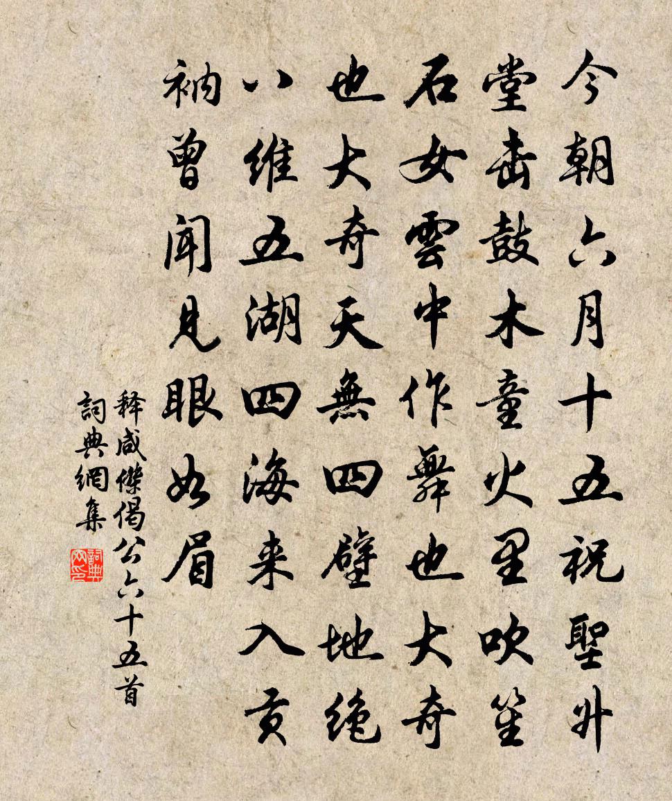 詩詞名句歷史字典書法欣賞書法字典國語詞典說文解字康熙字典古漢語字典標 題 作 者 詩 句 偈公六十五首作者:釋鹹傑 朝代:宋代偈公六十五首原文今朝六月十五,祝聖升堂擊鼓。木童火里吹笙,石女雲中作舞。也大奇,也大奇,天無四壁,地絕八維。五湖四海來入貢,衲曾聞見眼如眉。詩詞問答問:偈公六十五首的作者是誰?答:釋鹹傑問:偈公六十五首寫於哪個朝代?答:宋代釋鹹傑偈公六十五首書法欣賞偈公六十五首書法作品詩詞推薦保全寺江景房〔宋代〕擾擾塵埃白日忙,偶然來謁贊公房。行登峻岭躋攀倦,坐俯清泉笑傲涼。林靜鳥聲酬客語,風來花氣逐人香。此時於潛道中賈似道〔宋代〕數家煙火深村里,幾處牛羊落日中。客久不歸心事遠,梧桐葉葉是秋風。挽新昌王明府吉甫林表民〔宋代〕不見高人祗自悲,每喔佳句望烏衣。浣花風月參謀去,採藥溪山茂宰歸。萬里險艱頭已白,半生功業夢還非。阿戎次韻子瞻過淮見寄兼簡孫奕職方三首蘇轍〔宋代〕龜山昔同到,松竹故依然。紅印封鹹豉,黃罌分井泉。青天攜杖處,晚日落帆偏。無限相思意,新詩句句傳。送章通判劉克莊〔宋代〕半刺已官尊,常時讀魯論。身居恭叔里,心在晦翁門。貧士來遮路,詩人送出村。君能齊得喪,何必戀華軒。愍農張詠〔宋代〕悠悠世事稱無窮,千靈萬象生虛空。活人性命由百穀,還須著意在耕農。自有奸民逃禁律,農夫倍費耕田力。青巾送從弟道秀別詩鮑照〔南北朝〕參差生密念。躑躅行思悲。悲思戀光景。密念盈歲時。歲時多阻折。光景乏安怡。以此苦風情。日夜驚懸旗。登山聞張逸人訃二首劉應時〔宋代〕梅子黃時麥已愀,野塘高下水交流。小窗聲切哀鴻雁,添我懷人一段愁。題秋塘圖二首陳深〔宋代〕水落秋菰老,夕寒煙樹微。絕為雙白鷺,飛去似知幾。宿甑山韓翃〔唐代〕山中今夜何人,闕下當年近臣。青瑣應須早去,白云何用相親。興元閻蒼舒〔宋代〕褒城之山劃天罅,中有深谷春水生。漢家興王啟鴻業,蕭相治國留英聲。贈江州太平觀道士呂岩〔唐代〕落魄薛高士,年高無白髭。雲中閒臥石,山里冷尋碑。誇我飲大酒,嫌人說小詩。不知甚么漢,一任輩流嗤。送秘閣朱員外知復州徐鉉〔唐代〕景陵山水舊知名,珍重詩人建隼行。未免簿書勞利刃,省貪煙月縱高情。揚雄閣下諸生送,陸羽門前百吏迎。新地金剛隨機無盡頌如理實見分第五釋印肅〔宋代〕華胥夢易惺,盡屬髑髏精。卻將夢說夢,何日得超升。第一溪山陳宓〔宋代〕萬家樓觀巧迴環,紫翠泓澄俯仰間。莫道七閩無好境,東南第一此家山。賀新郎佚名〔宋代〕四海文章伯。自雪堂人老,有誰當得。餘子紛紛何足數,除是壺中仙客。況奪得、秋光清徹。筆下詩成愁鬼魅,更次韻方德秀鄧深〔宋代〕清風一榻借冰壺,邂逅相逢日與俱。學辯痴龍君有見,詩窮饞犬我何癯。似聞圓覺常開卷,未到方橋欲問途。稍待龜溪市橋見月施樞〔宋代〕樓台疊翠繞清溪,淺澹雲邊月一眉。行到市聲相接處,傍橋燈火未多時。張德夫園亭八詠山堂王炎〔宋代〕四顧盡皋壤,此山何可無。翠嵐侵戶牖,瘦石出江湖。靈運謾著屐,宗文空畫圖。釣鰲真有力,移得一蓬壺。頌古一○一首釋子淳〔宋代〕妙體堂堂相好全,青霄獨步躡金連。千華馴猶慵坐,弊垢襴衫豈肯穿。名句推薦有過必悛,有不善必懼左丘明《國語·楚語·藍尹亹論吳將斃》 人生貴得適意爾,何能羈宦數千里以要名爵!劉義慶《世說新語·識鑒》 王濬樓船下益州,金陵王氣黯然收。劉禹錫《西塞山懷古》 華表月明歸夜鶴,嘆當時、花竹今如此吳文英《金縷歌·陪履齋先生滄浪看梅》 生平未報國,留作忠魂補。楊繼盛《就義詩》 願月常圓,休要暫時缺。趙佶《醉落魄·預賞景龍門追悼明節皇后》 伏久者,飛必高;開先者,謝獨早。陳繼儒《小窗幽記·集醒篇》 胭脂淚,相留醉,幾時重。李煜《相見歡·林花謝了春紅》 離恨做成春夜雨。添得春江,劃地東流去楊炎正《蝶戀花·別范南伯》 關山多雨雪,風水損毛衣。李遠《詠雁》