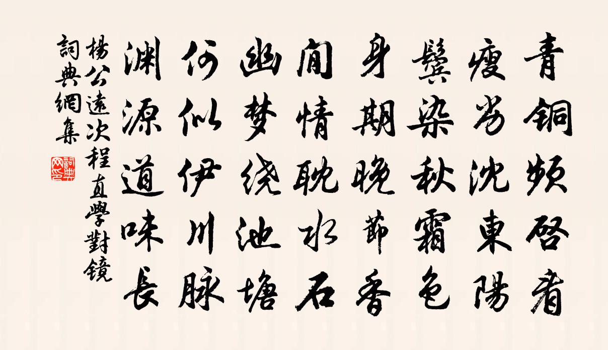 詩詞名句歷史字典書法欣賞書法字典國語詞典說文解字康熙字典古漢語字典標 題 作 者 詩 句 次程直學對鏡作者:楊公遠 朝代:宋代次程直學對鏡原文青銅頻啟看,瘦劣沈東陽。鬢染秋霜色,身期晚節香。閒情耽水石,幽夢繞池塘。何似伊川脈,淵源道味長。詩詞問答問:次程直學對鏡的作者是誰?答:楊公遠問:次程直學對鏡寫於哪個朝代?答:宋代楊公遠次程直學對鏡書法欣賞次程直學對鏡書法作品詩詞推薦野菊司馬光〔宋代〕野菊未嘗種,秋花何處來。羞隨眾草沒,故犯早霜開。寒蝶舞不去,夜蛩吟更哀。幽人自移席,小摘泛清杯。句釋希晝〔宋代〕劍月啼猿苦,江沙濯錦寒。送劉寺丞赴浙西提舉分韻得霄字鹽官縣以海漂魏了翁〔宋代〕君王位三極,五氣鹹宣昭。有一弗余若,引咎自己招。如何圻甸閒,靈胥敢為妖。毋謂一指搐,能使身無聊。是用大風雷雨袁說友〔宋代〕雷風一息到山西,欹側村花不自持。際晚甘霖如倒峽,今年香雪可翻匙。綠秧蘸腳元非揠,白水齊腰不恨遲。浪說風蝶令朱彝尊〔清代〕秋雨疏偏響,秋點夜迸啼。空床取次薄衾攜。未到酒醒時候,已淒淒。寒雁橫天遠,江雲擁樹低。一灣楊柳板橋西偈頌七十八首釋正覺〔宋代〕只個是家風,明明入混融。江光蘆映月,夜色水吞空。攃手懸崖下,分身萬像中。回塗登鳥道,恰恰是神通。贈醫者鄒放秦觀〔宋代〕百工皆聖作,惟醫有書傳。緒餘起人死,妙處實通天。鄒子本淮海,弱齡加討研。岐扁逢卷中,遂知百病先。往歲京師故僚以余退居近畿數賜存問因敘懷自感宋庠〔宋代〕病餘頗厭肉,欣得僧廬蔬。僧窗亦明潔,可以觀我書。弟兄冷相對,因著柏酒醉。酹餘欲拈筆,狀乃爾狼狽。我老幽居歲暮陸游〔宋代〕古井年年浚,荒疇日日犁。刈茅苫鹿屋,插棘護雞棲。閒賴書遮眼,愁須酒到臍。斜陽有常課,緩步上湖堤。資聖寺樓鑰〔宋代〕野溪清淺度危橋,徑策枯筇上紫霄。曉霧暗蒸山寺雨,松風深隱海門潮。浮杯水漲人何在,洗缽池清意已消。又上走筆和曾無逸掌故約觀玉照堂梅詩六首張鎡〔宋代〕才晴便是看花時,自看何如與客期。亦有數篇花下句,苦無風味怕人知。中秋雨作中夜月明科方叔留寓齋宿酒闌隨水縱陳文蔚〔宋代〕瓊樓玉宇不勝秋,把酒臨風味轉優。雲雨自為朝暮變,歌詩不盡古今愁。誰知明月天心到,卻有佳賓水際留。無限和實之讀邸報四首劉克莊〔宋代〕一抨初駭聽,雙淚謾求哀。極口誣賢者,甘心譽彼哉。早知豺不食,安用鴆為媒。試問高陽里,迎車幾兩來。閒思陸游〔宋代〕小雨時時作,幽花續續紅。新蟬落庭樹,痴燕集屏風。傍枕拋書卷,臨池下釣筒。閒中有真樂,那得嘆途窮。端午內中帖子詞夫人閣王珪〔唐代〕火雲時節促金刀,旋卷珠簾剪絳綃。天上莫將塵世比,房櫳都未覺炎歊。偈頌一百零二首釋紹曇〔宋代〕丹桂飄庭際,寒蛩語砌陰。聲聲調雅奏,點點簇黃金。盡情拈出,宴樂嘉賓,佛壟雖貧未是貧。郊外利登〔宋代〕春色到江斷,野香涵日嬌。鳥穿芳樹語,人隔遠山樵。挽孫少卿四首陳淳〔宋代〕自拋襴苧列簪紳,便展施為志獲伸。剖竹三衢無警盜,乘軺兩浙蔑冤民。居官清節冰壺凜,到處仁恩雨露春。歷歷姚岩傑佚名〔唐代〕遙望漁舟,不闊尺八。(盧肇)憑闌一嘔,已覺空喉。(姚岩傑)皇太后閣六首蘇軾〔宋代〕寶冊瓊瑤重,新庭松桂香。雪消春未動,碧瓦麗朝陽。名句推薦舞殿冷袖,風雨淒淒。杜牧《阿房宮賦》 青鳥不傳雲外信,丁香空結雨中愁。李璟《攤破浣溪沙·手卷真珠上玉鉤》 關關雎鳩,在河之洲。窈窕淑女,君子好逑。佚名《關雎》 四十年來家國,三千里地山河李煜《破陣子·四十年來家國》 從善如登,從惡如崩。左丘明《國語·周語·劉文公與萇弘欲城周》 白頭空負雪邊春,著意問春春不語。劉鎮《玉樓春·東山探梅》 不信比來長下淚,開箱驗取石榴裙。武則天《如意娘》 哀哀父母,生我勞瘁。佚名《蓼莪》 且樂生前一杯酒,何須身後千載名?李白《行路難三首》 吟懷未許老重陽,霜雪無端入鬢長。序燈《九日吳山宴集值雨次韻》