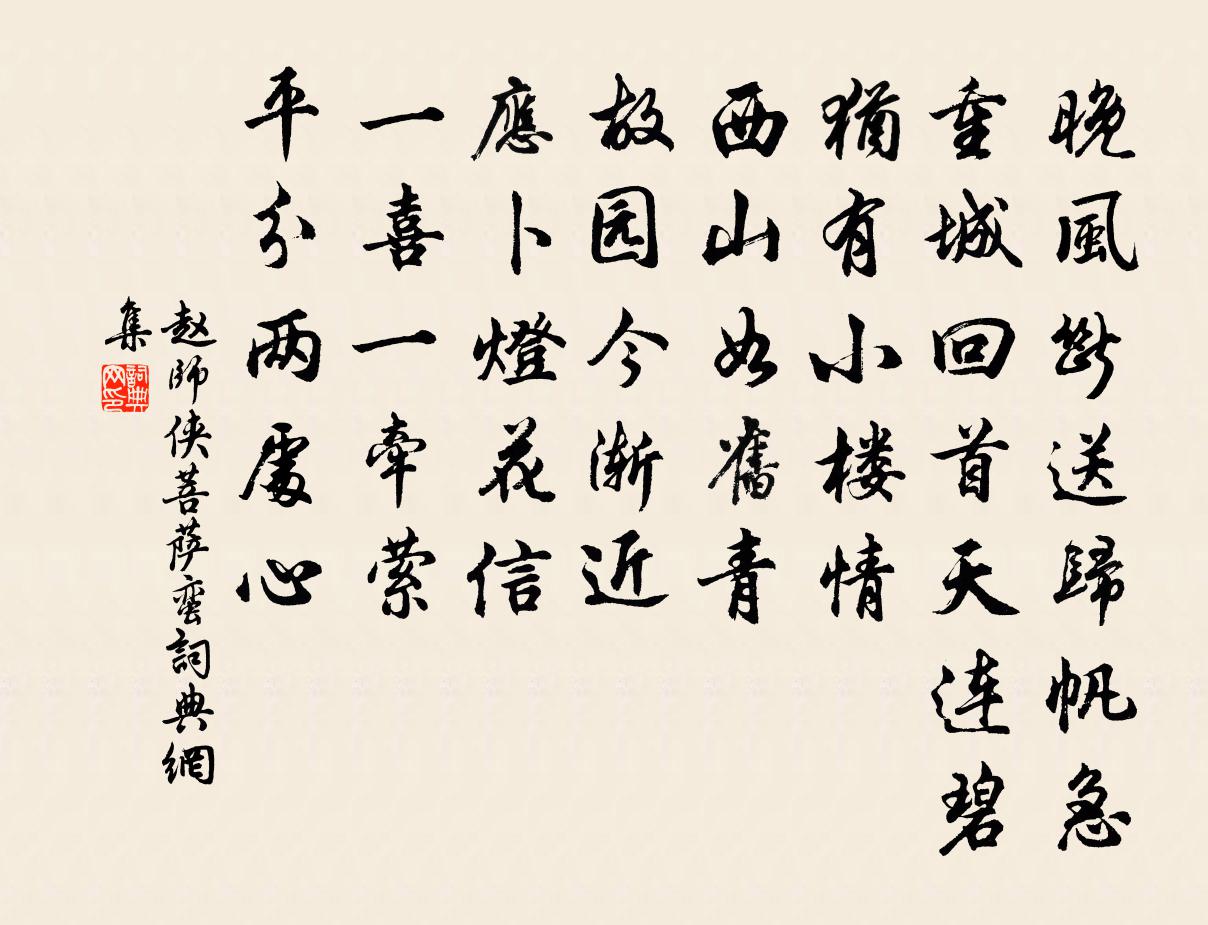 詩詞名句歷史字典書法欣賞書法字典國語詞典說文解字康熙字典古漢語字典標 題 作 者 詩 句 菩薩蠻作者:趙師俠 朝代:宋代菩薩蠻原文晚風斷送歸帆急。重城回首天連碧。猶有小樓情。西山如舊青。故園今漸近。應卜燈花信。一喜一牽縈。平分兩處心。詩詞問答問:菩薩蠻的作者是誰?答:趙師俠問:菩薩蠻寫於哪個朝代?答:宋代問:菩薩蠻是什麼體裁?答:詞趙師俠菩薩蠻書法欣賞菩薩蠻書法作品詩詞推薦寄謝蜀帥表起岩尚書閣學寄贈藥物二首楊萬里〔宋代〕臥雪先生冰雪胸,小迂星履領元戎。草堂衣缽風騷將,花屋笙簫造化工。杜宇催歸波正綠,海棠不睡燭斜紅。遨頭題錦亭范成大〔宋代〕手開花徑錦成窠,浩蕩春風載酒過。來歲遊人應解笑,甘棠終少海棠多。迓漕台感書強至〔宋代〕郡縣齊瞻使者麾,馬蹄行處是霜威。前驅寧免為負弩,高謝未能圖拂衣。顧己自知吾道在,折腰甘被俗人議。古來偈釋方會〔宋代〕雪,雪,處處光輝明皎潔。黃河凍鎖絕纖流,赫日光中須迸裂,那吒頂上吃蒺藜,金剛腳下流出血。蘭釋行海〔宋代〕紫莖綠葉帶春陰,千古湘江一寸心。今日已無君子佩,不如瀟灑在深林。太湖詩包山祠皮日休〔唐代〕白雲最深處,像設盈岩堂。村祭足茗粣,水奠多桃漿。箘竿突古砌,薜荔繃頹牆。爐灰寂不然,風送杉桂香。積雨雪後二首趙蕃〔宋代〕幽徑朝披雪,寒村晚對晴。眼邊多意屬,詩里欠天成。一宦猶賒祿,多田肯借耕。鄰家競春務,客子動覉情。洛下園池邵雍〔宋代〕洛下園池不閉門,洞天休用別尋春。縱游只卻輸閒客,遍入何嘗問主人。更小亭欄花自好,侭荒台榭景才真。虛名方氏臨清堂二首馬廷鸞〔宋代〕陶翁歸計已成遲,未折腰前好賦詩。到底尚稱千載士,高人拈向此中題。子寶東歸以嚶其鳴矣求友聲為韻作古詩七章寬孫應時〔宋代〕一年三送君,到家能幾程。白雲耿我懷,更想啼孩嬰。過門道無恙,憂端幸少平。因之慰猿鶴,無為長怨聲。親仁里居姚合〔唐代〕三年賃舍親仁里,寂寞何曾似在城。飲酒自緣防冷病,尋人多是為閒行。軒車無路通門巷,親友因詩道姓名。自別論語絕句一百首張九成〔宋代〕善勝不於常勝得,無方始向有方求。故知欲使人無訟,莫使情於聽處留。中秋日拜起居表晨渡天津橋即事十六韻獻…兼呈工部劉公杜牧〔唐代〕碧樹康莊內,清川鞏洛間。壇分中嶽頂,城繚大河灣。廣殿含涼靜,深宮積翠閒。樓齊雲漠漠,橋束水潺潺。過雨寄華州馬戴(一作秋中聞馬戴游華山因寄)無可〔唐代〕三峰待秋上,鳥 * 衣巾。猶見無窮景,應非暫往身。水寒仙掌路,山遠華陽人。欲問壇邊月,尋思闕復新。上瀘州楊尚書四十韻程公許〔宋代〕清瑩坡璃水,巉岩石筍峰。孕才供世用,有道致時雍。閥閱宋清節,源流唐靖恭。異時先太史,司匭事光宗。忠憤自詒陸游〔宋代〕愈老愈知生有涯,此時一念不容差。身如病鶴長停料,心似山僧已棄家。高枕時時聞解籜,捲簾片片數飛花。飯余寄贈高知縣宋祁〔宋代〕綠髮如雲艾綬青,弦歌百里久沈英。琴台滯訟投刀釋,月觀雕章夢草成。紫芋蹲鴟編富籍,飛觴浮蟻析朝酲。何當無夢令馬鈺〔元代〕三髻山侗愛笑。好弱歸之一笑。不是我如斯,有個內容欣笑。欣笑。欣笑。真樂自然歡笑。夕望江橋示蕭諮議楊建康主簿詩何遜〔南北朝〕夕鳥已西度。殘霞亦半消。風聲動密竹。水影漾長橋。旅人多憂思。寒江復寂寥。爾情深鞏落。予念返漁樵。何因人之初王應麟〔宋代〕人之初,性本善。性相近,習相遠。苟不教,性乃遷。教之道,貴以專。子不學,非所宜。幼不學,老何為。玉不名句推薦不充詘於富貴,不遑遑於所欲。姚察、姚思廉《梁書·列傳·卷五十》 紅粉當壚弱柳垂,金花臘酒解酴醿。賈至《春思二首》 至樂無樂,至譽無譽。莊子《莊子·外篇·至樂》 不覺新涼似水,相思兩鬢如霜。劉辰翁《西江月·新秋寫興》 淡黃楊柳暗棲鴉。玉人和月摘梅花。賀鑄《減字浣溪沙·樓角初銷一縷霞》 紅樹青山日欲斜,長郊草色綠無涯。歐陽修《豐樂亭遊春·其三》 使人有乍交之歡,不若使人無久處之厭。陳繼儒《小窗幽記·集醒篇》 我醉君復樂,陶然共忘機。李白《下終南山過斛斯山人宿置酒》 秋江帶雨,寒沙縈水,人瞰畫閣愁獨。史達祖《八歸·秋江帶雨》 大丈夫處事,論是非,不論禍福王永彬《圍爐夜話·第二五則》